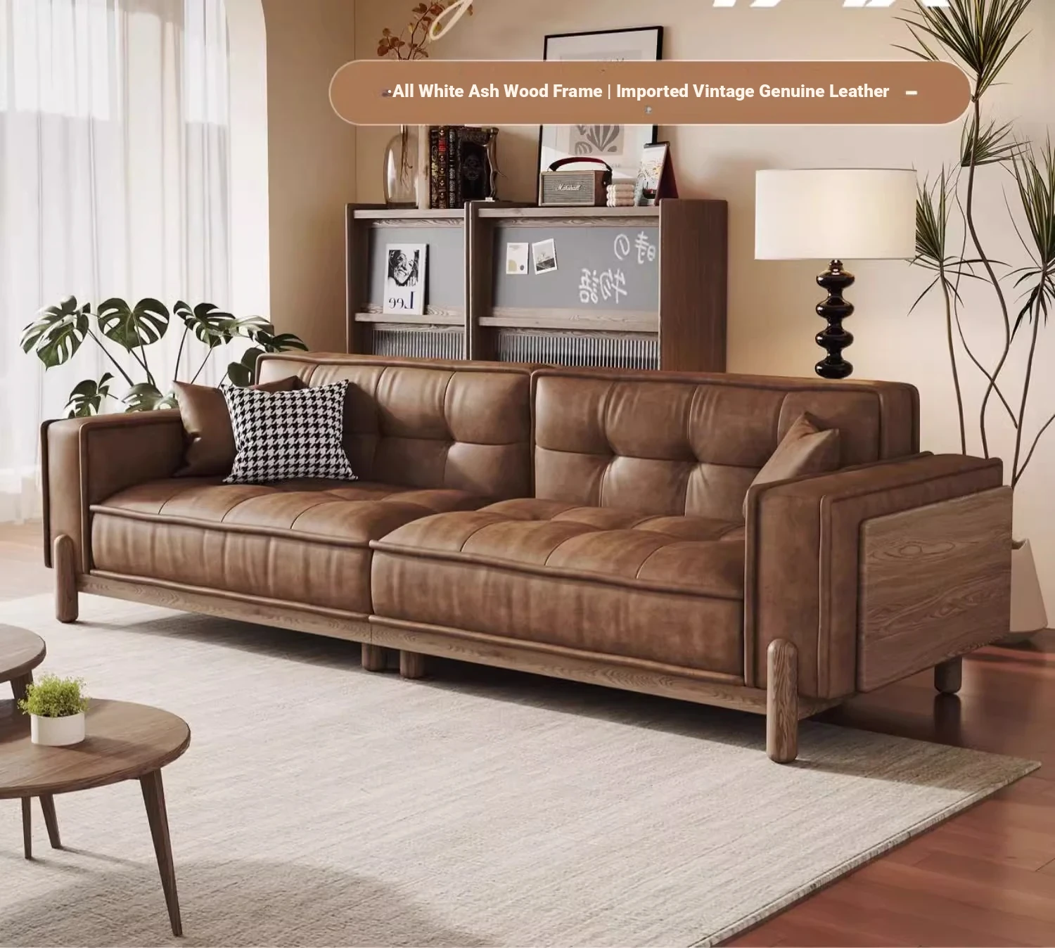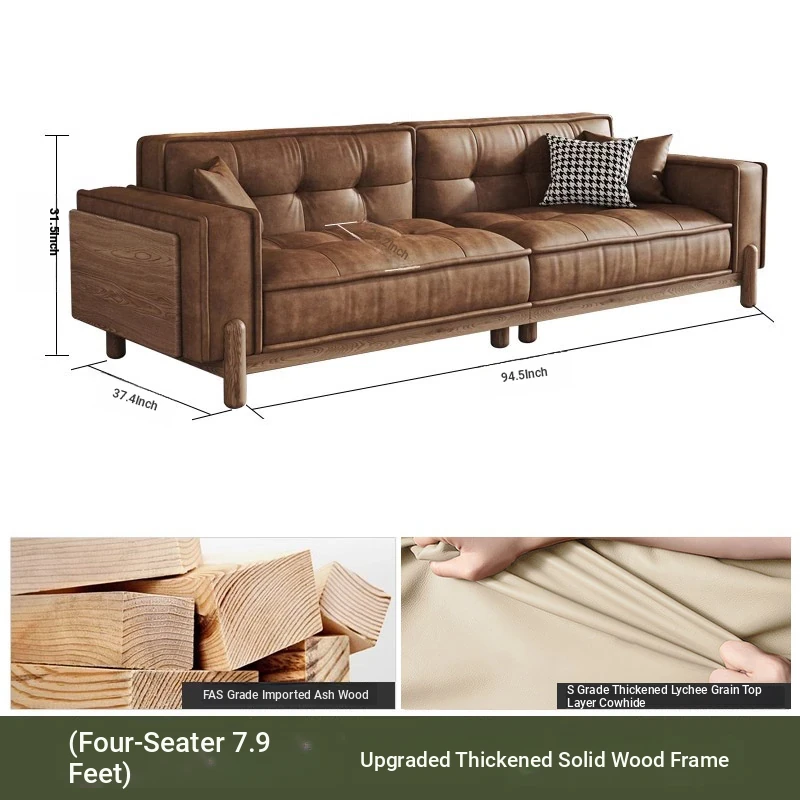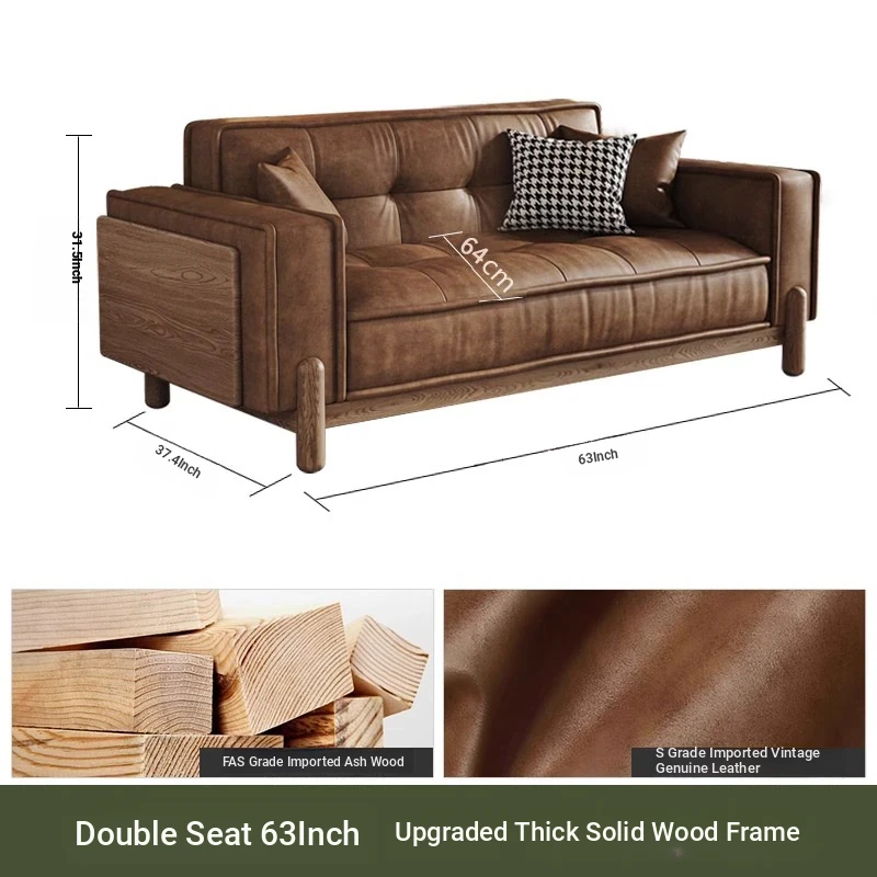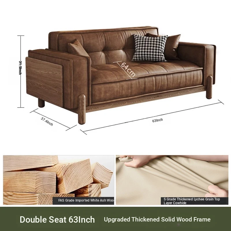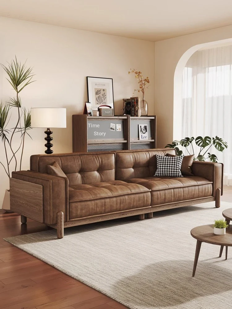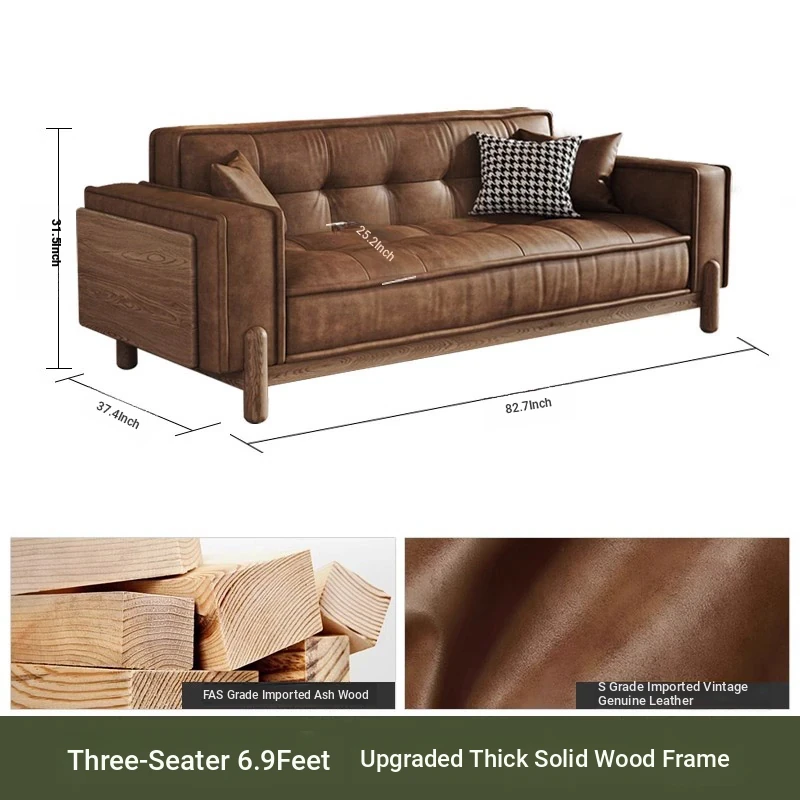 2025 New French Vintage Genuine Leather Sofa for Living Room - Top Grain Cowhide Small Space Sofa with Straight Walnut Solid Wood Design