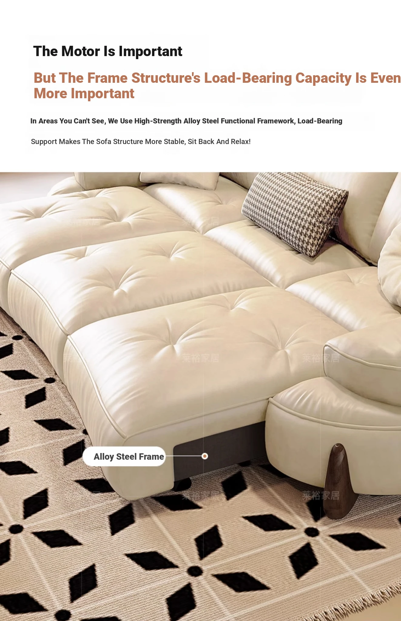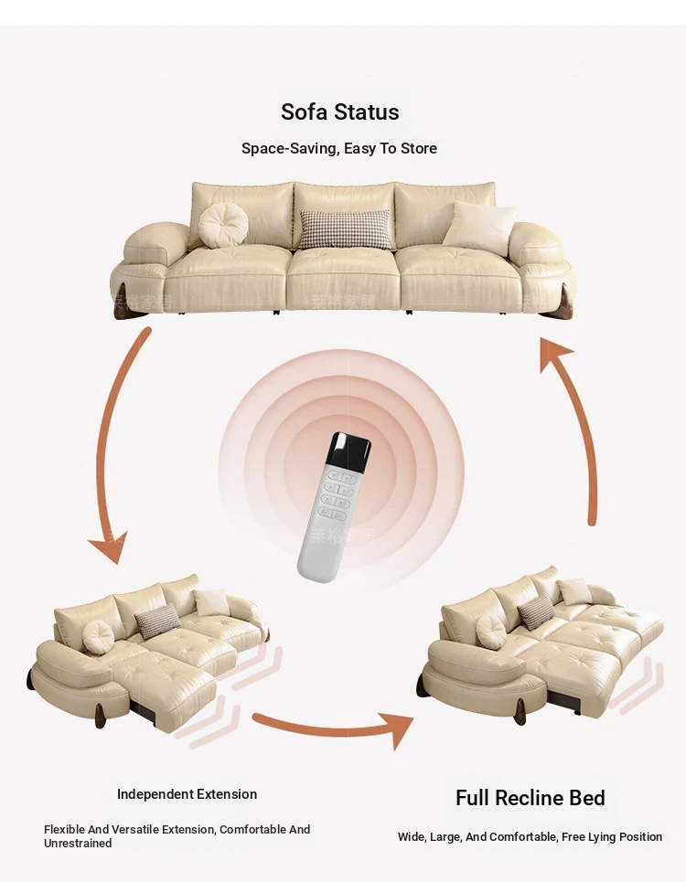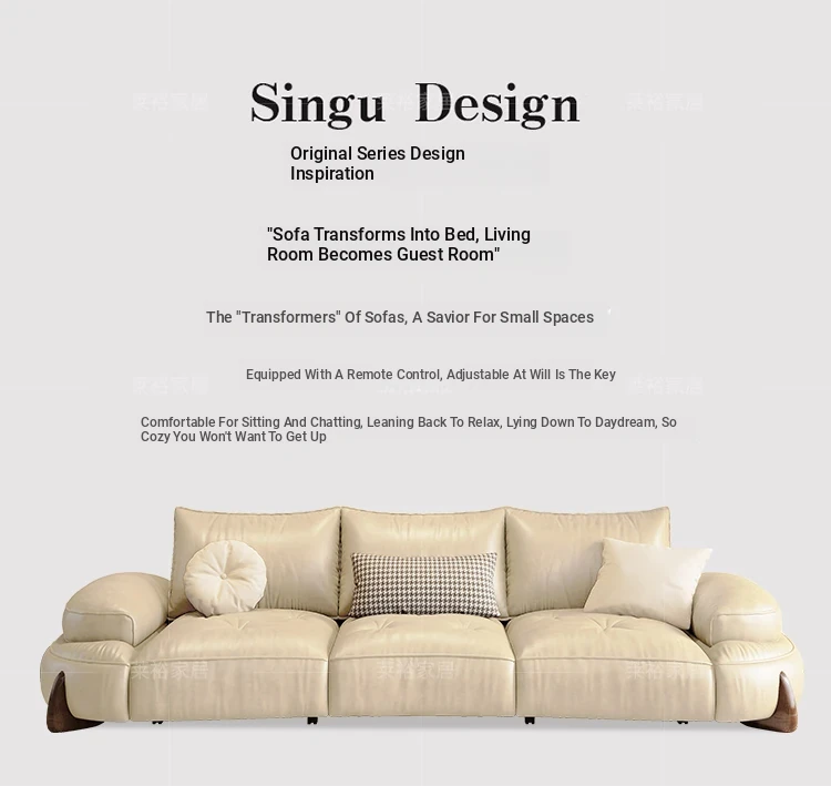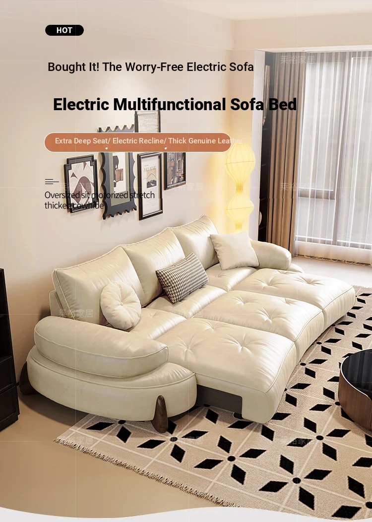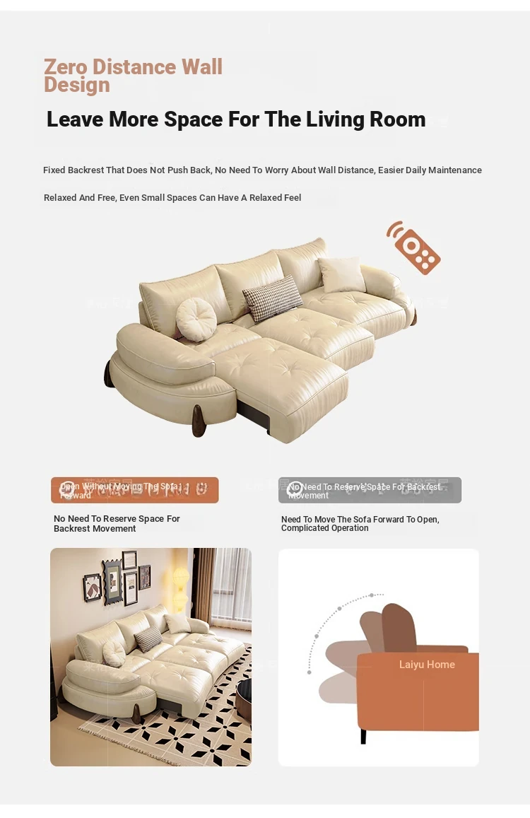 2025 New Minimalist Real Leather Electric Reclining Sofa Bed - Natural Wood Cream Finish, Adjustable for Ultimate Comfort in Your Living Room