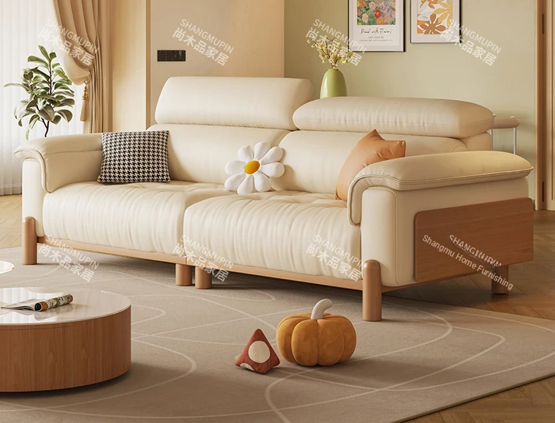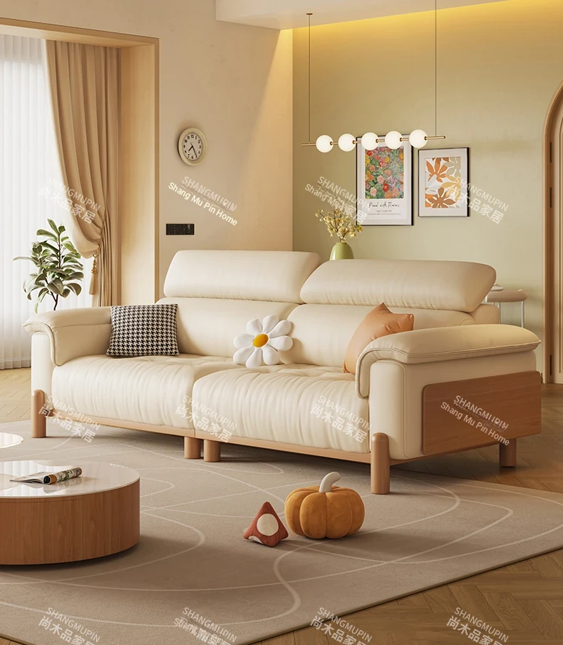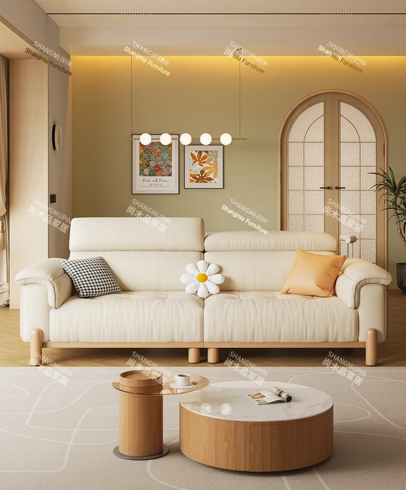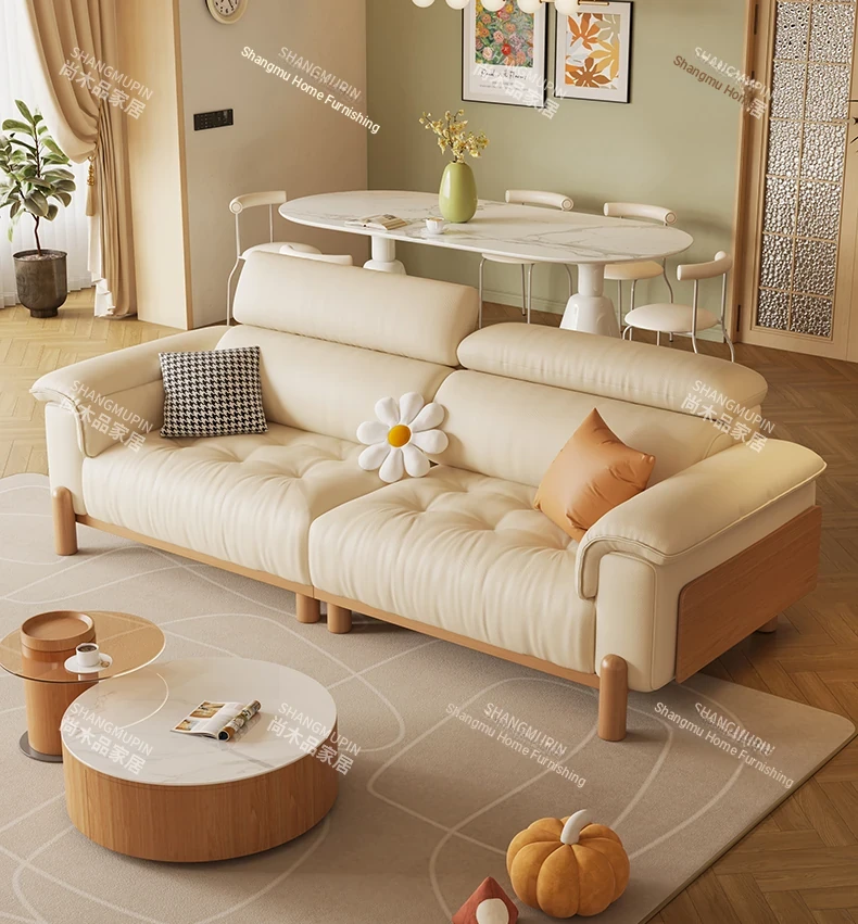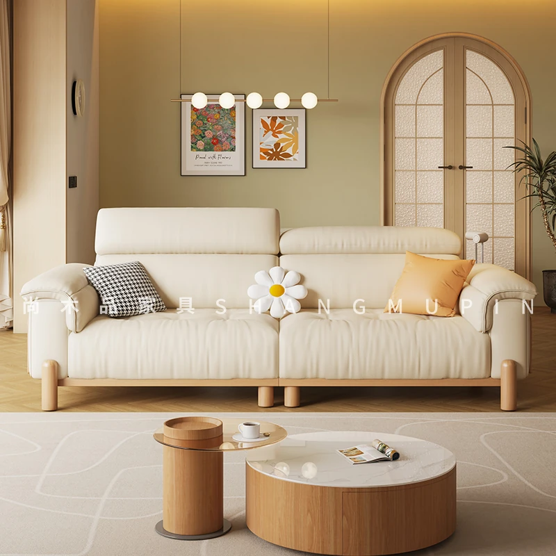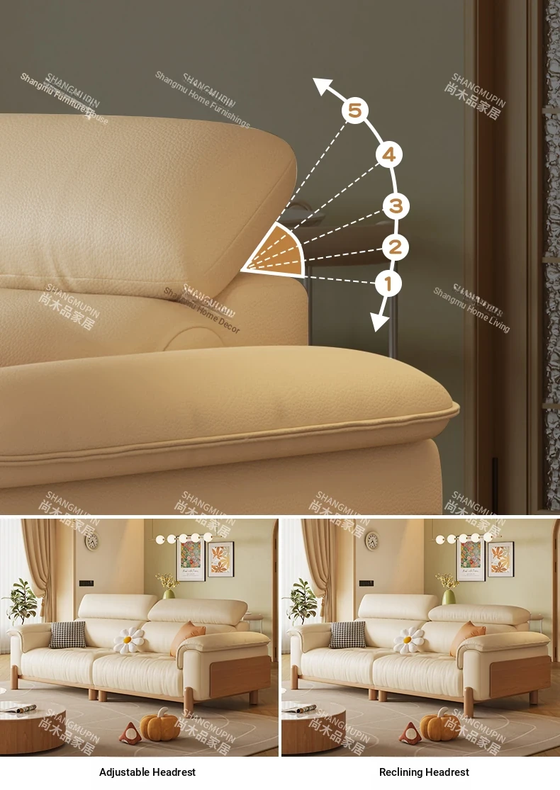 Cream Modern Minimalist Genuine Leather Sofa with Adjustable Headrest for Small Spaces - High-Quality Top Grain Cowhide and Solid Wood Design for Your Living Room