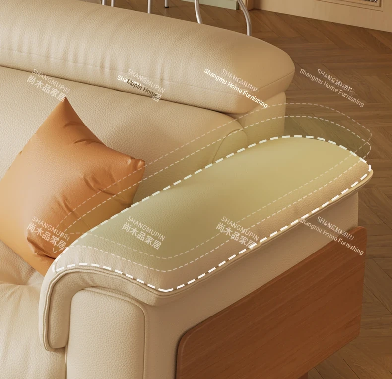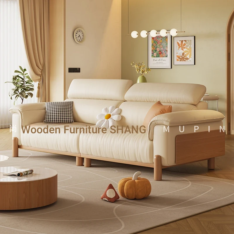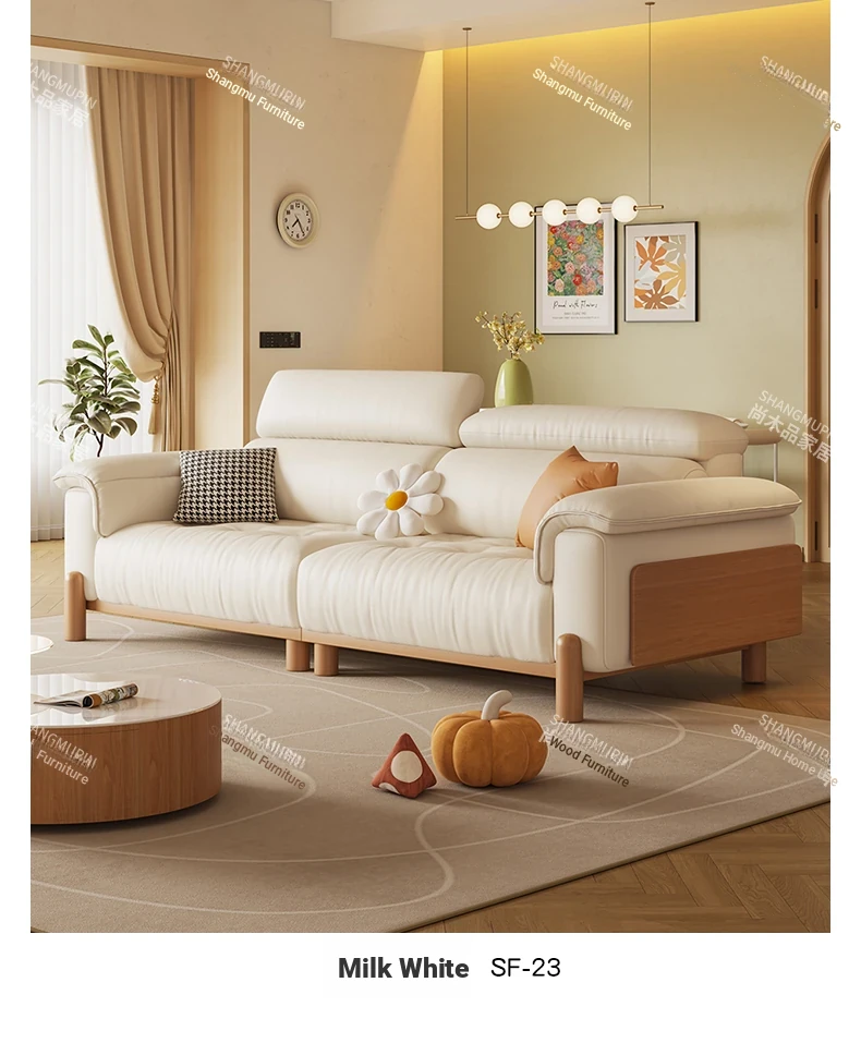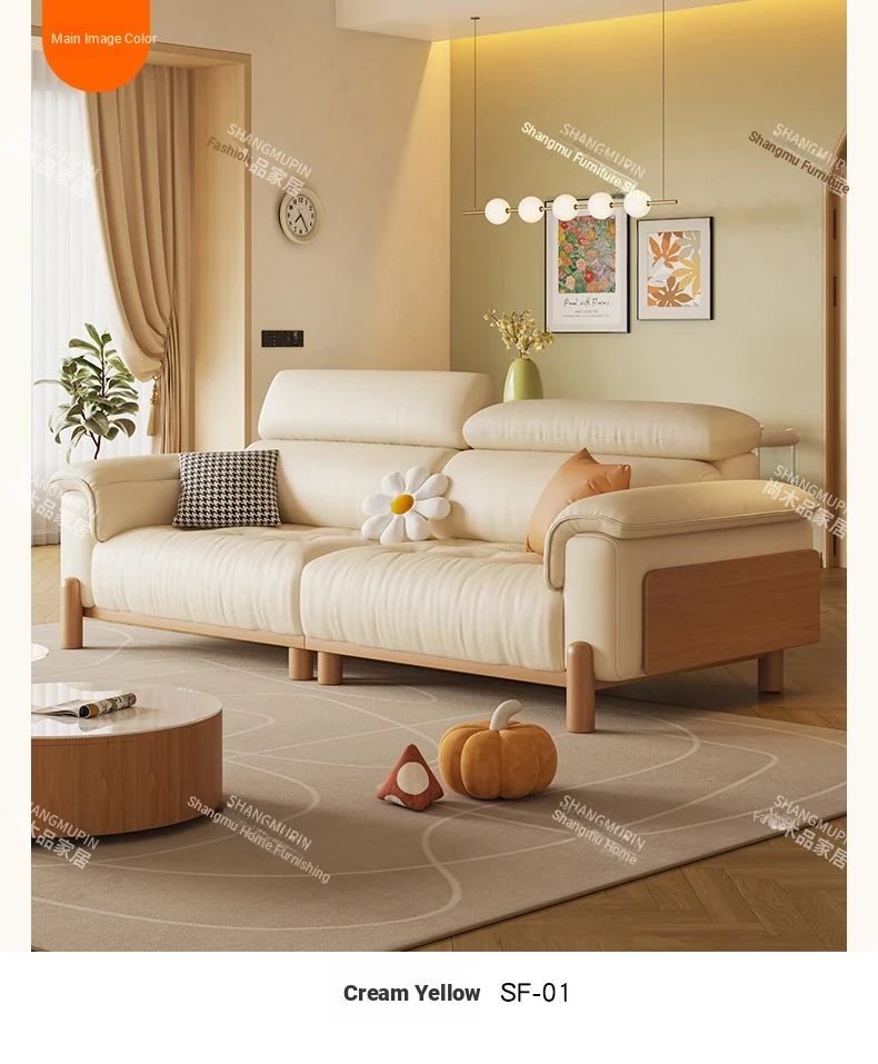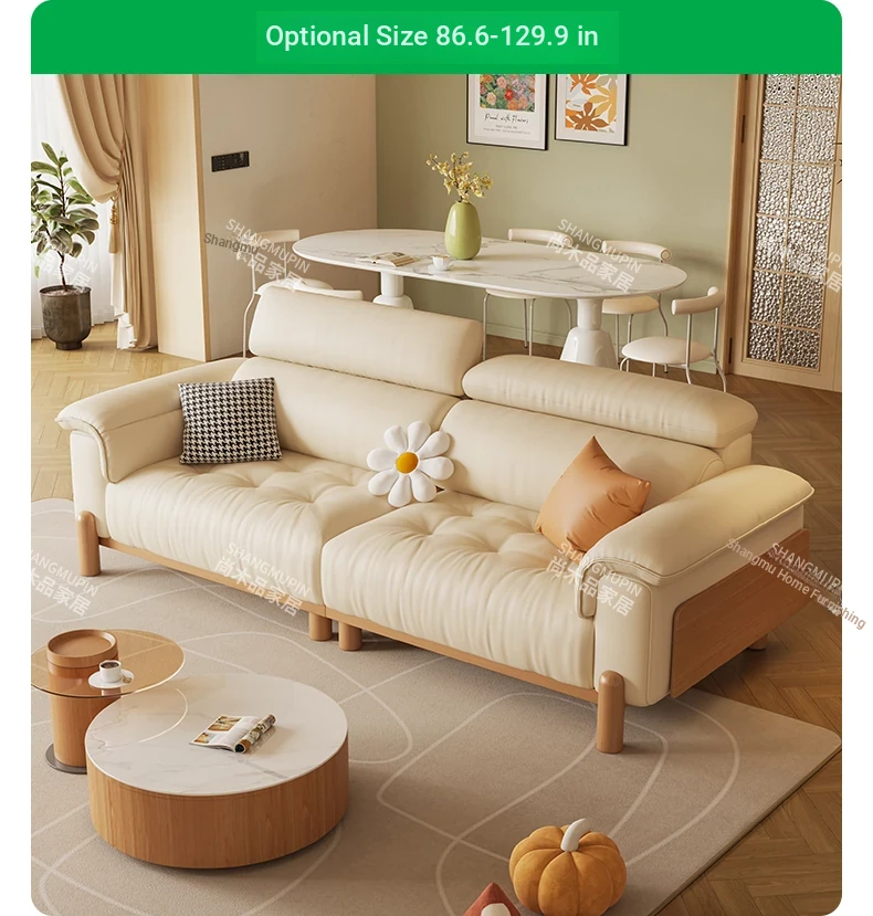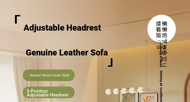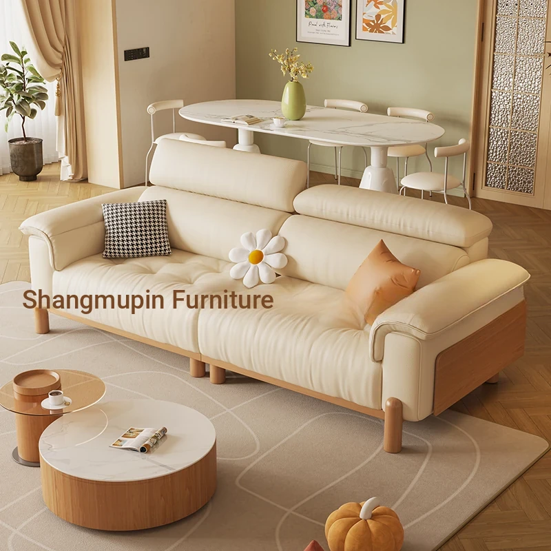 Cream Modern Minimalist Genuine Leather Sofa with Adjustable Headrest for Small Spaces - High-Quality Top Grain Cowhide and Solid Wood Design for Your Living Room