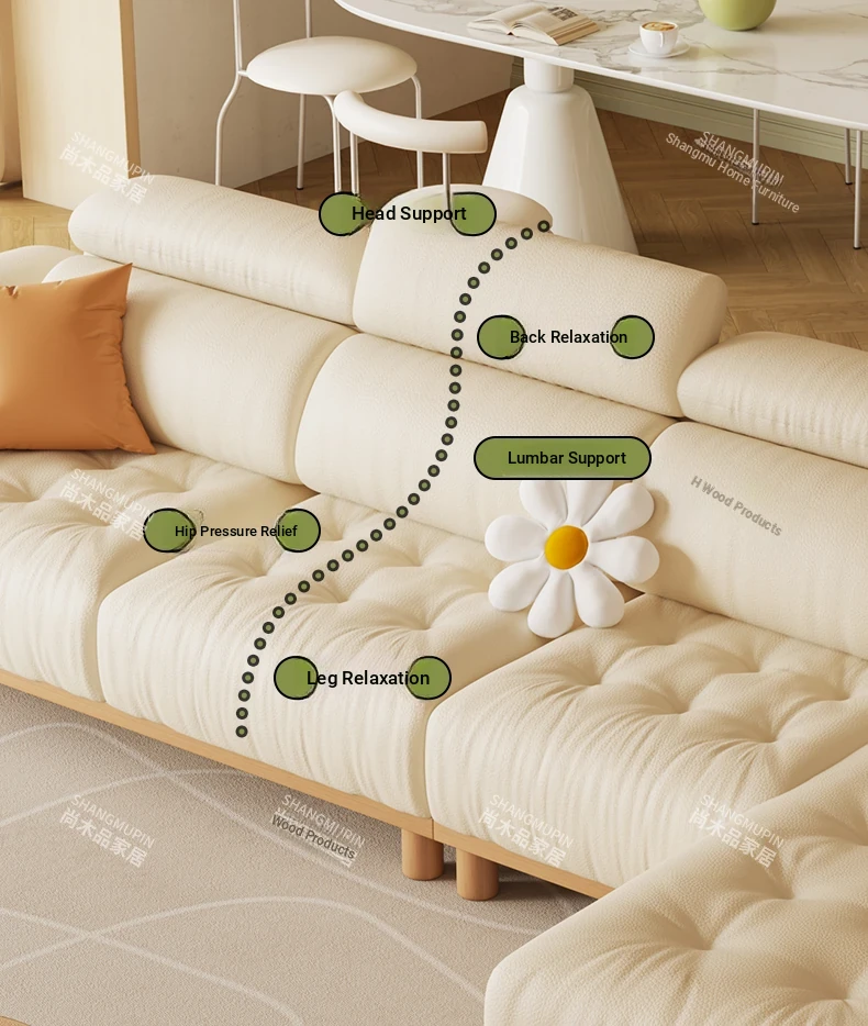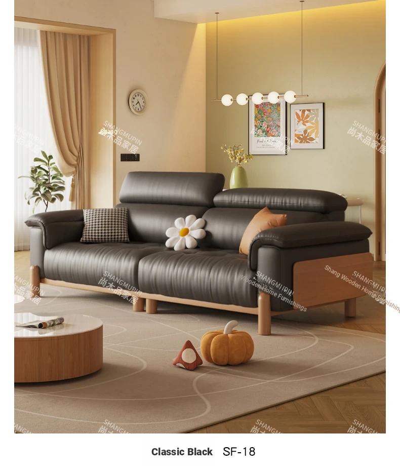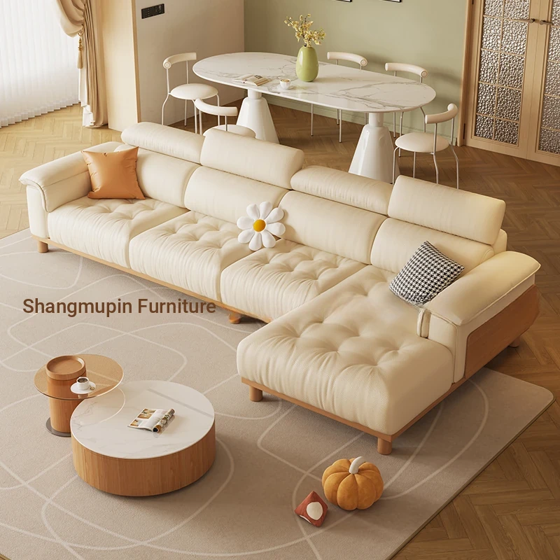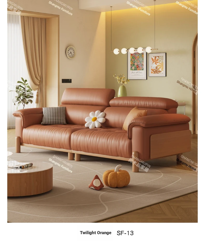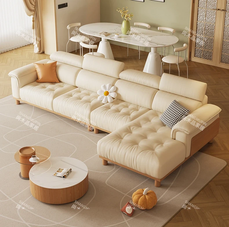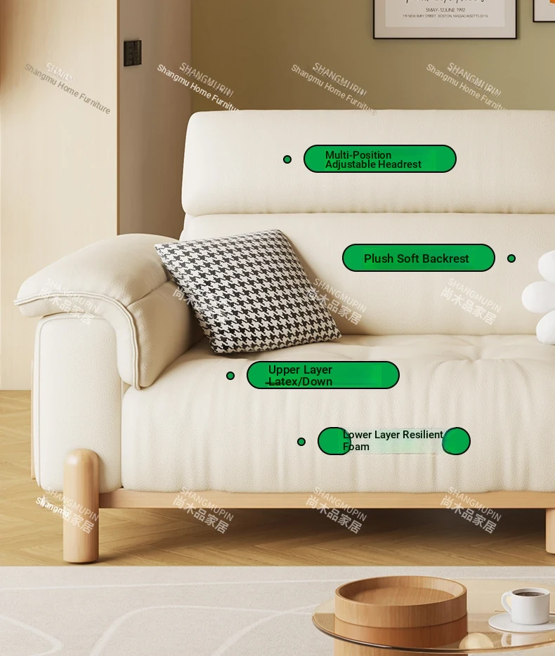 Cream Modern Minimalist Genuine Leather Sofa with Adjustable Headrest for Small Spaces - High-Quality Top Grain Cowhide and Solid Wood Design for Your Living Room