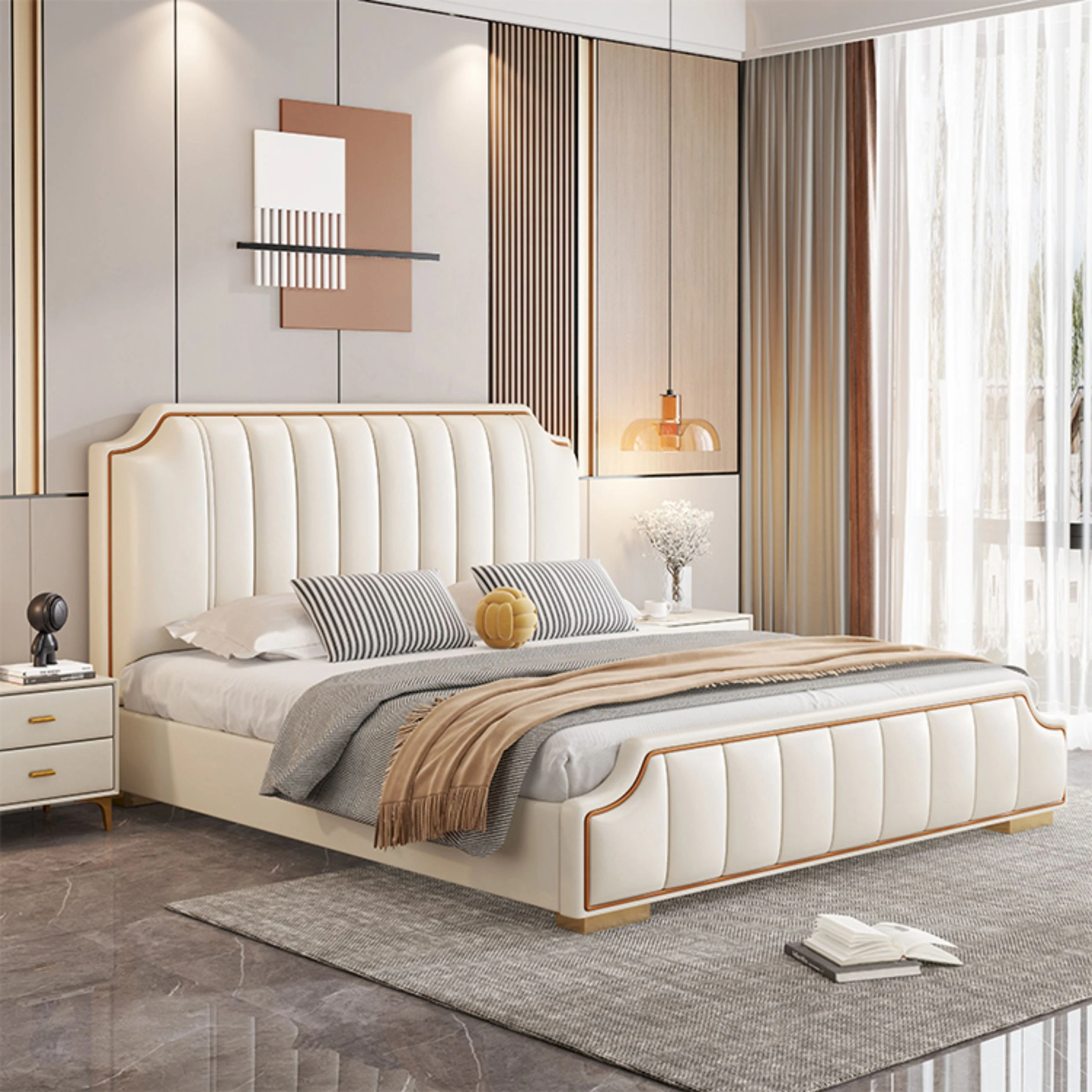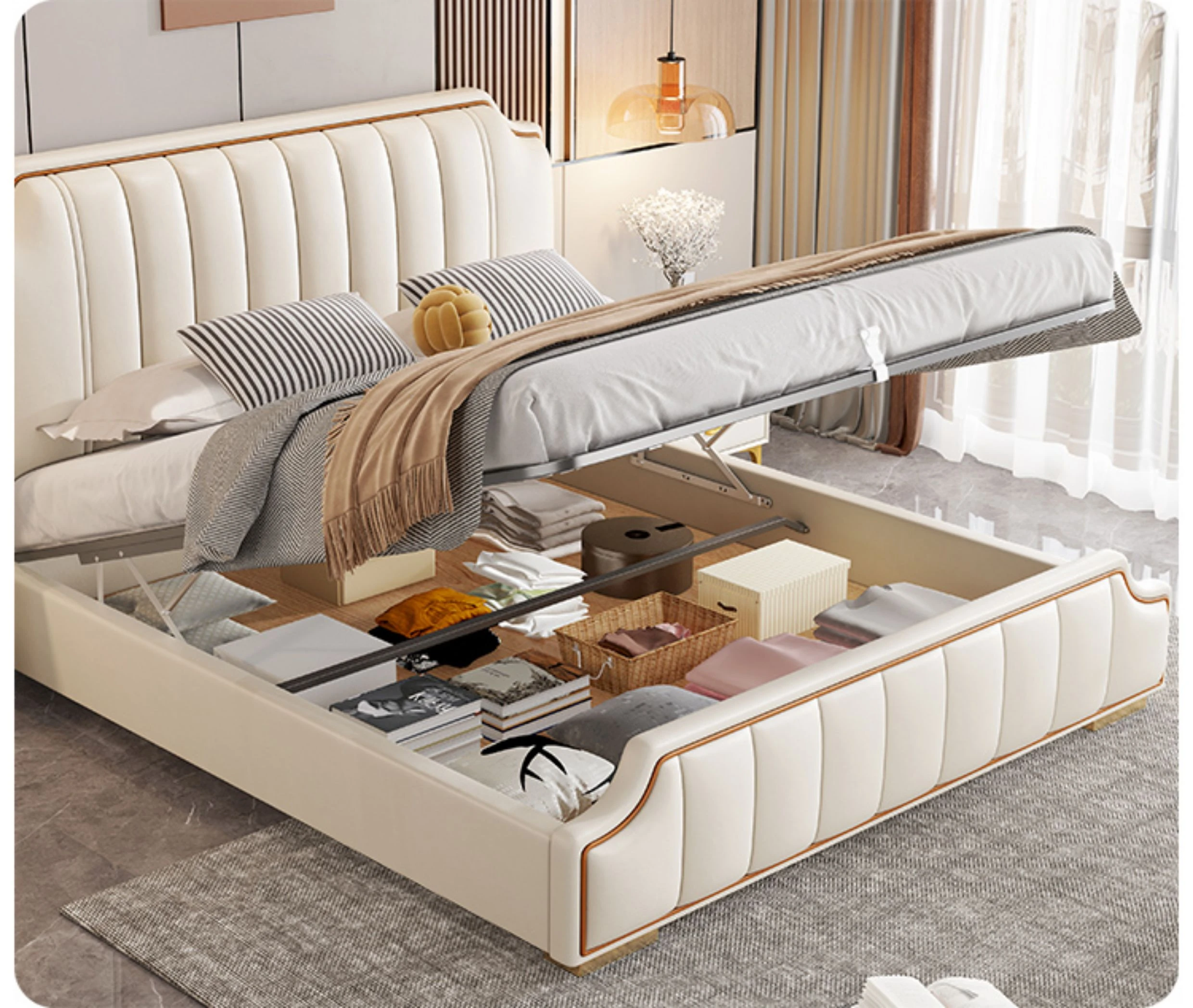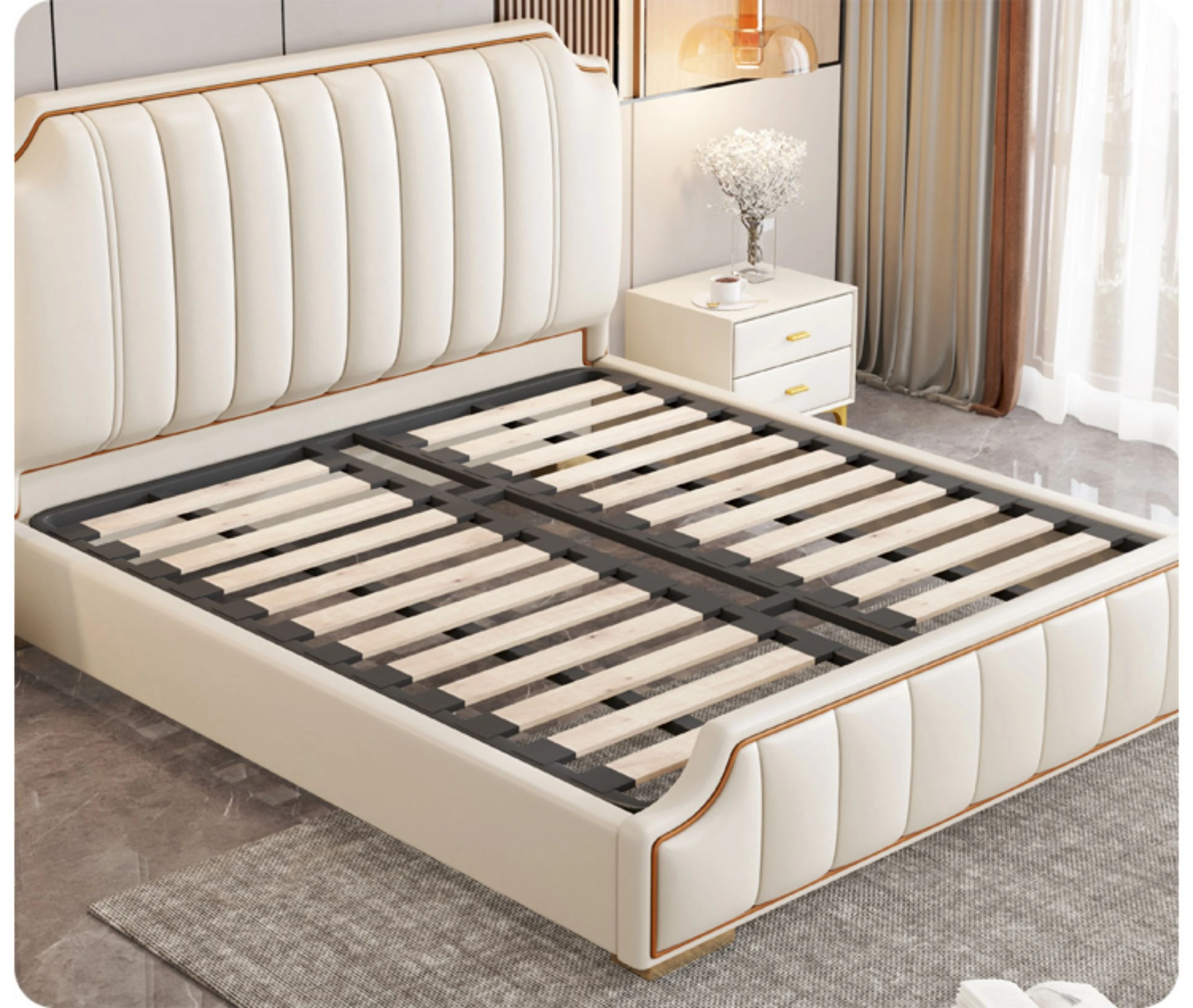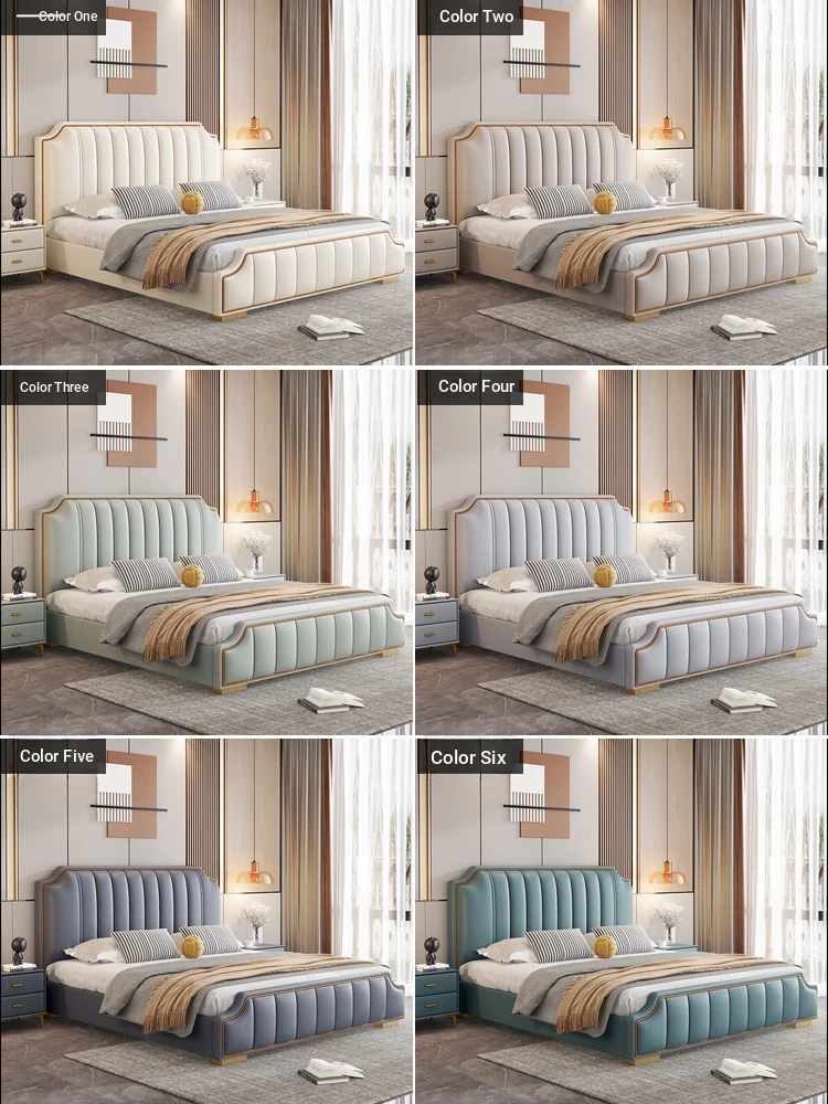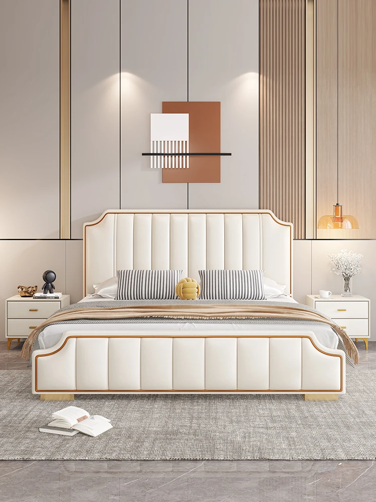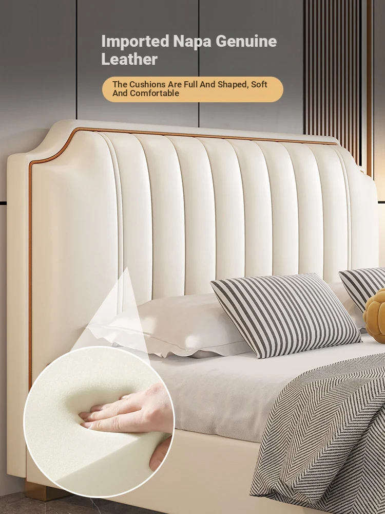 Italian Luxury 1.8m Double Bed - 2024 New Modern Design with High Storage and Slatted Frame, Upholstered in Genuine Leather for Your Master Bedroom