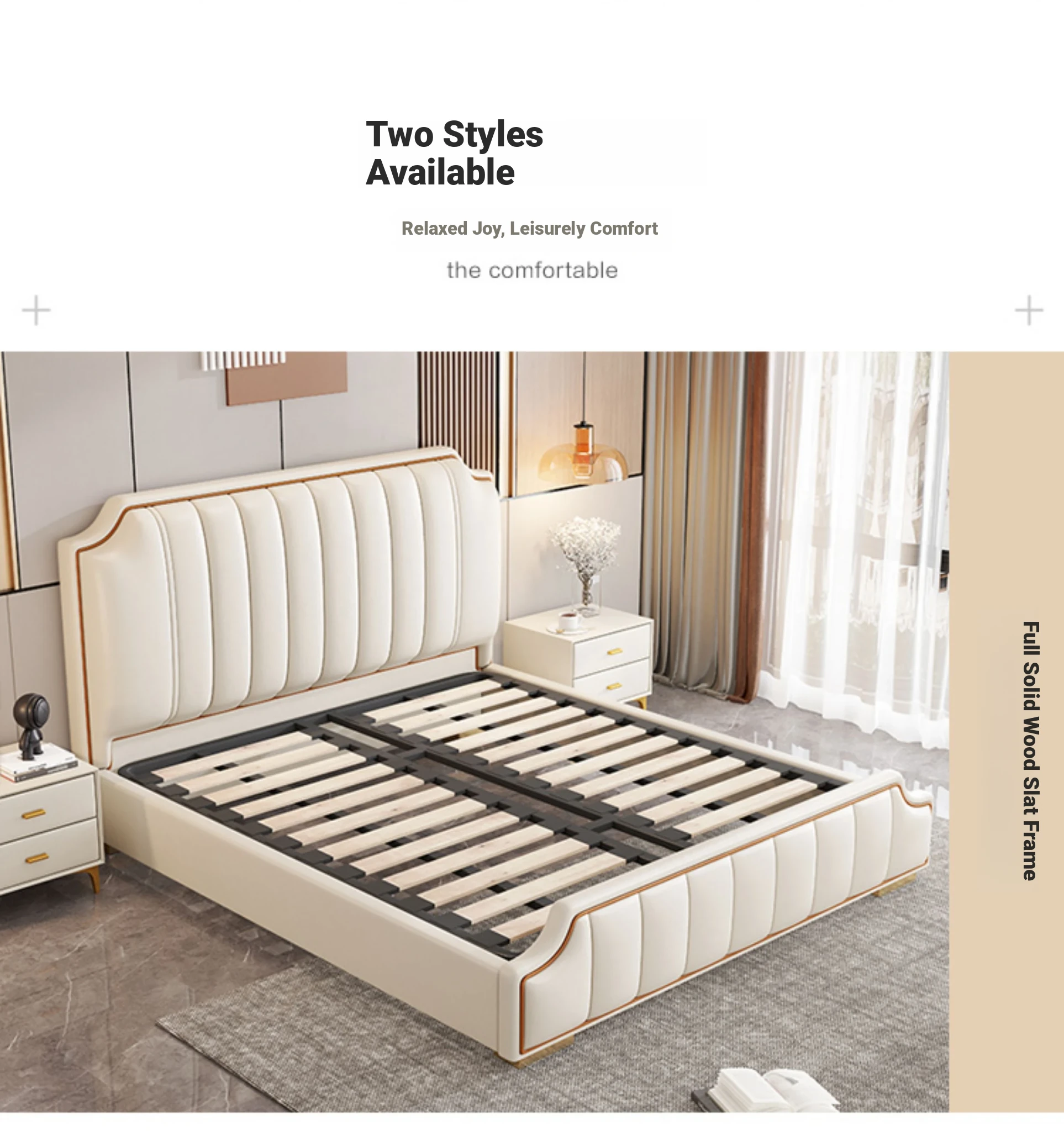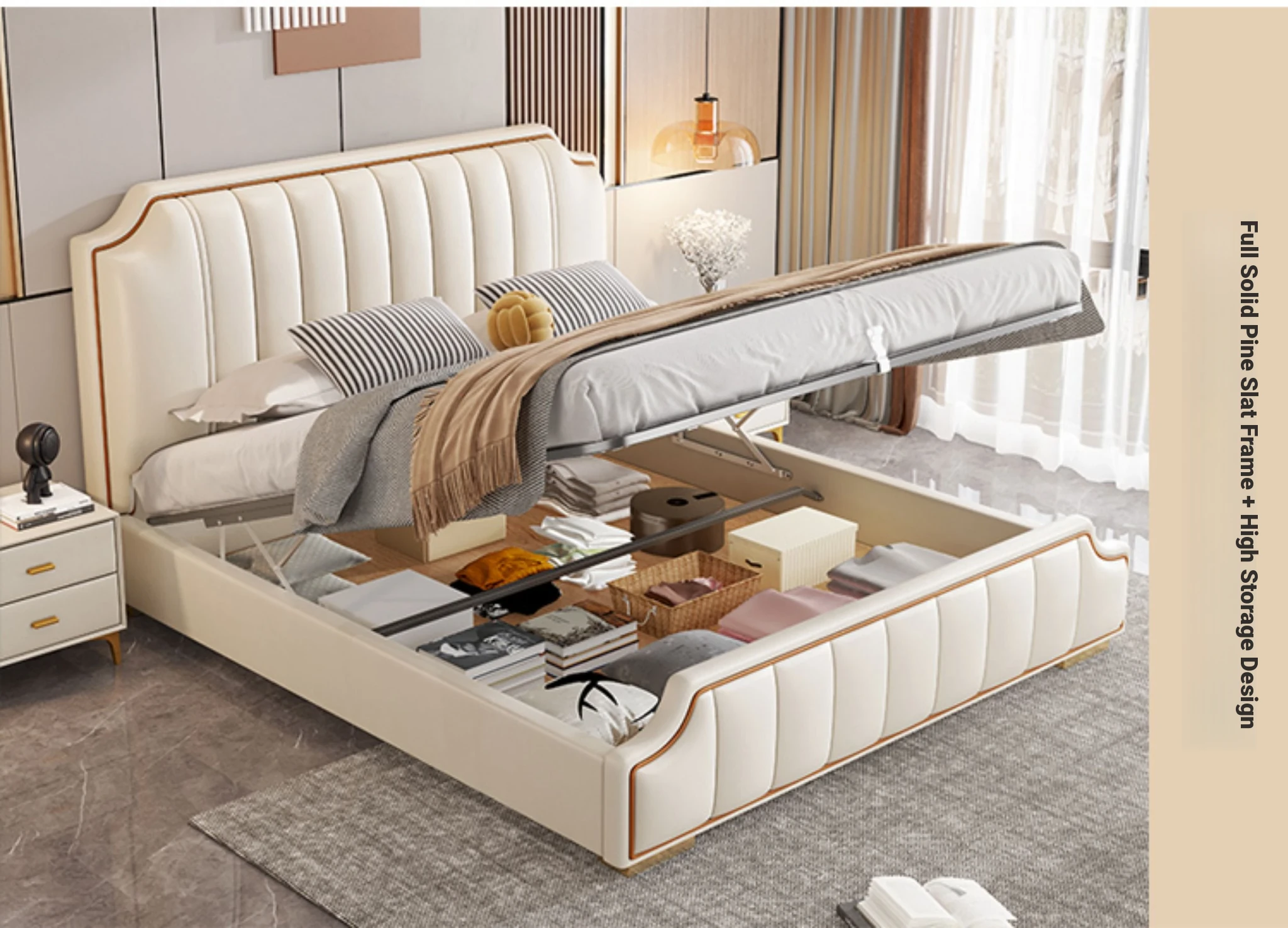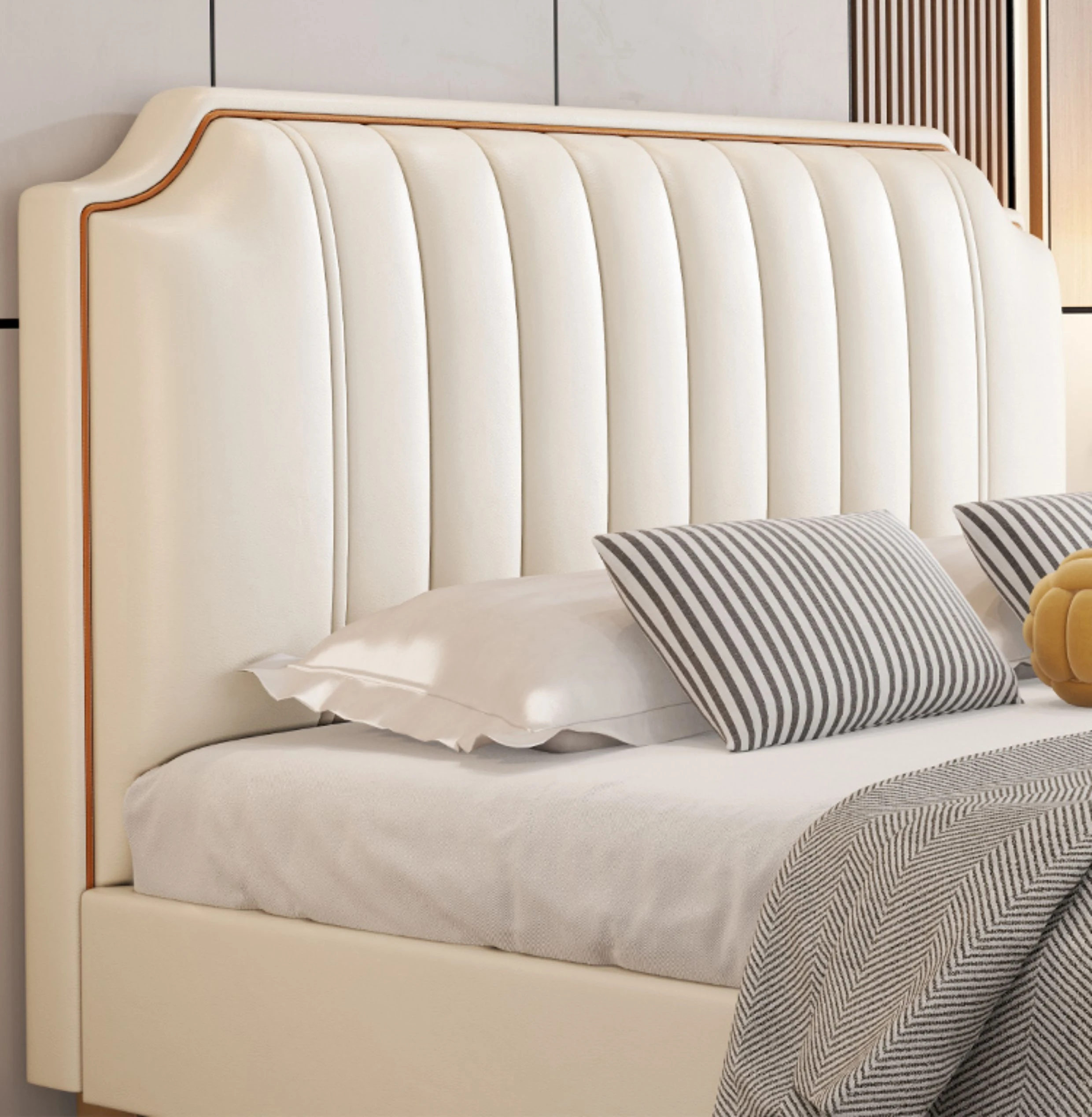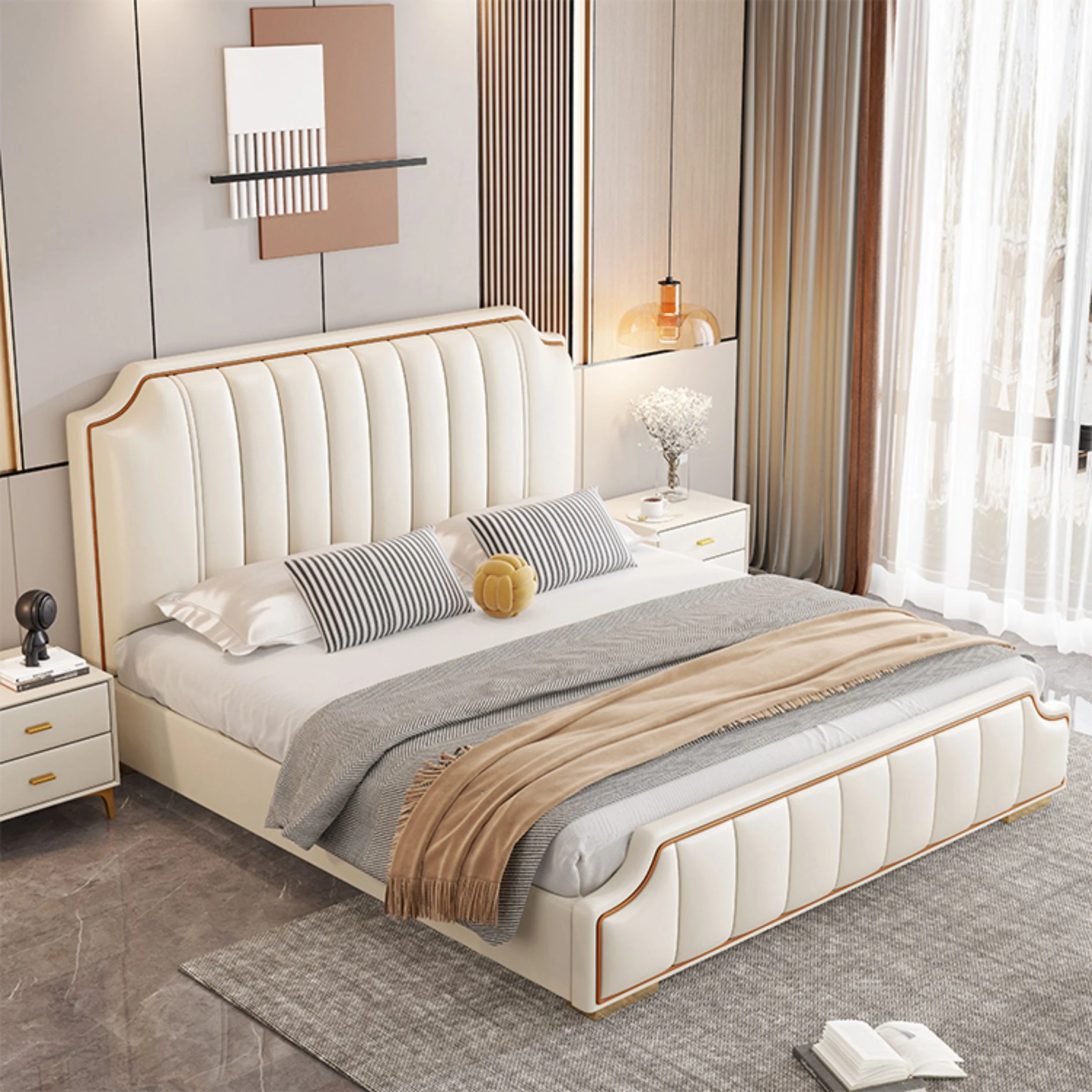 Italian Luxury 1.8m Double Bed - 2024 New Modern Design with High Storage and Slatted Frame, Upholstered in Genuine Leather for Your Master Bedroom