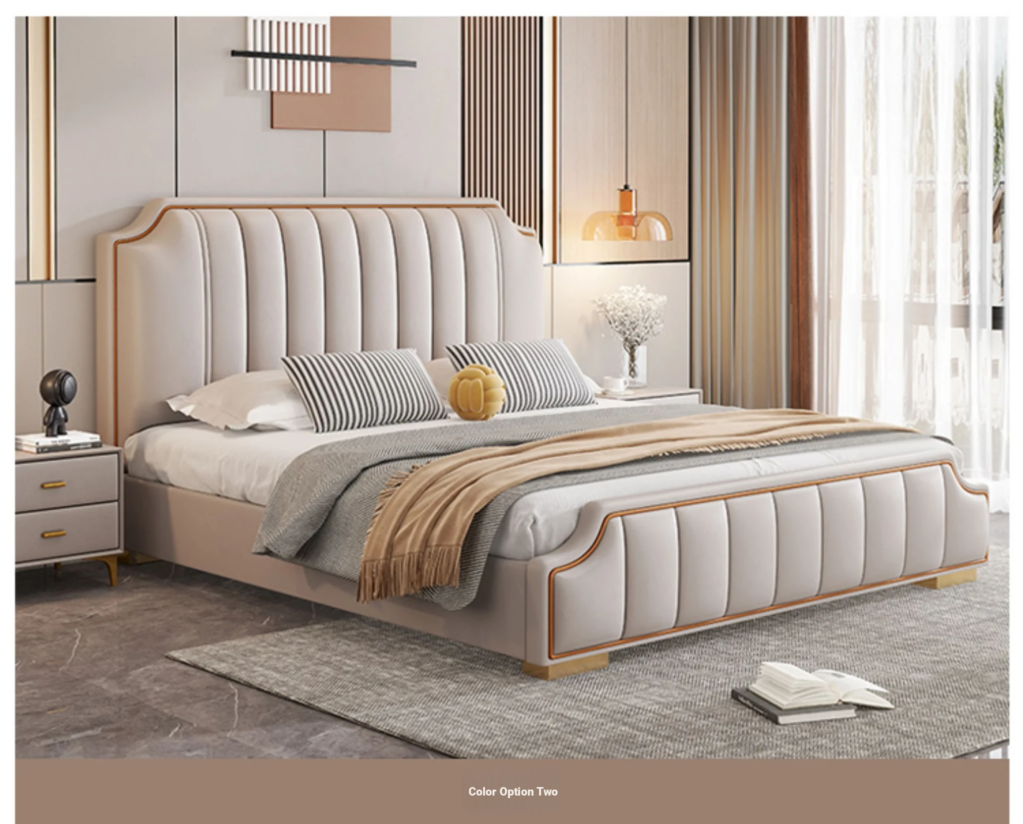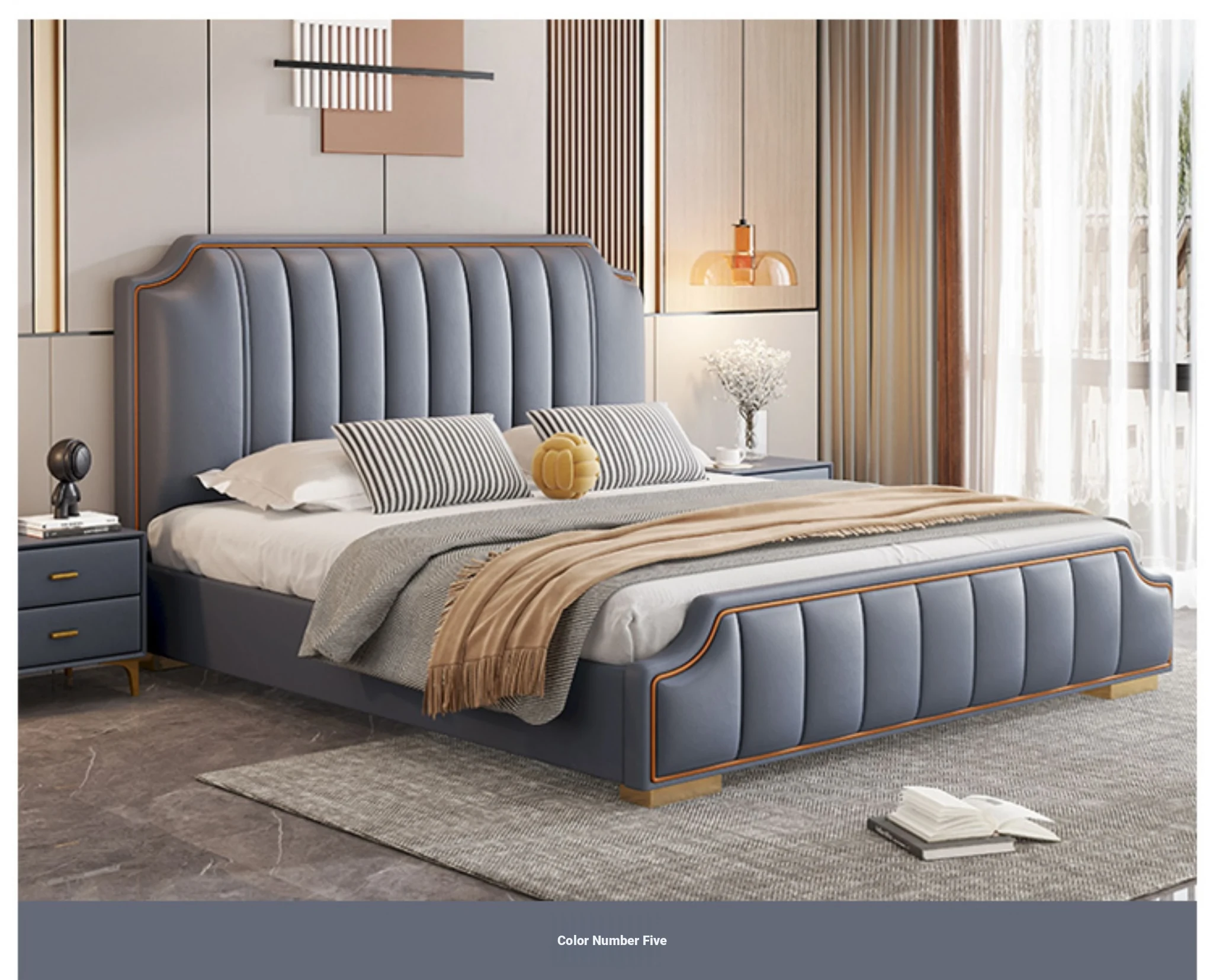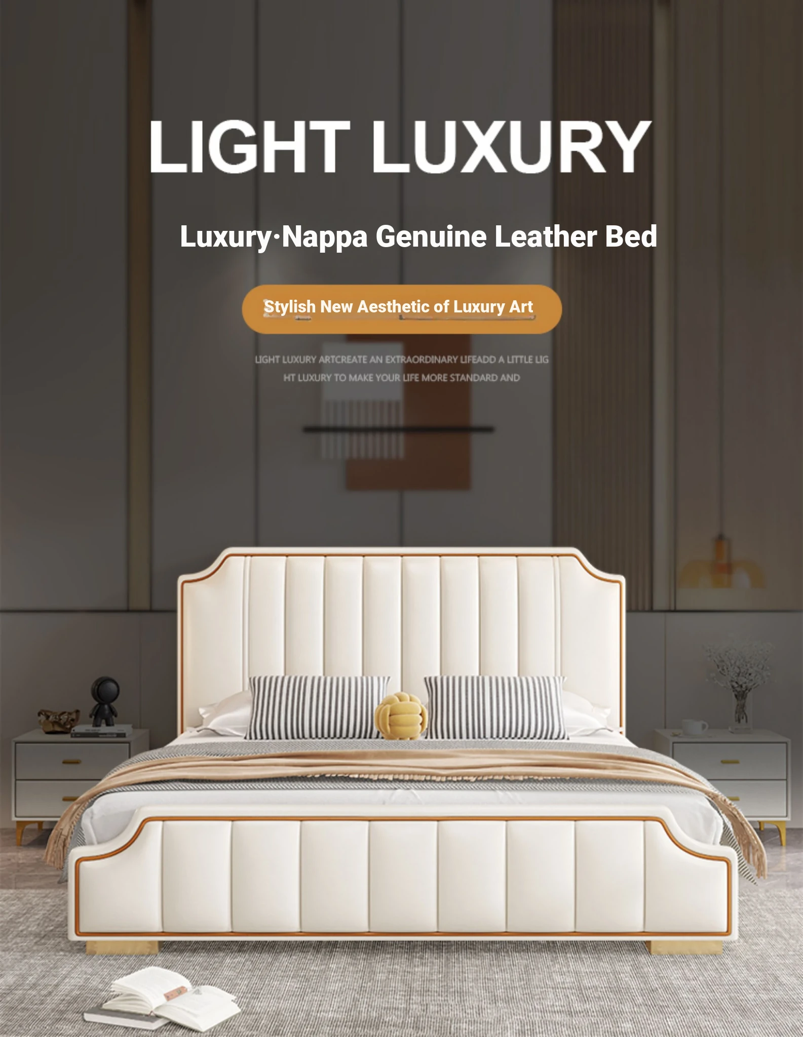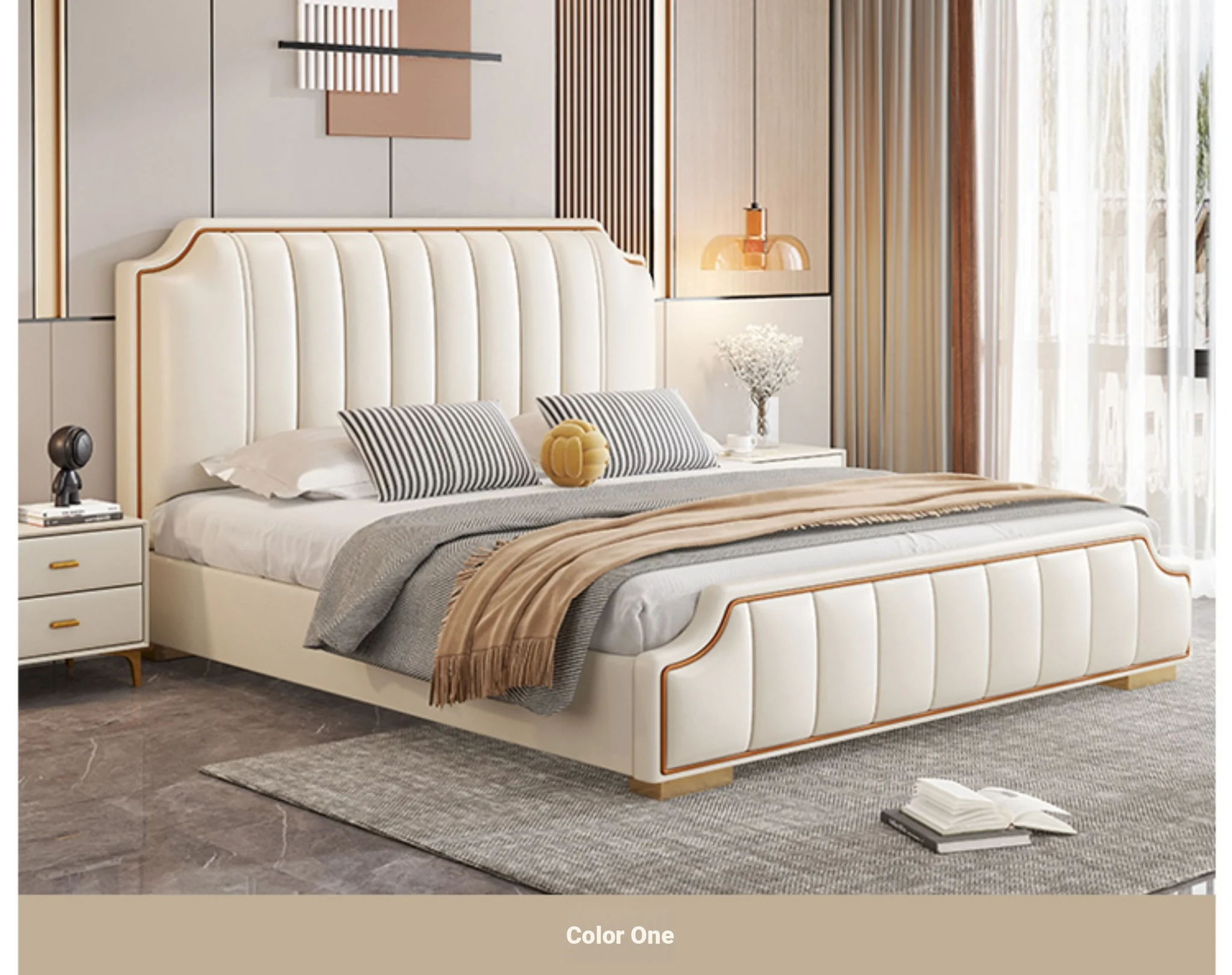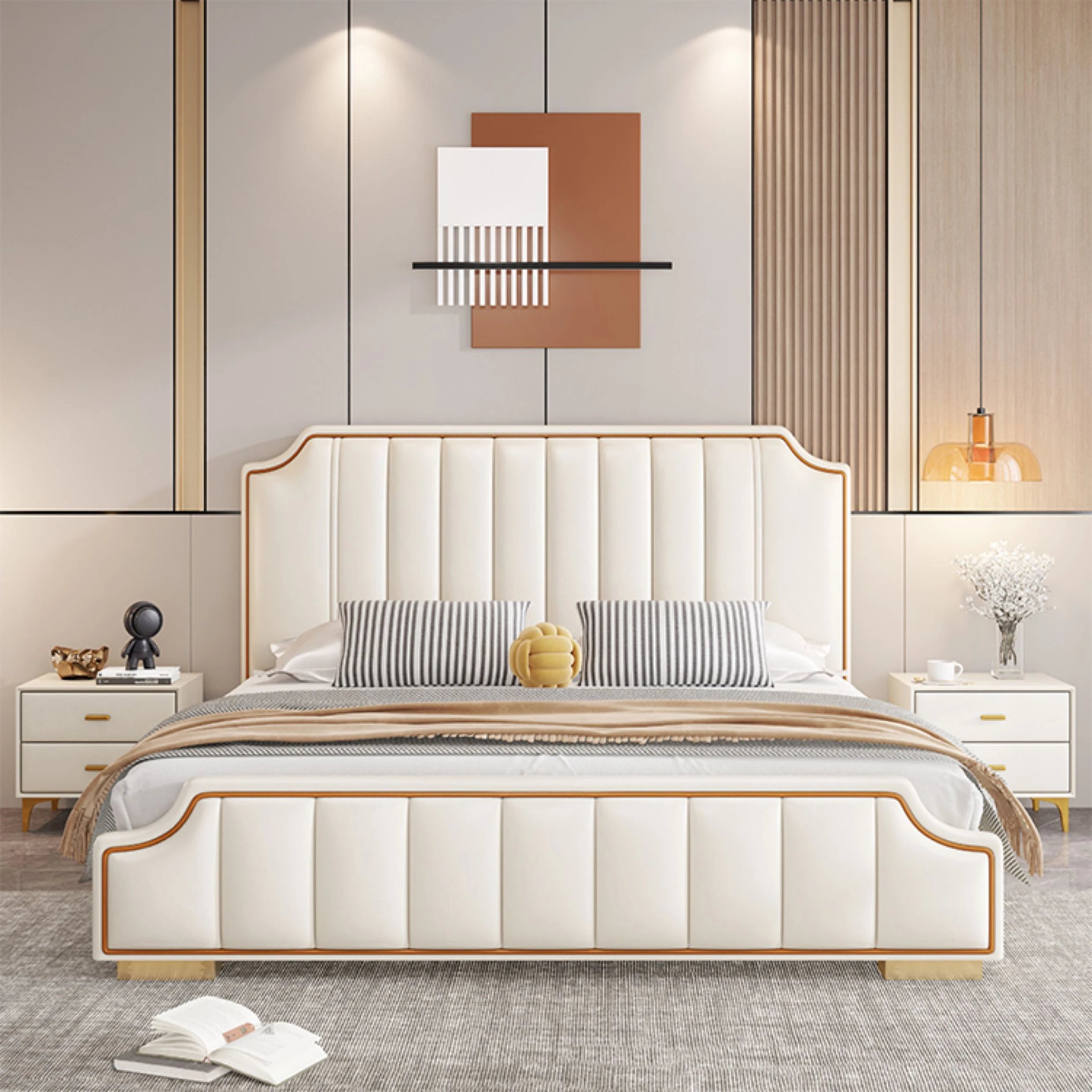 Italian Luxury 1.8m Double Bed - 2024 New Modern Design with High Storage and Slatted Frame, Upholstered in Genuine Leather for Your Master Bedroom