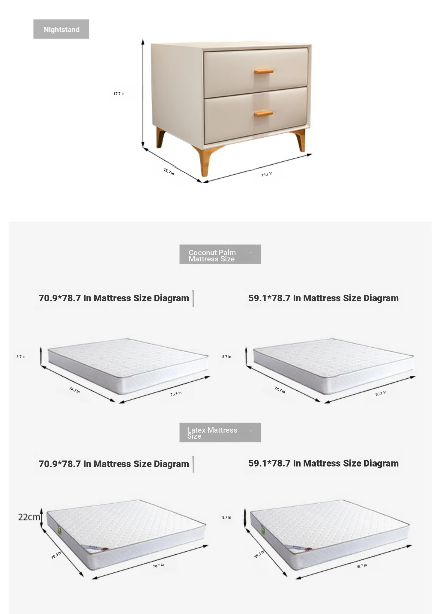Import pine bare bed +8.66in coconut palm mattress + two bedside tables