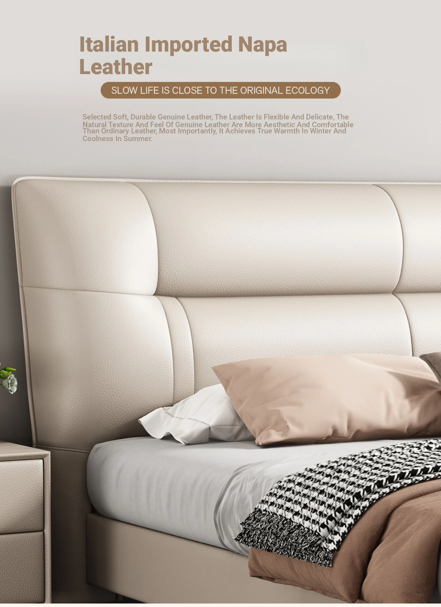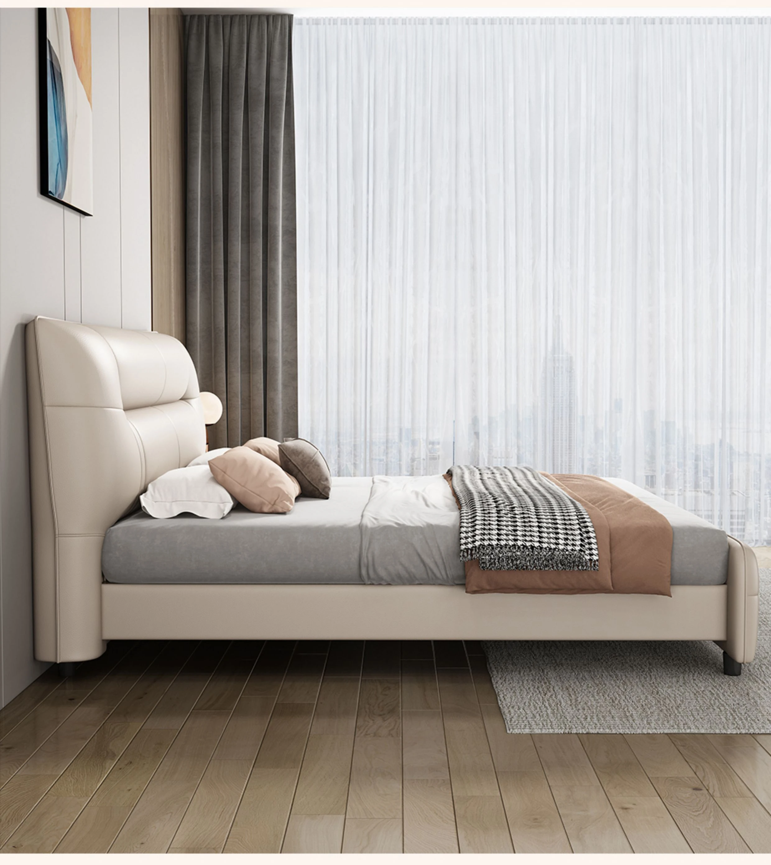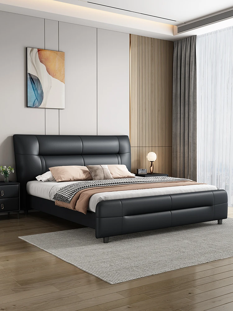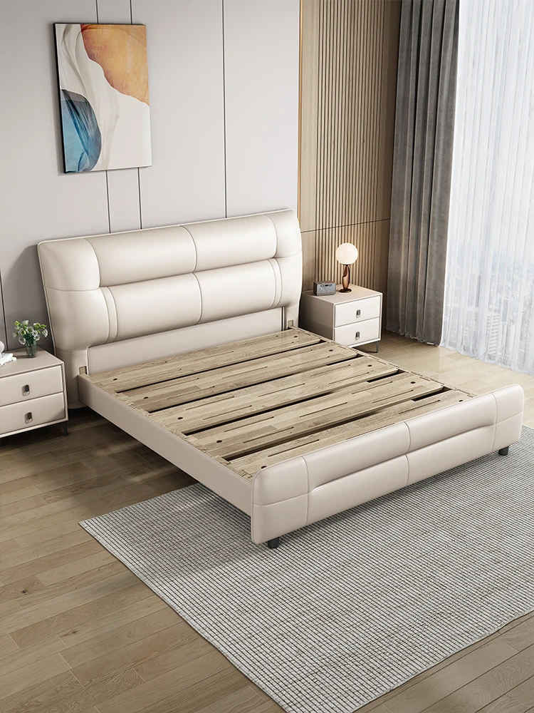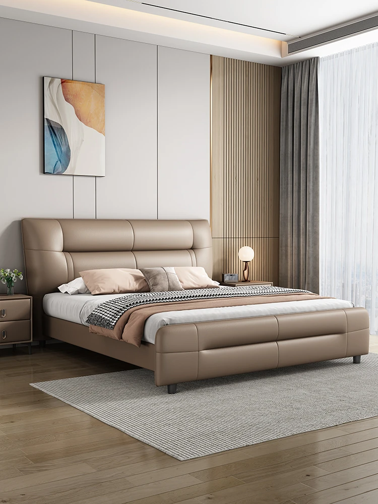 Italian Minimalist Luxury Genuine Leather Bed for Master Bedroom - Adjustable Height Double Bed with Soft Upholstered Headboard for Modern Home and Elegant Weddings