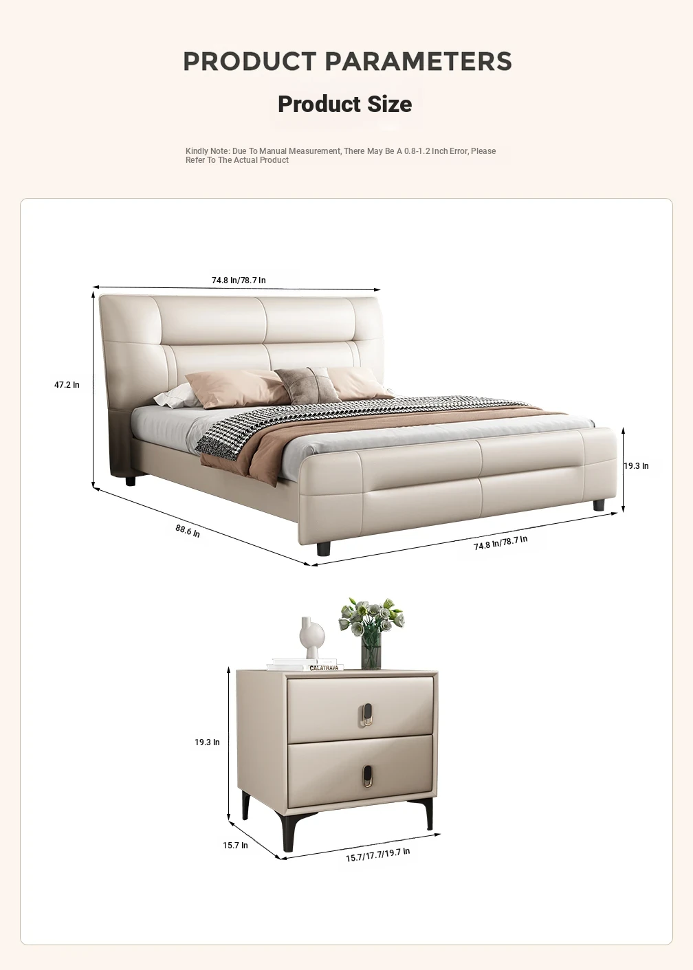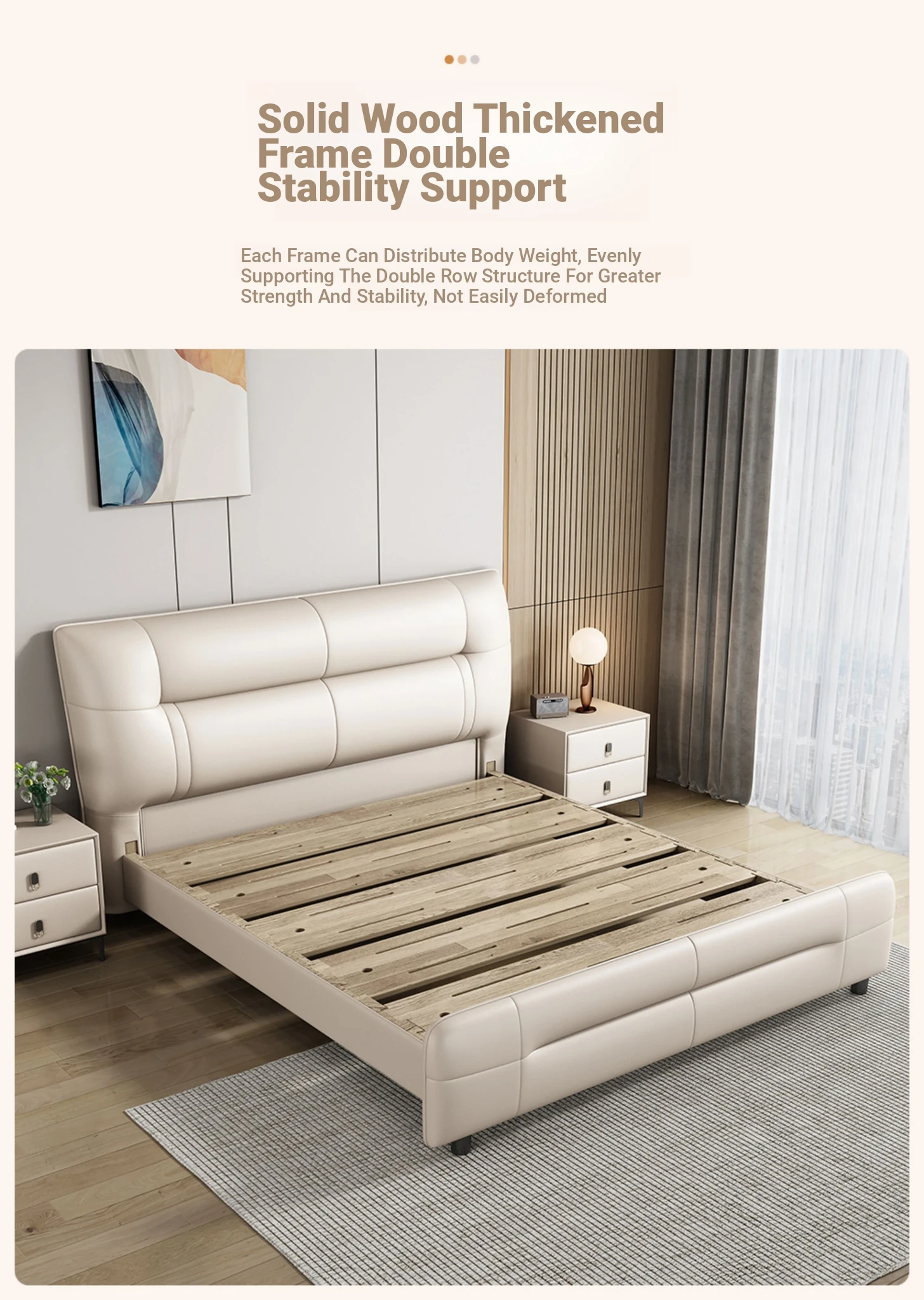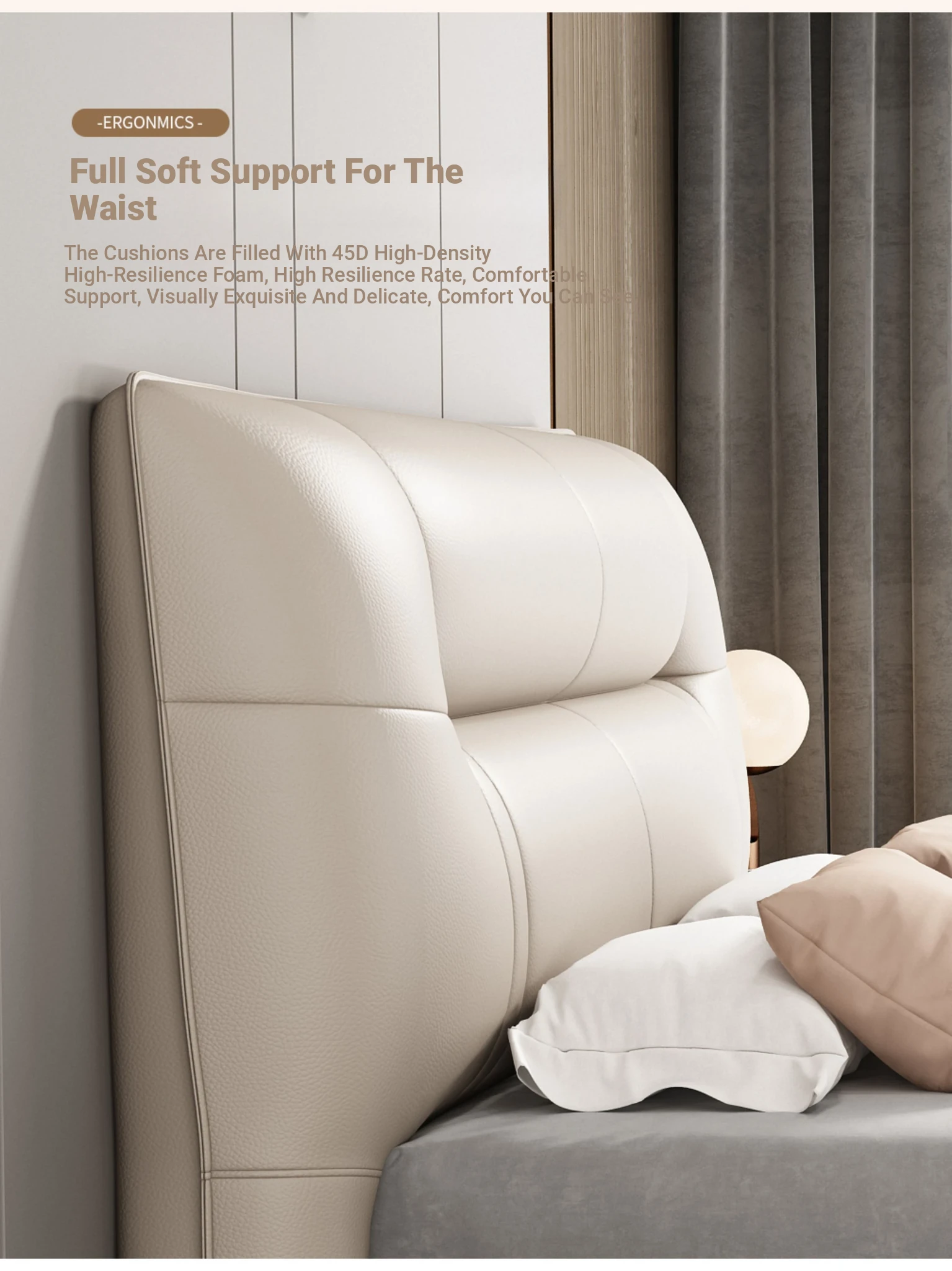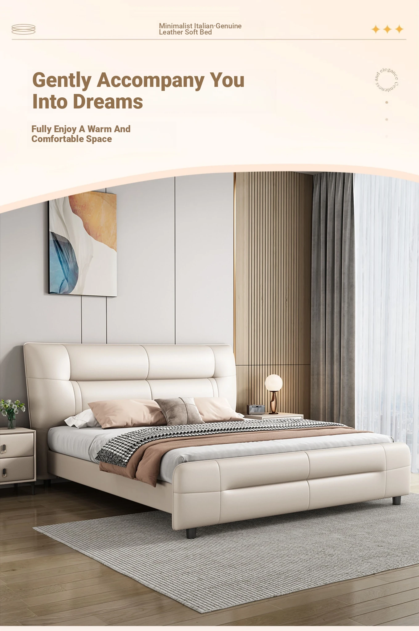 Italian Minimalist Luxury Genuine Leather Bed for Master Bedroom - Adjustable Height Double Bed with Soft Upholstered Headboard for Modern Home and Elegant Weddings