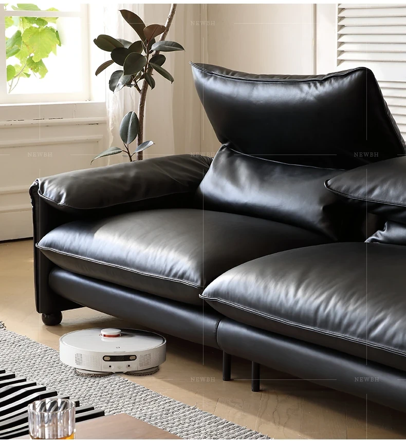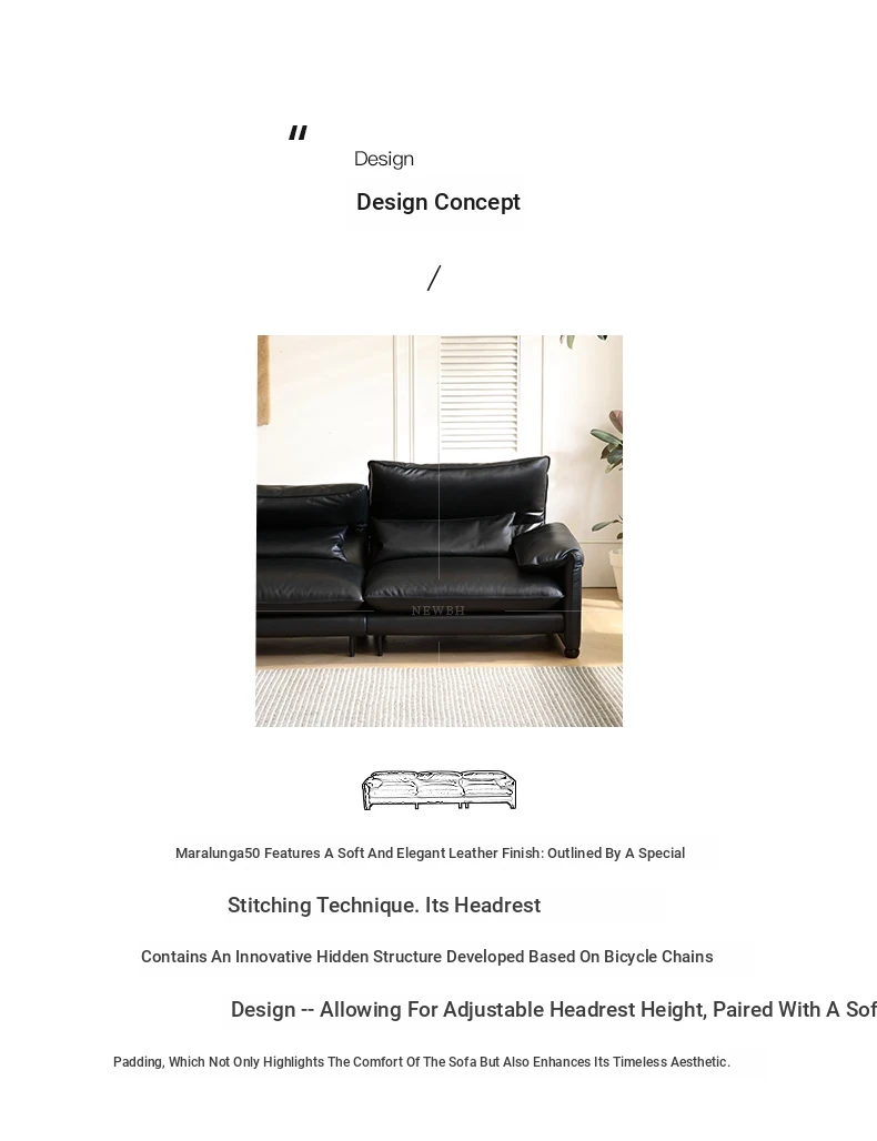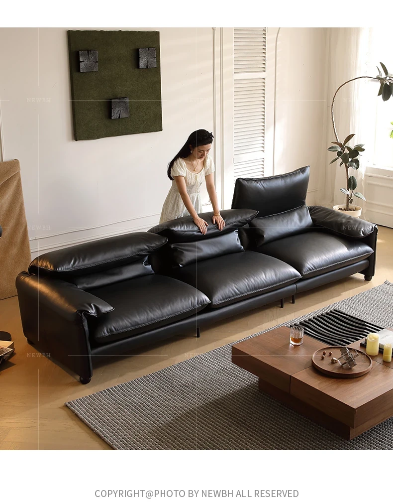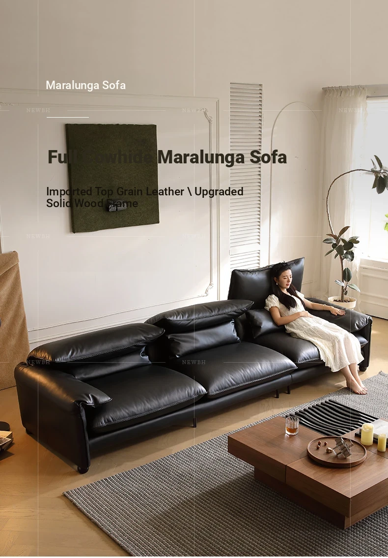 Marlangga Genuine Leather Sofa - High Back with Adjustable Headrest for Small Living Rooms - Full Top Grain Leather Straight Sofa