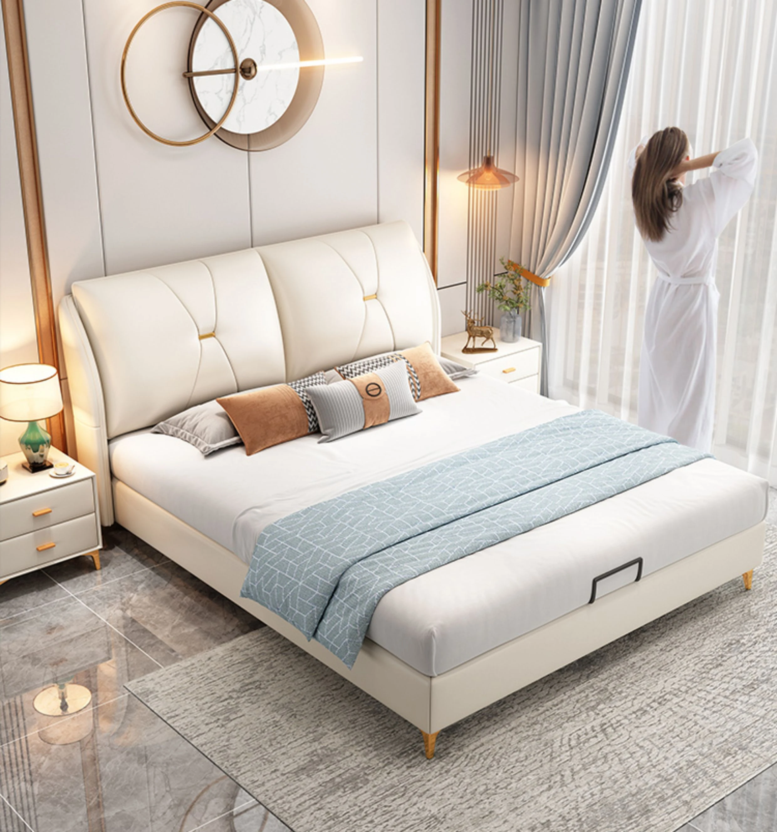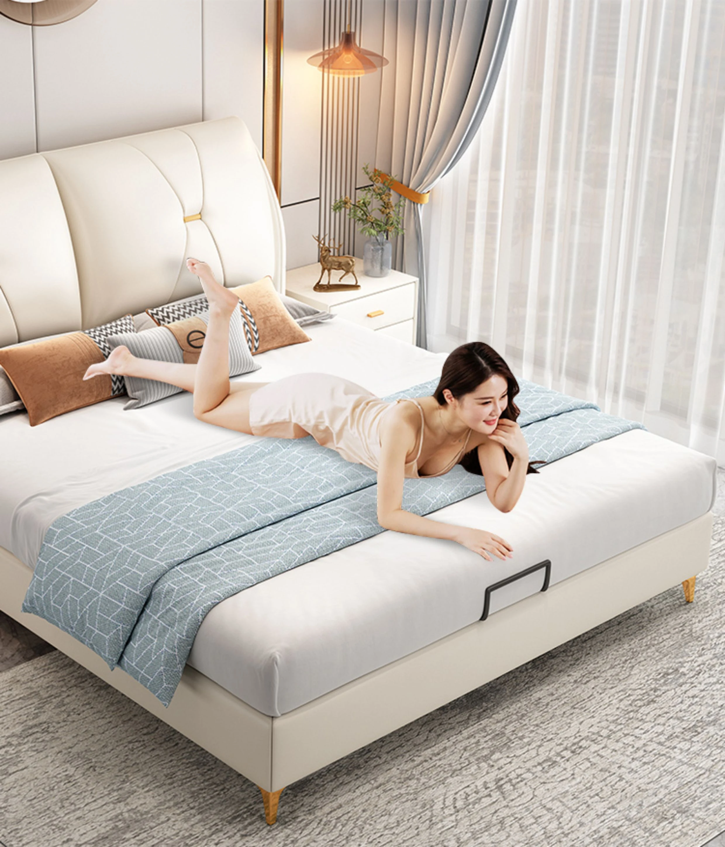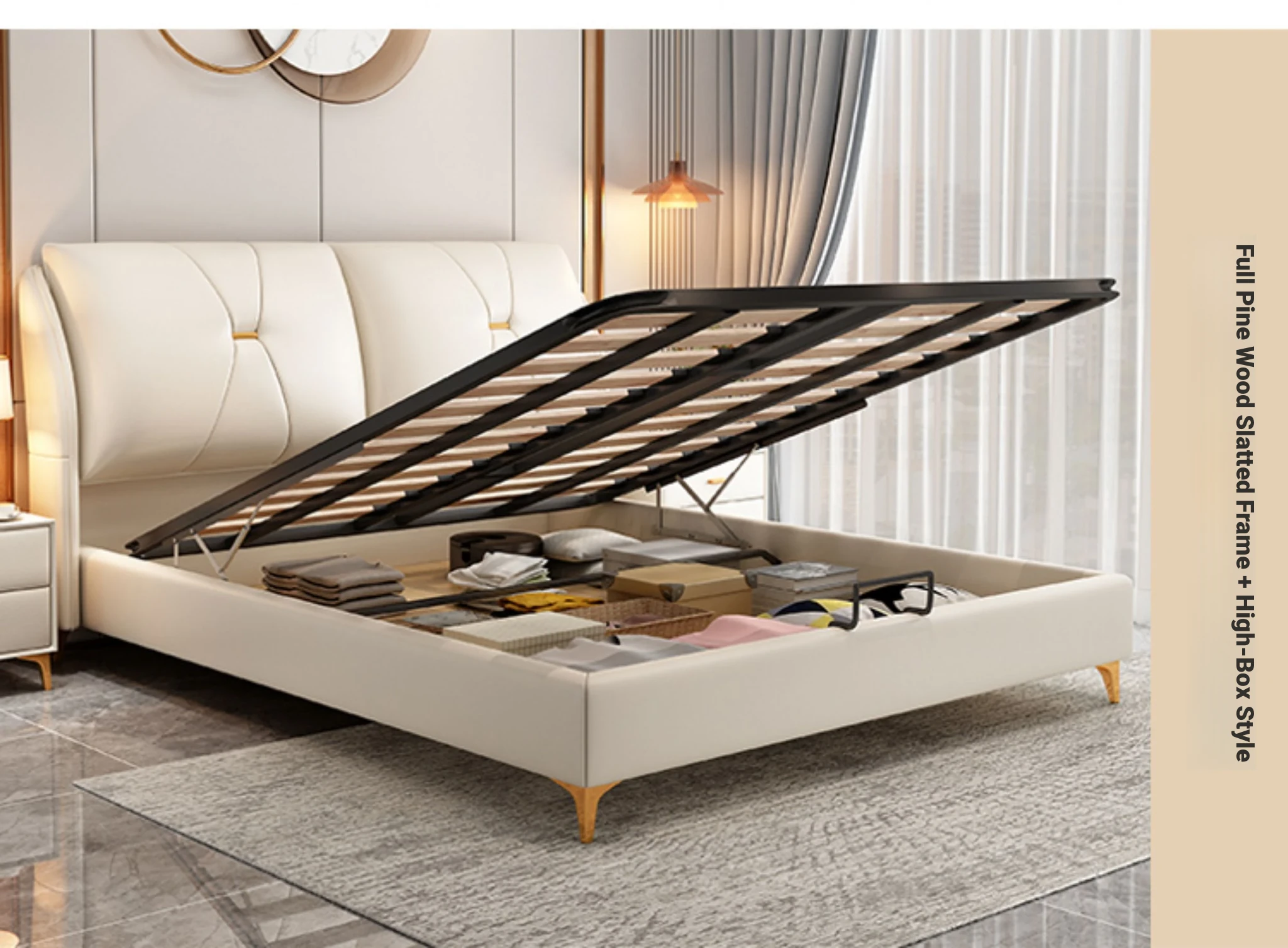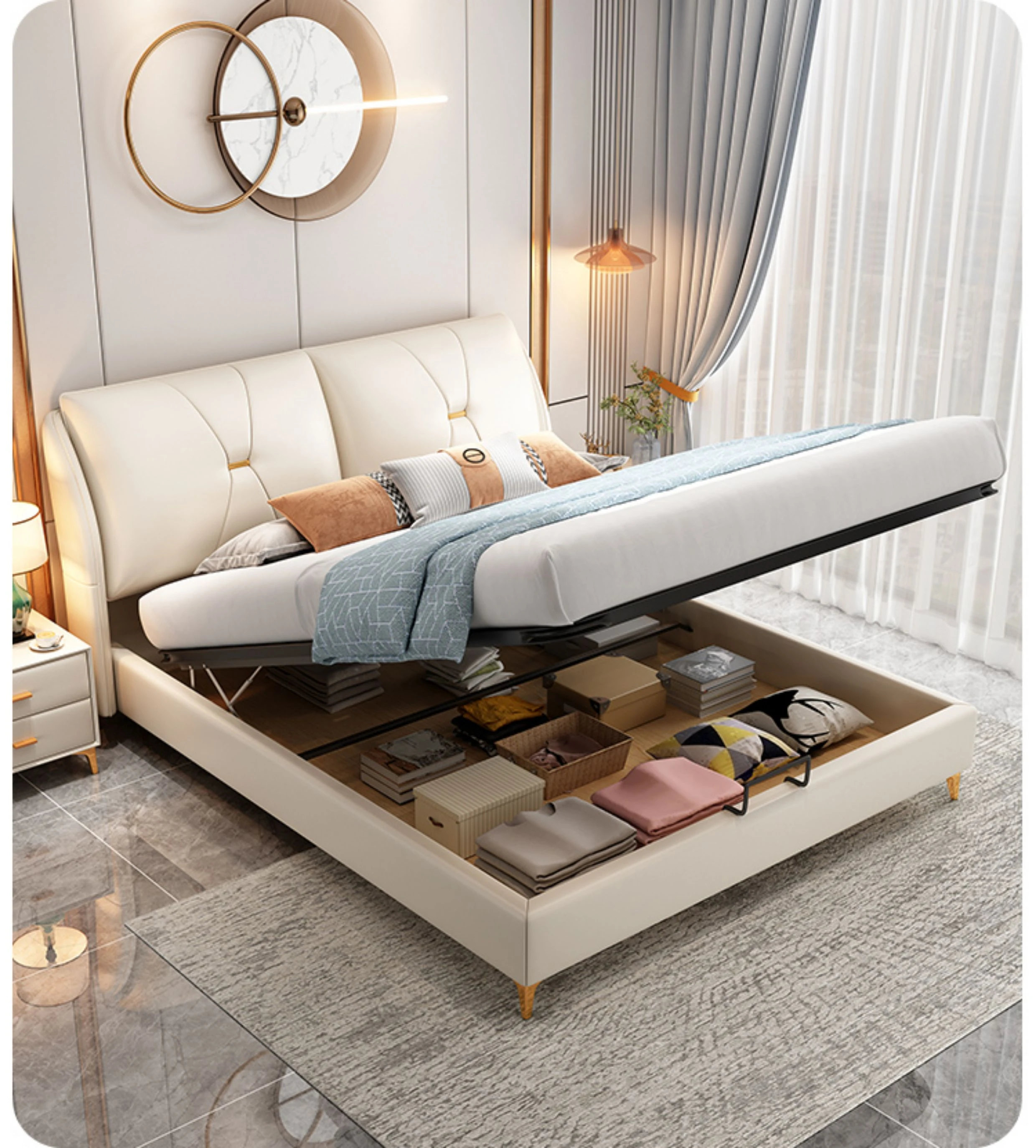 Modern Minimalist Italian-Style Luxury High-Storage Bed for Master Bedroom - 2025 New Arrival Cream Faux Leather Double Bed for Couples
