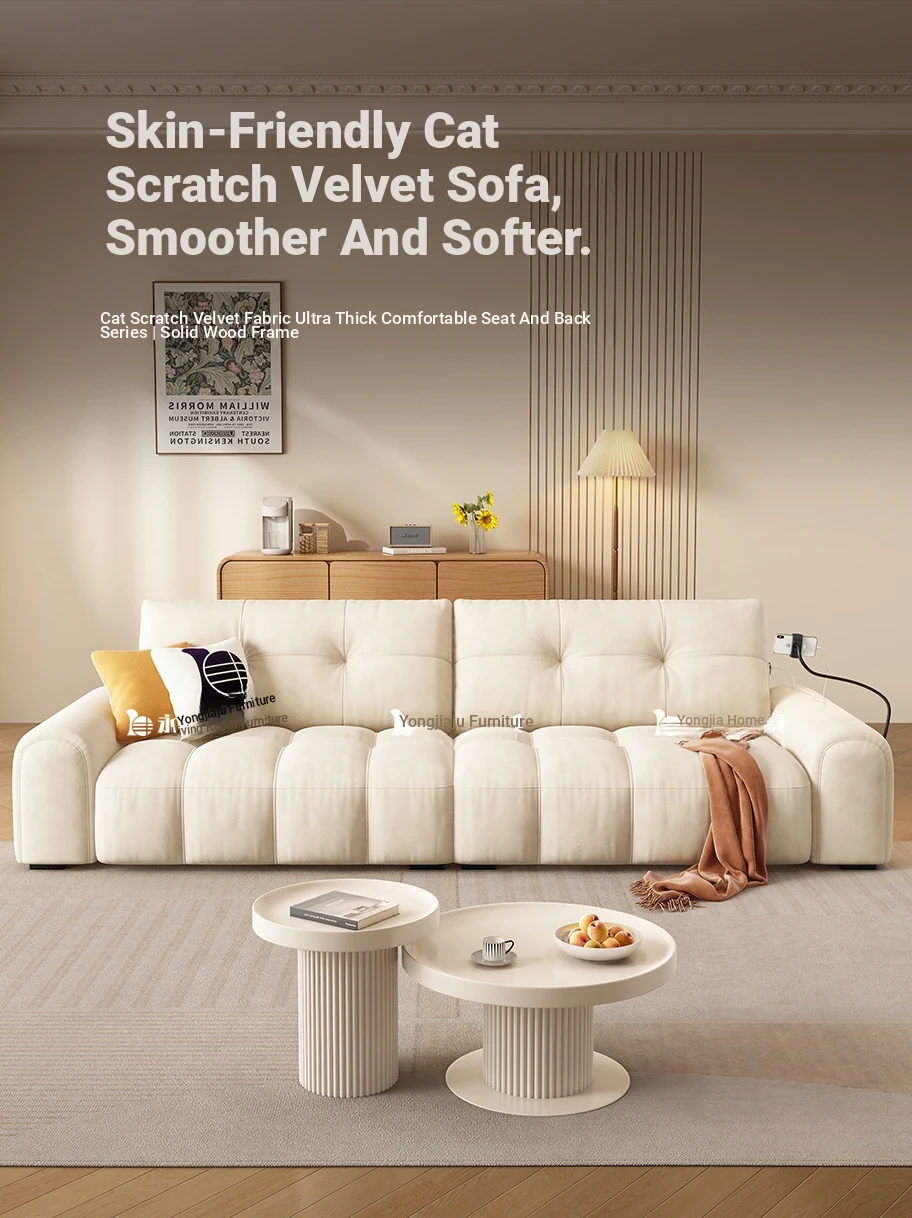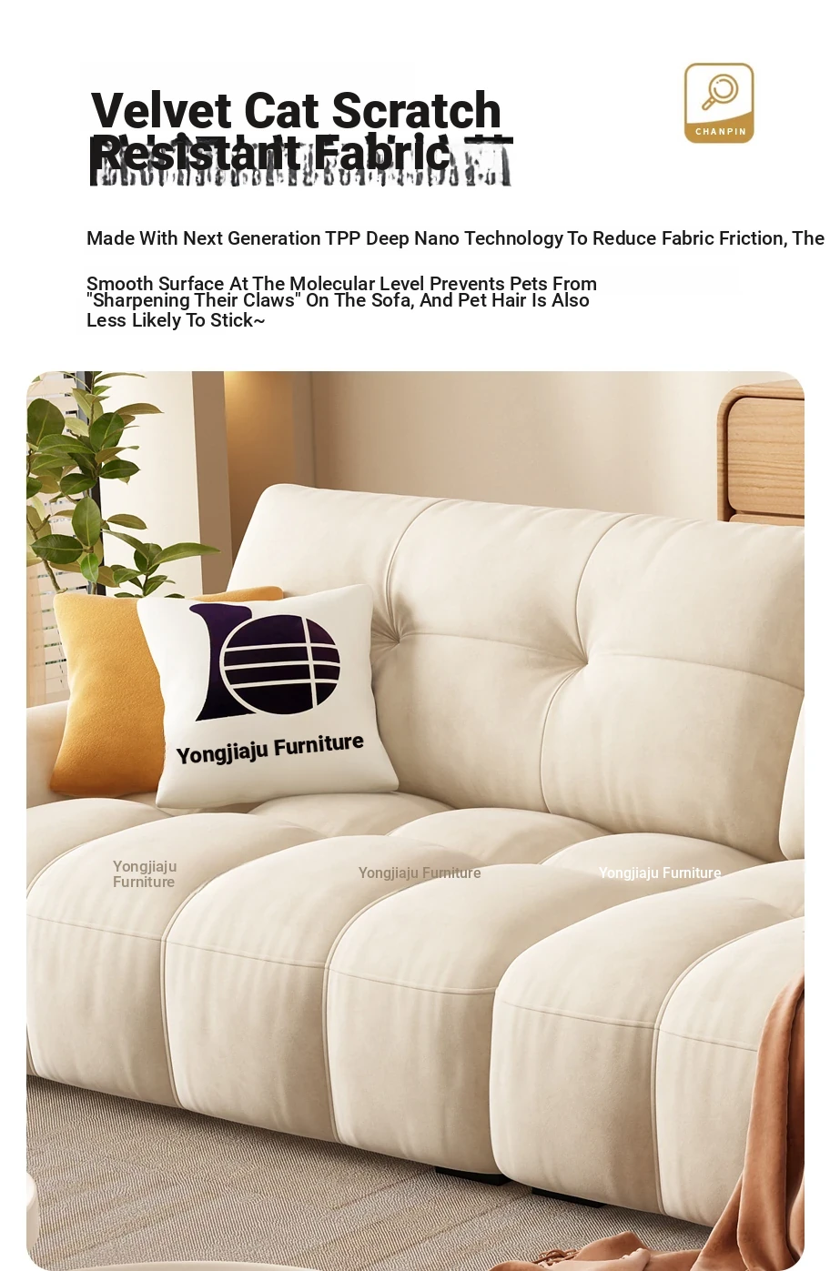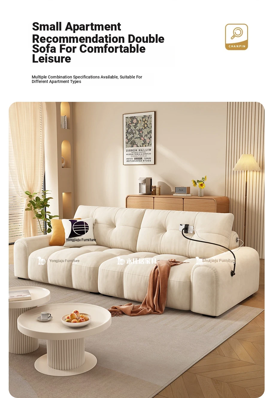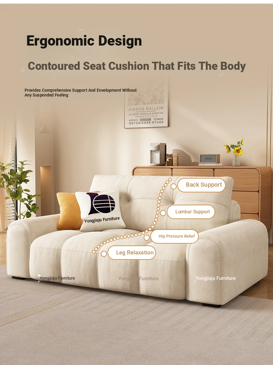 Yuejiaju Creamy Fabric Sofa - Modern Minimalist Design for Small Living Rooms, Featuring Cotton Candy Cloud Texture and Cat Scratch-Resistant Upholstery, with a Touch of Real Leather. Perfect for Cozy Spaces!