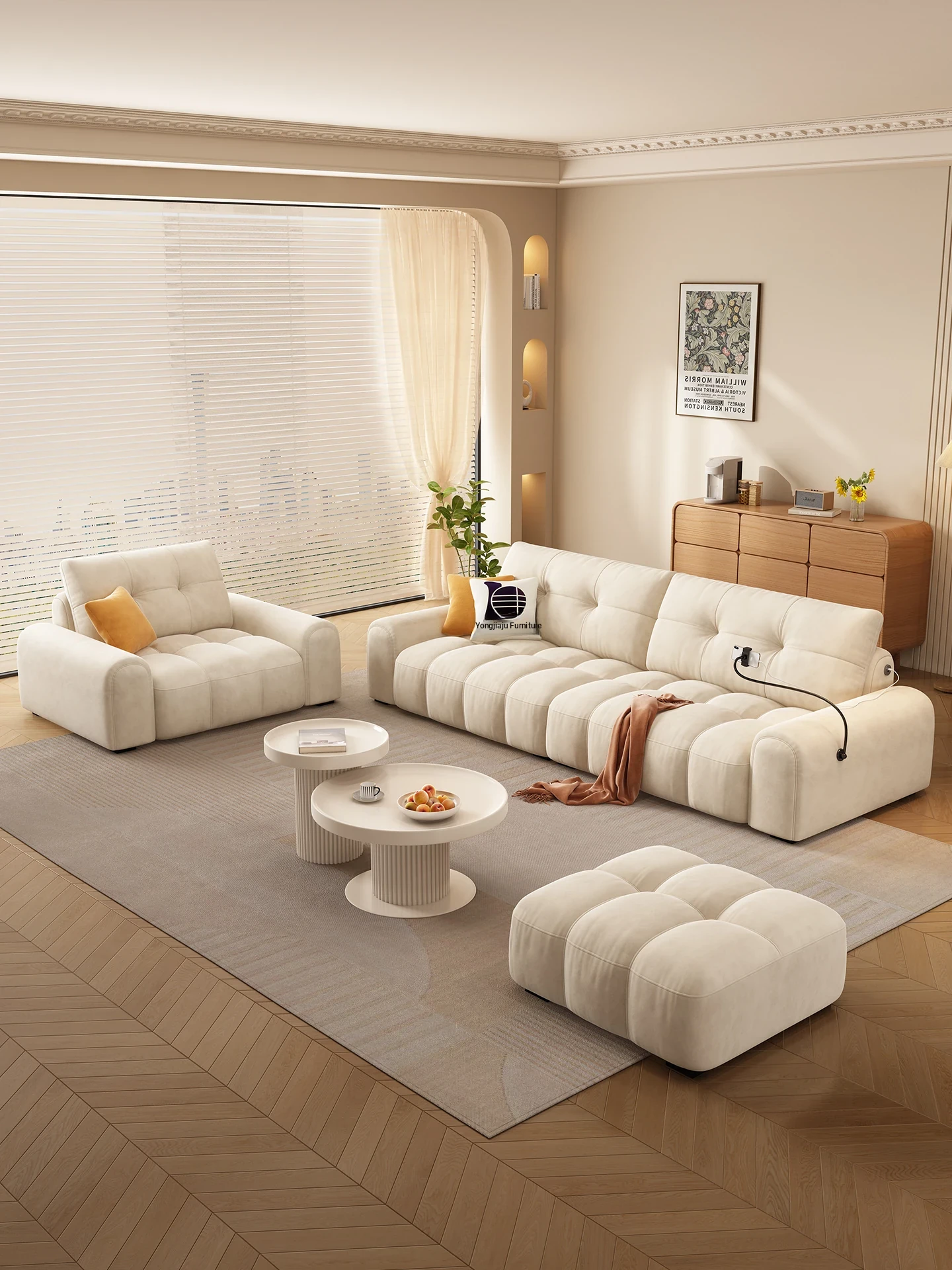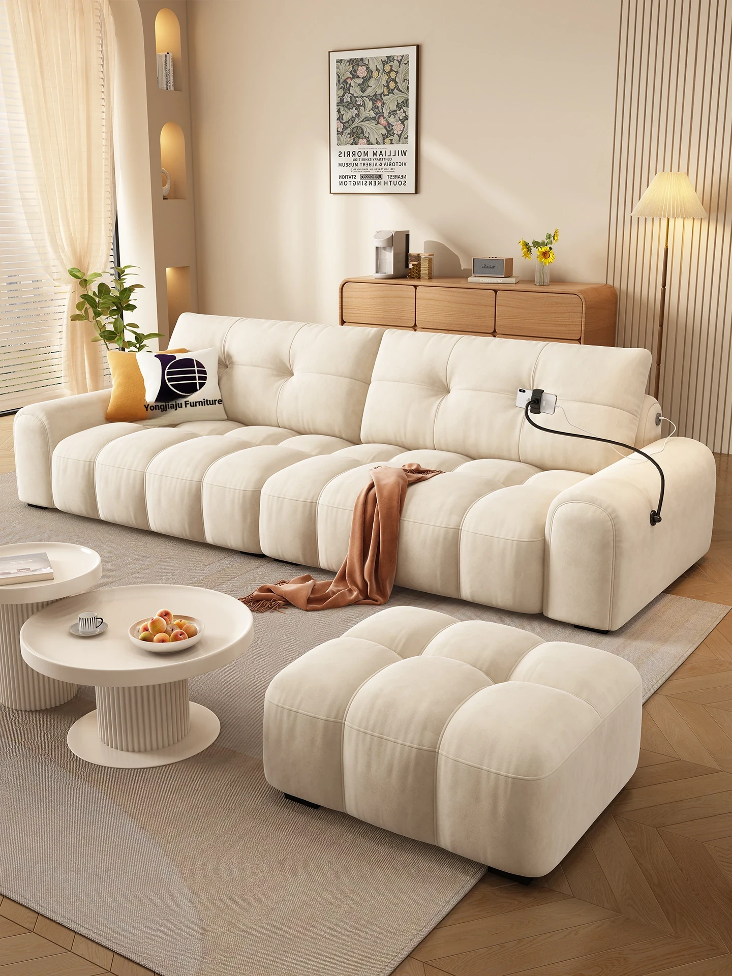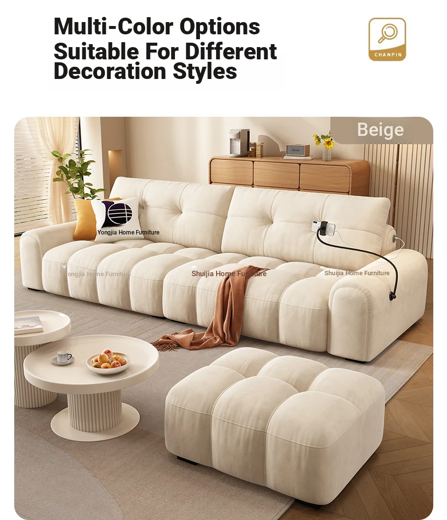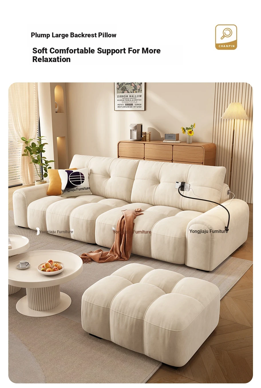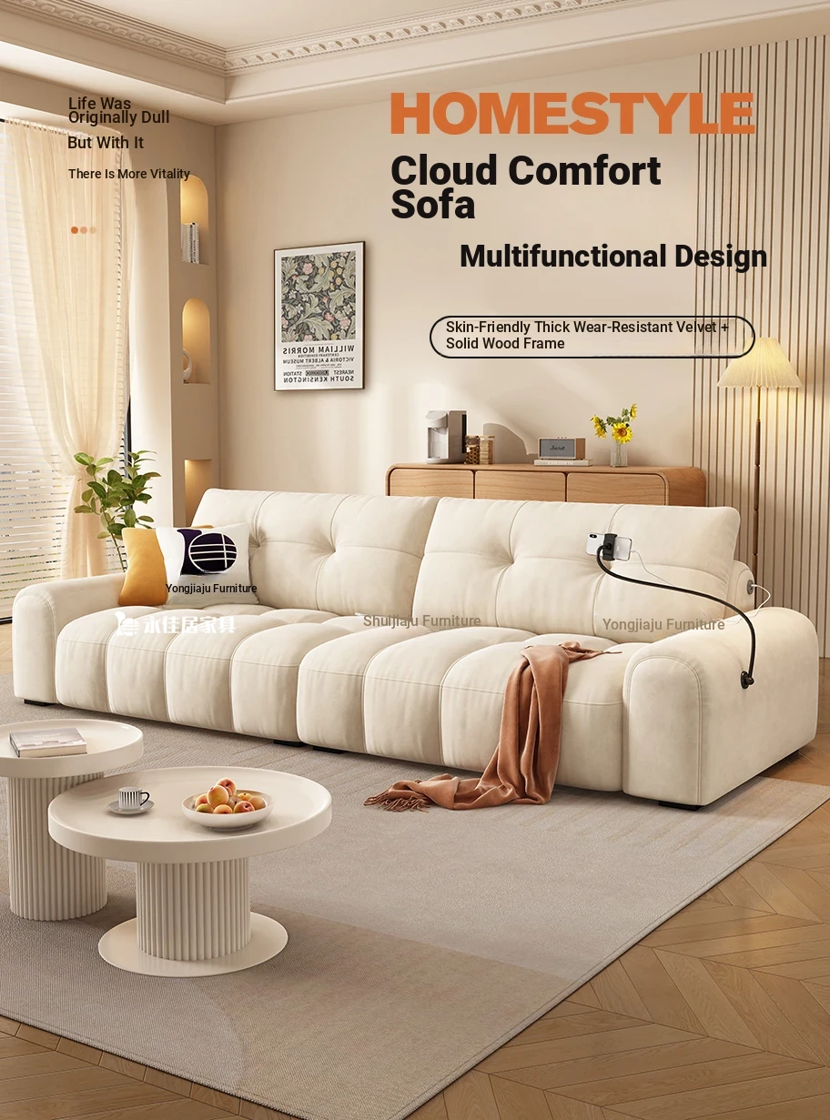 Yuejiaju Creamy Fabric Sofa - Modern Minimalist Design for Small Living Rooms, Featuring Cotton Candy Cloud Texture and Cat Scratch-Resistant Upholstery, with a Touch of Real Leather. Perfect for Cozy Spaces!