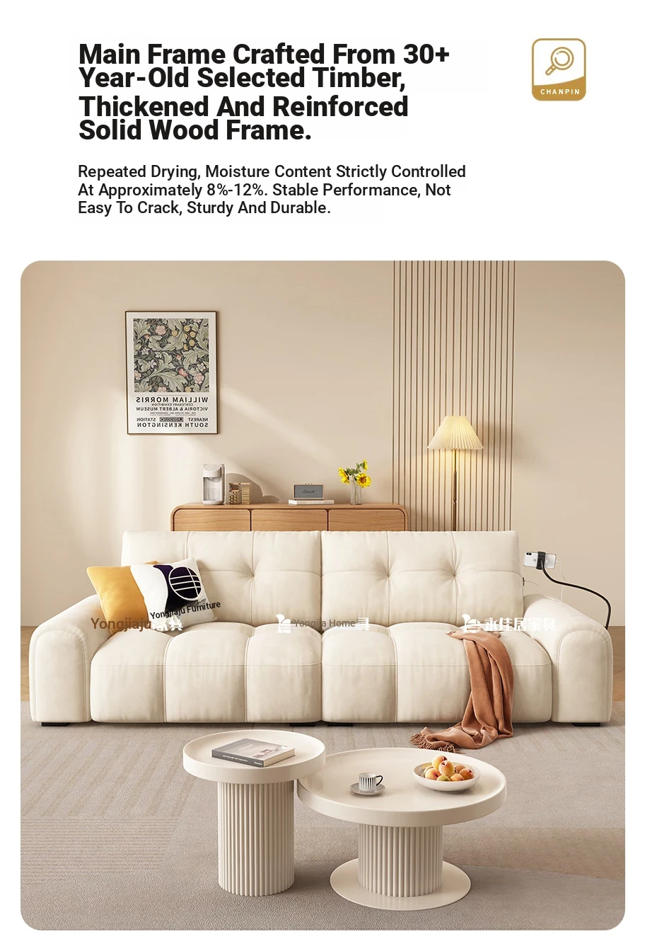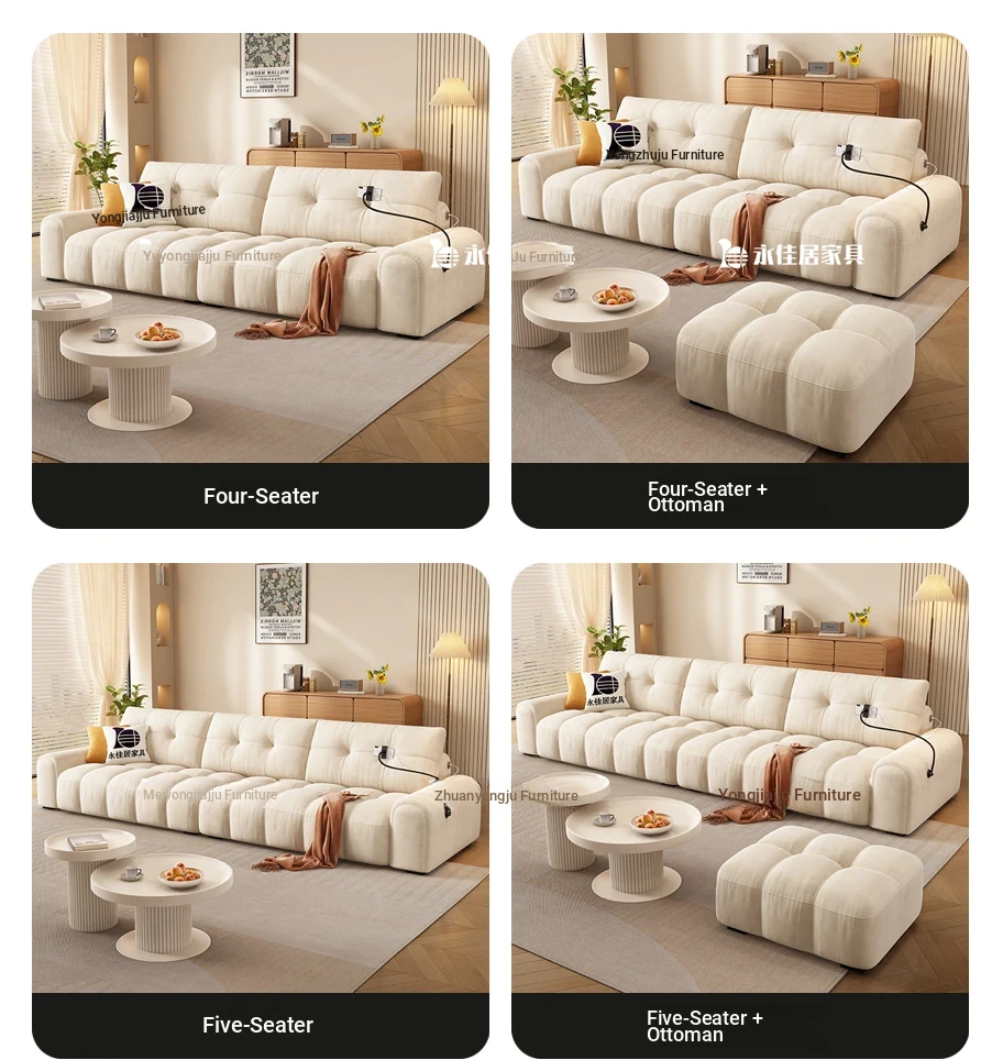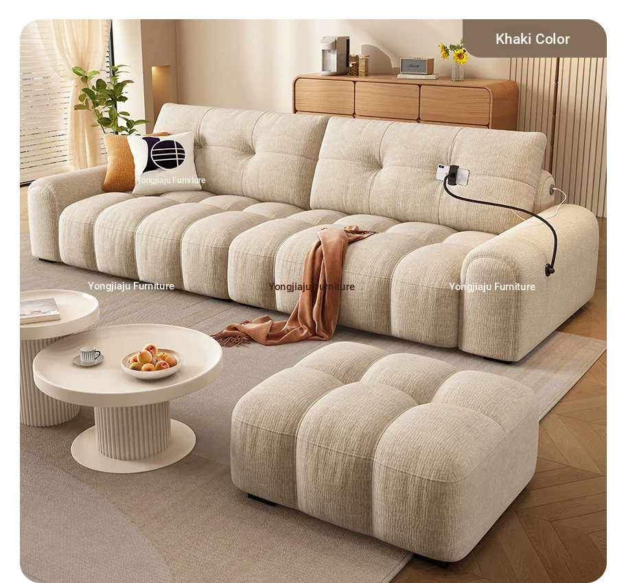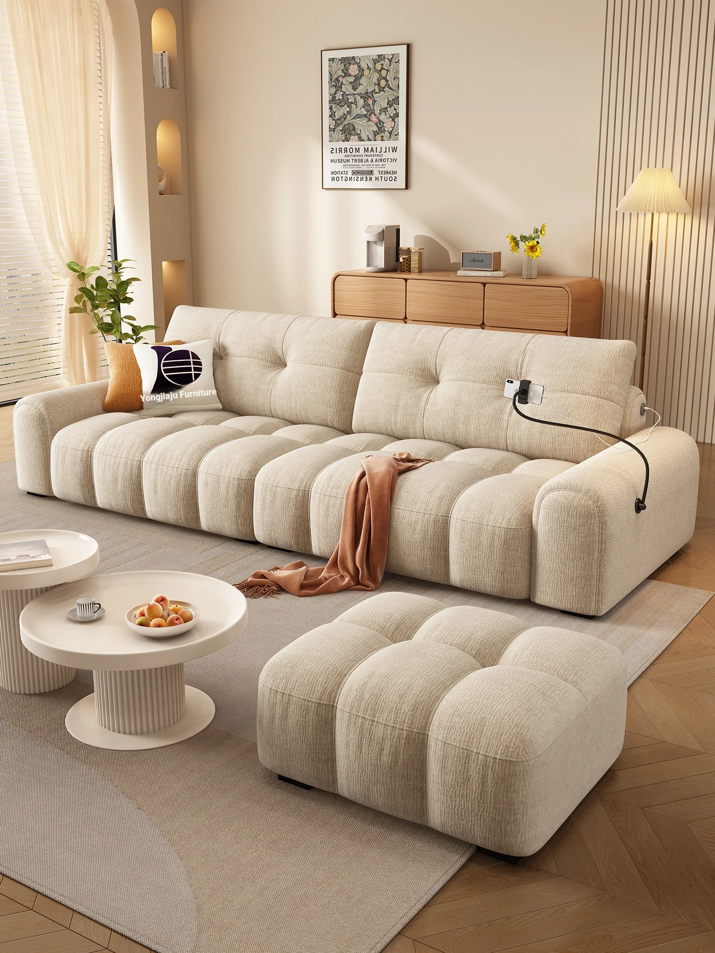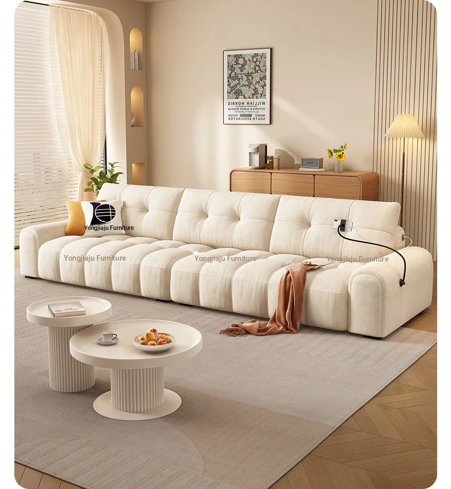 Yuejiaju Creamy Fabric Sofa - Modern Minimalist Design for Small Living Rooms, Featuring Cotton Candy Cloud Texture and Cat Scratch-Resistant Upholstery, with a Touch of Real Leather. Perfect for Cozy Spaces!