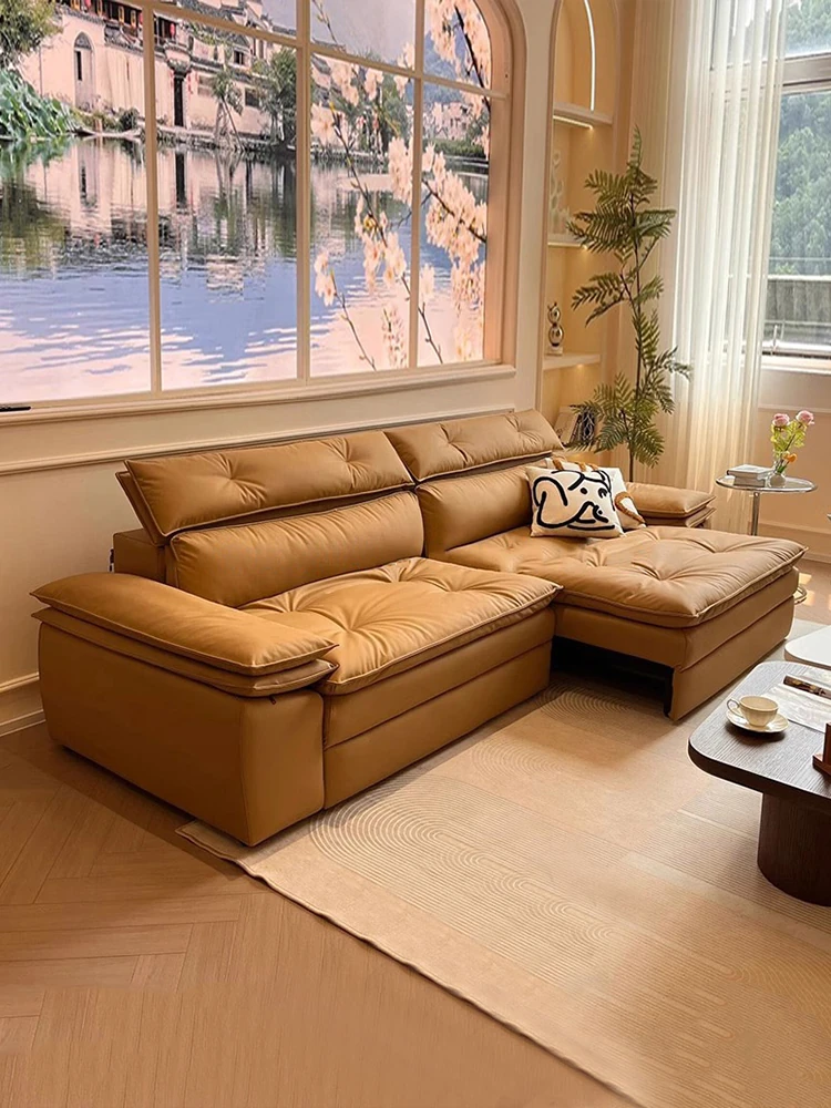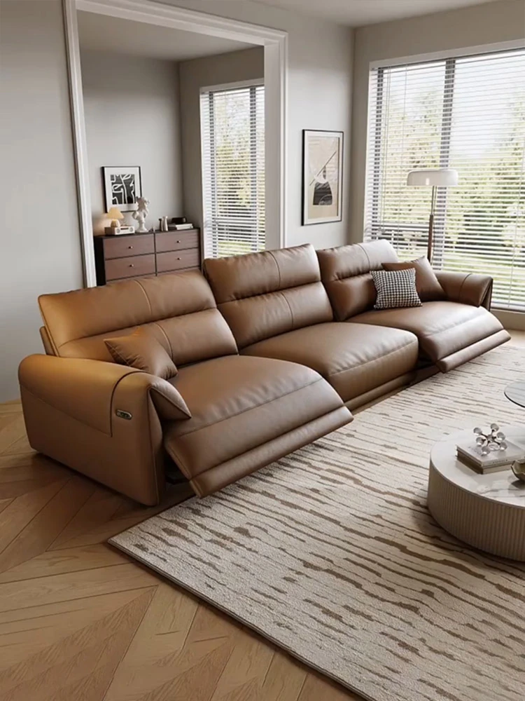 2025 New Minimalist Real Leather Electric Reclining Sofa Bed - Natural Wood Cream Finish, Adjustable for Ultimate Comfort in Your Living Room