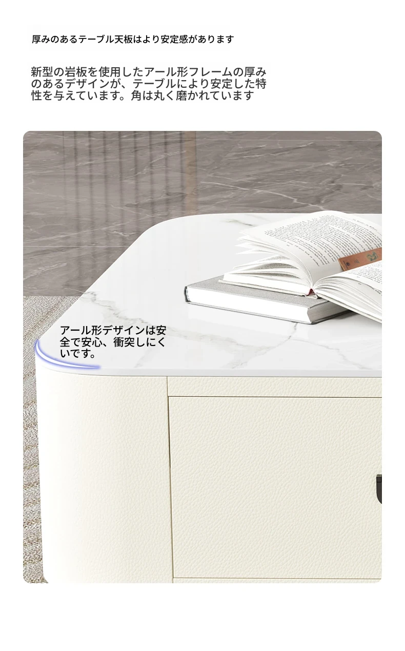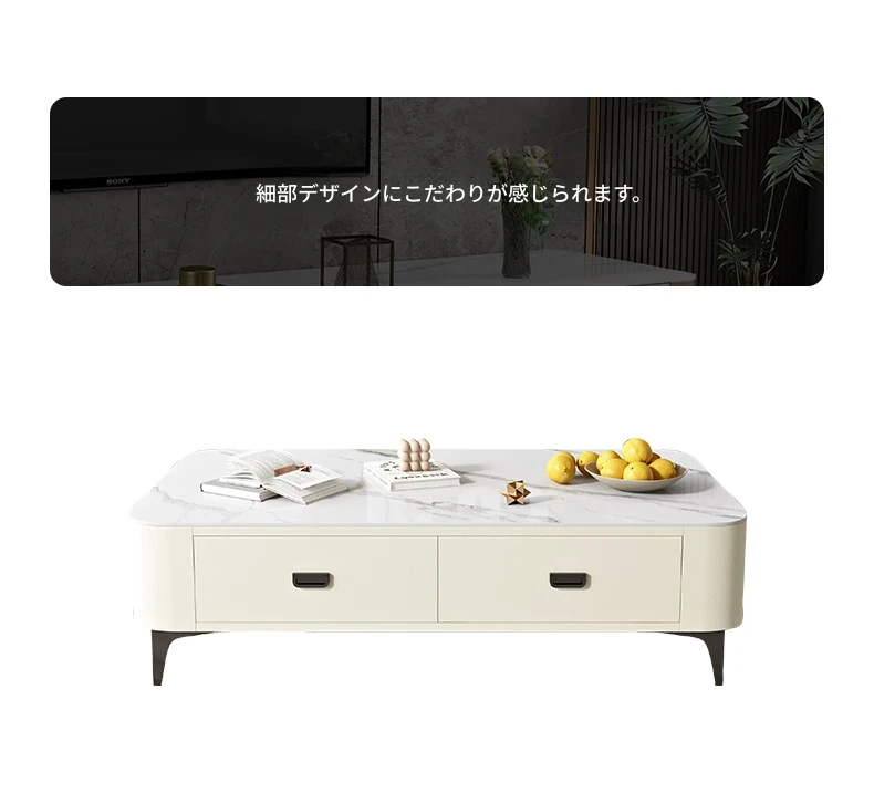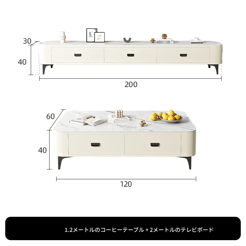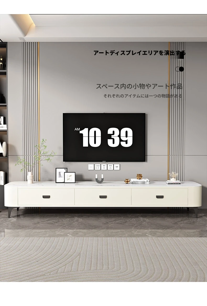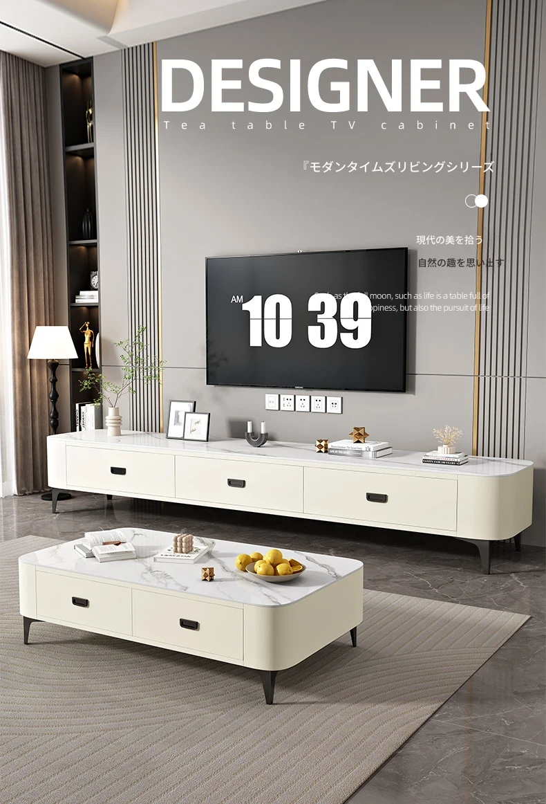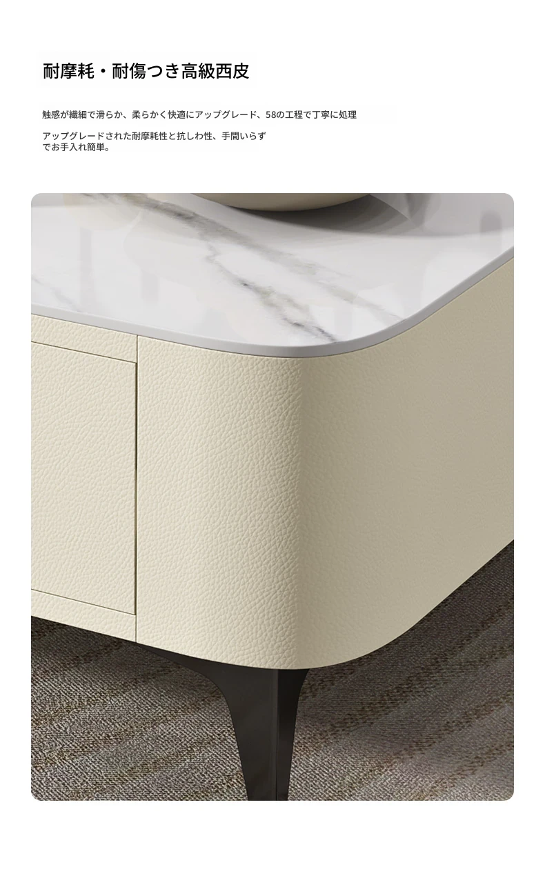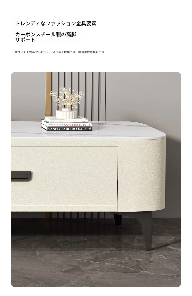 ミニマルでラグジュアリーな2024年新作!キャットスクラッチ対応の岩板製コーヒーテーブル兼TVキャビネット。小さなリビングやおしゃれな空間にぴったりなクリーム風デザイン!