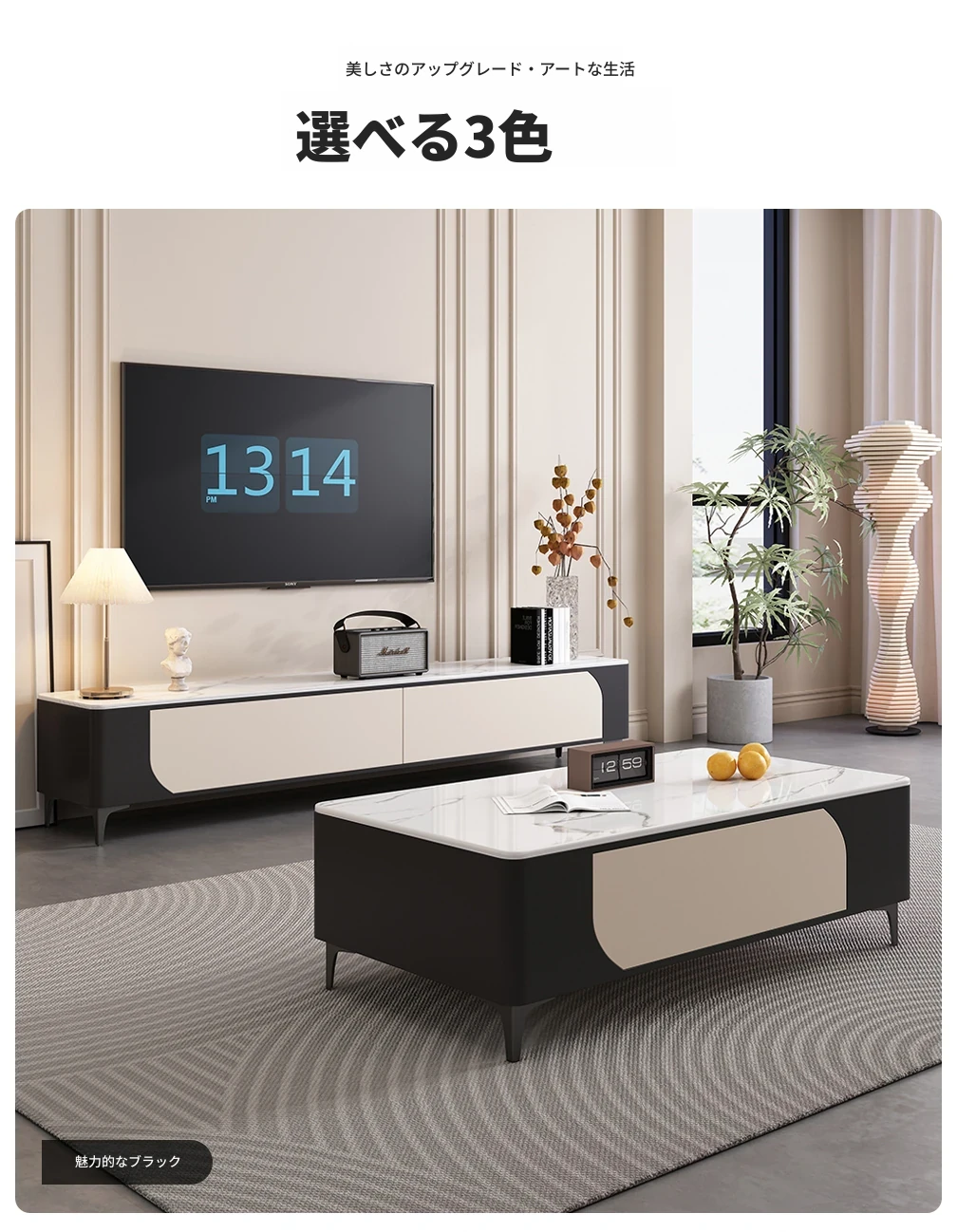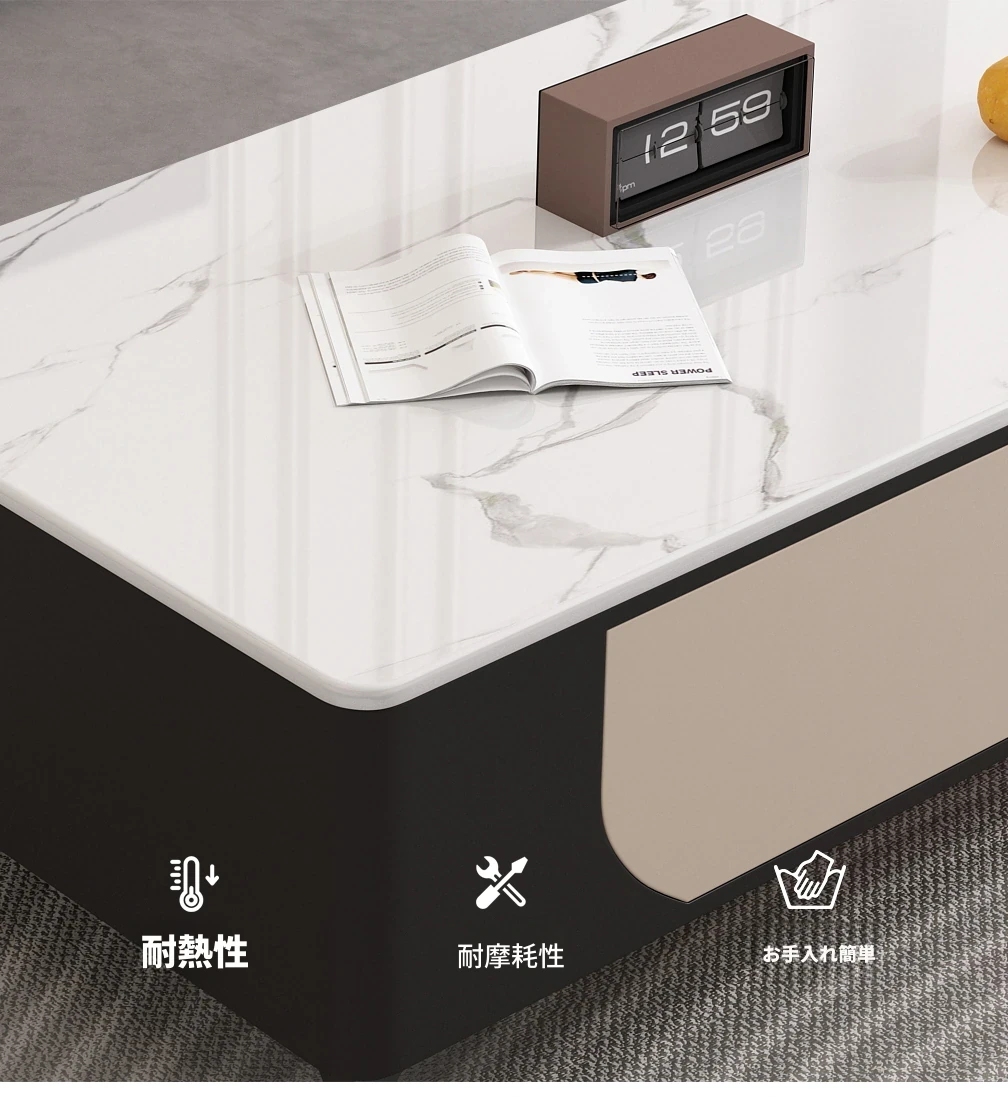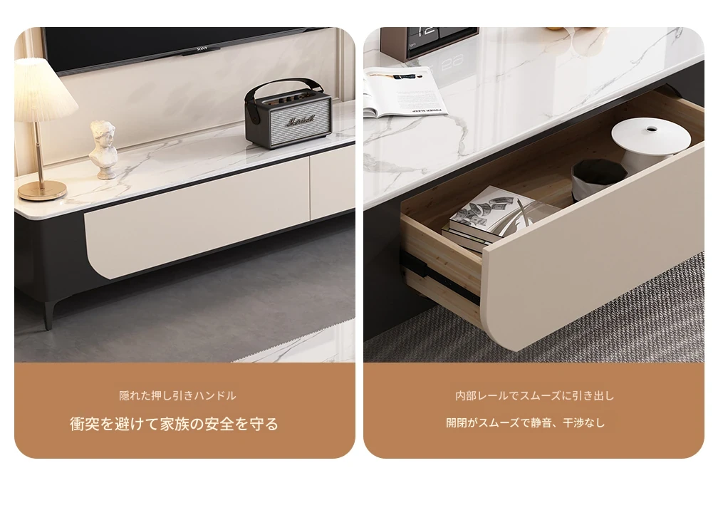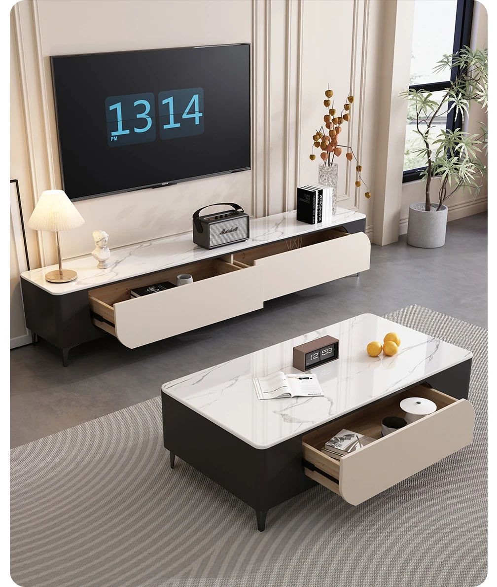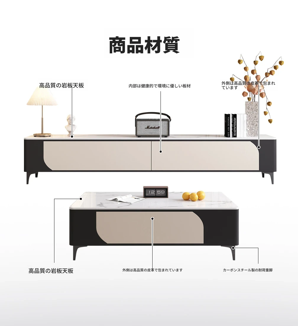 ミニマルでラグジュアリーな2025年モデル、猫の爪を気にしない皮革仕上げのリビング用クリーム風茶卓&テレビボード。スタイリッシュなデザインで、あなたのリビングを格上げ!