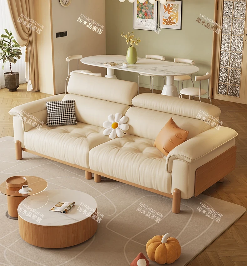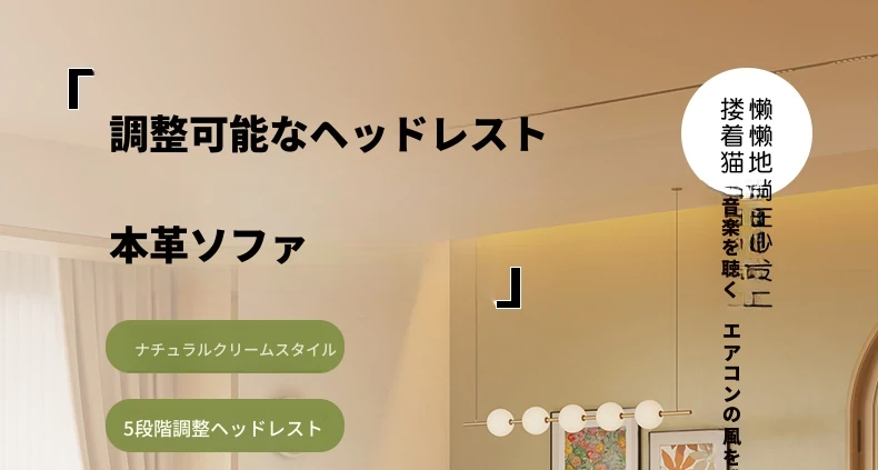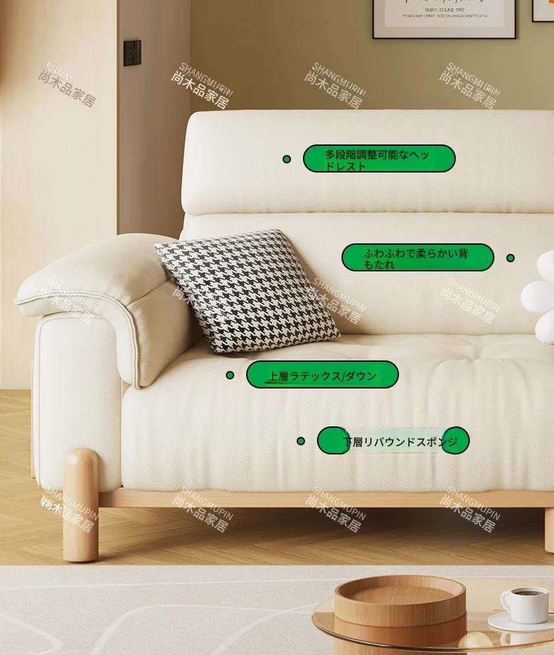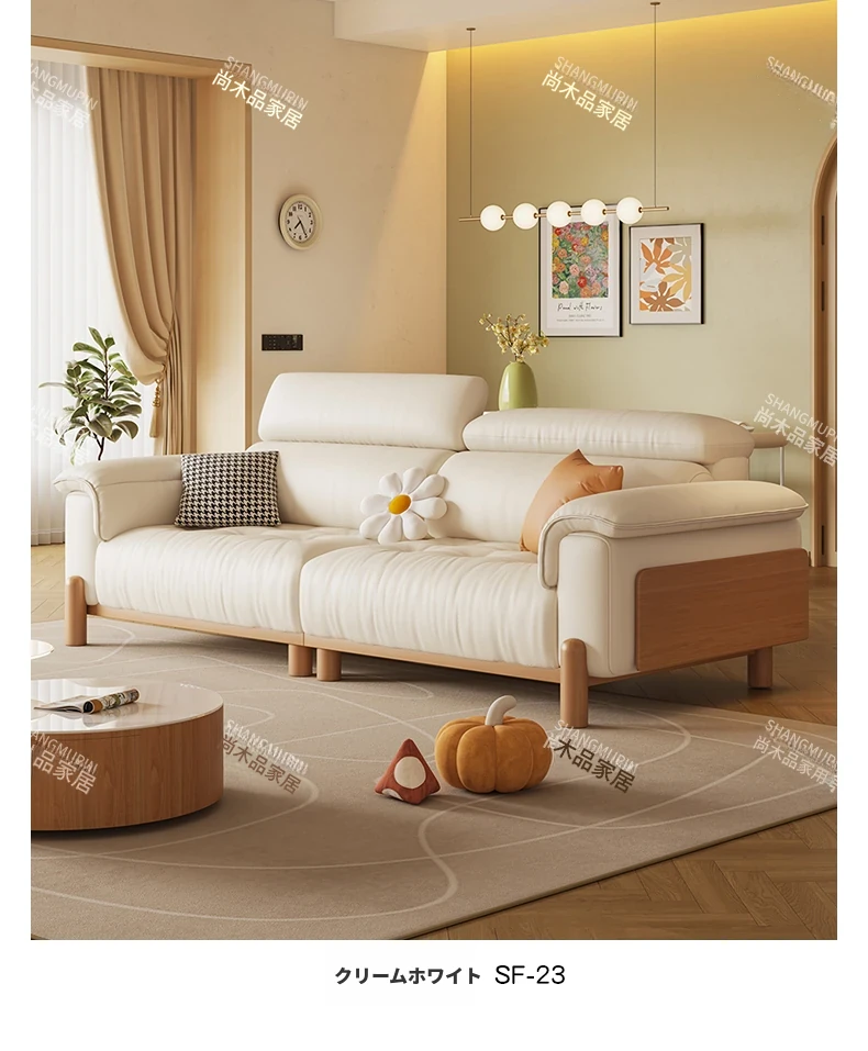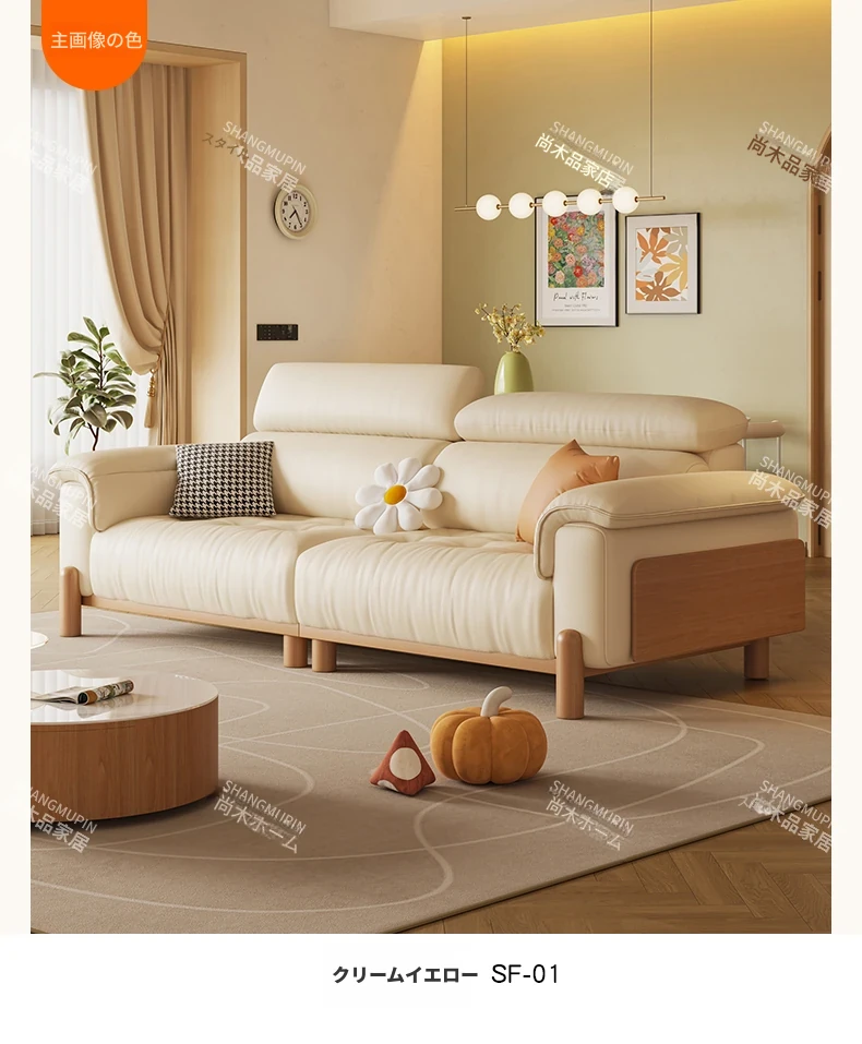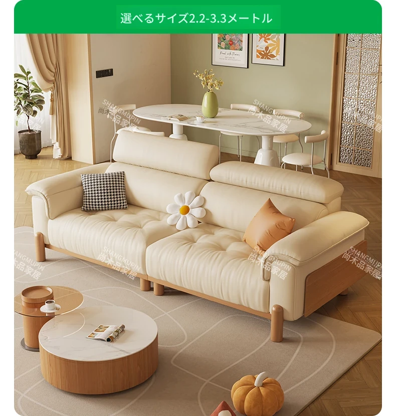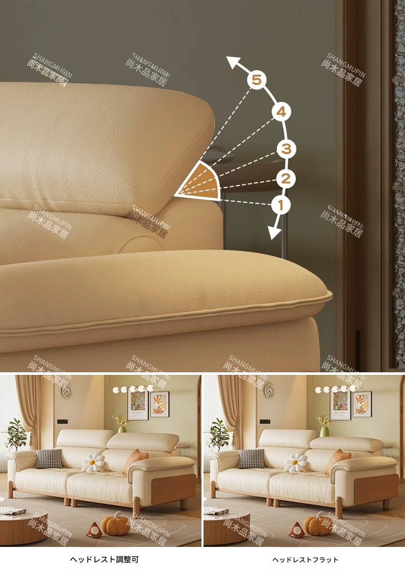 クリーム風リビングルーム用本革ソファ adjustable ヘッドレスト付き、小型住宅に最適なモダンシンプルデザインのソファ。高級感あふれる本皮を使用し、快適さとスタイリッシュさを両立!