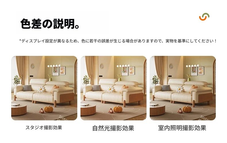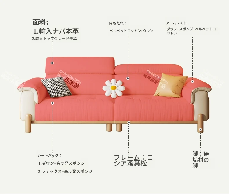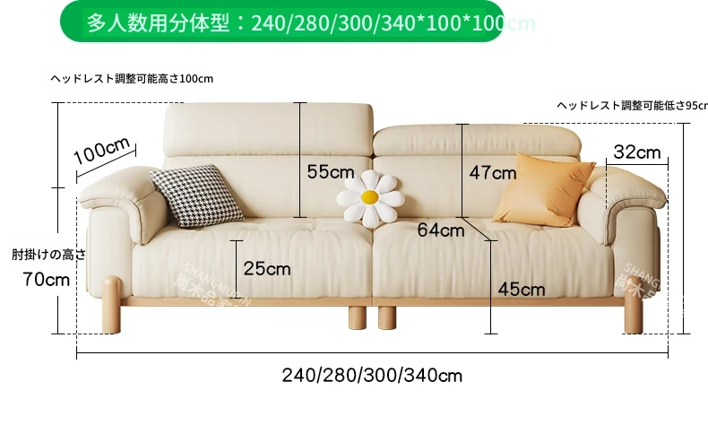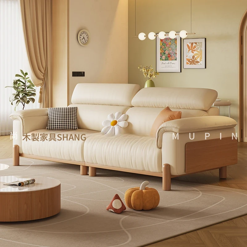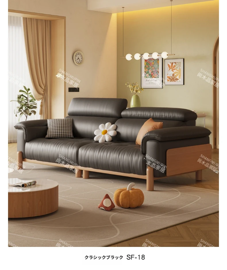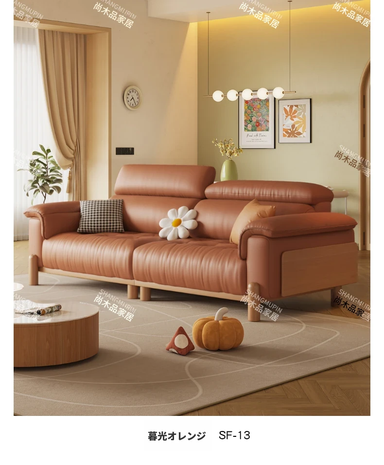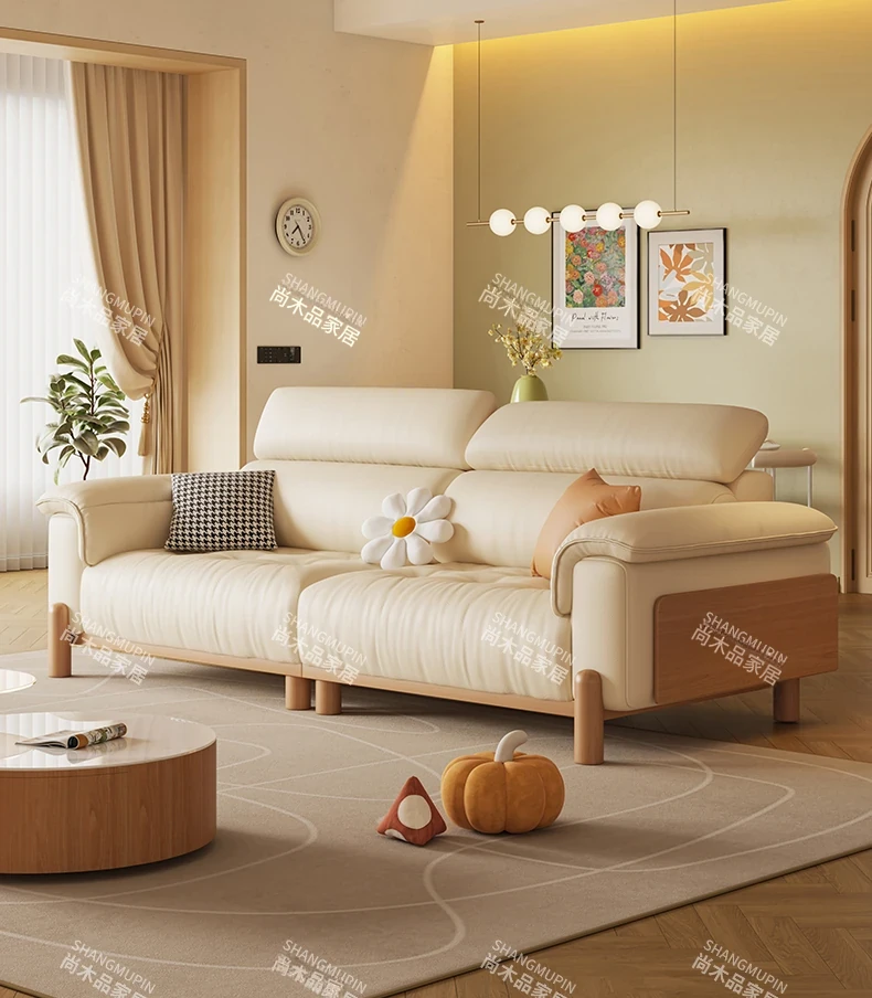 クリーム風リビングルーム用本革ソファ adjustable ヘッドレスト付き、小型住宅に最適なモダンシンプルデザインのソファ。高級感あふれる本皮を使用し、快適さとスタイリッシュさを両立!