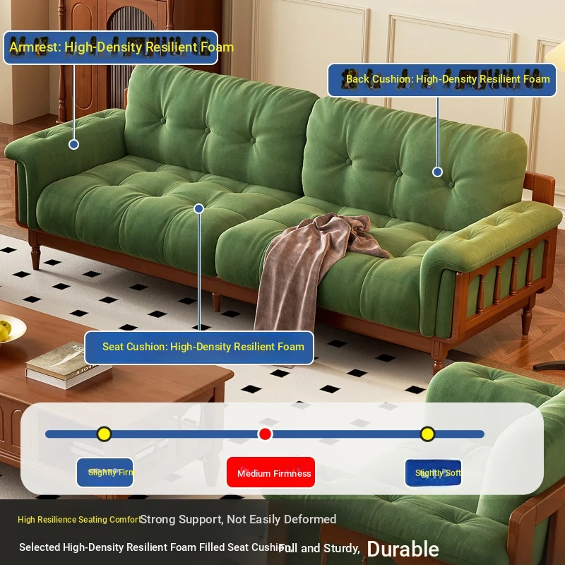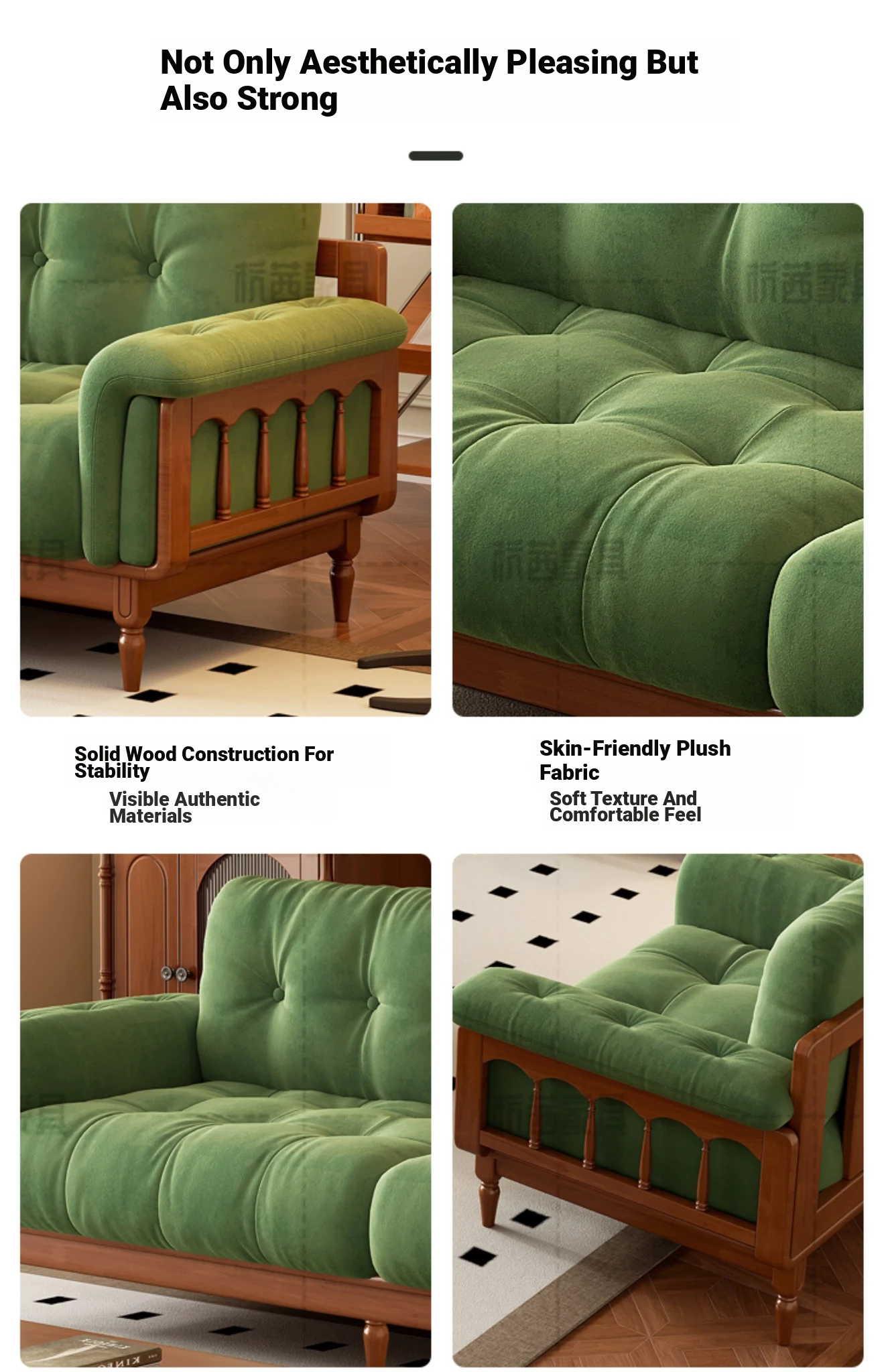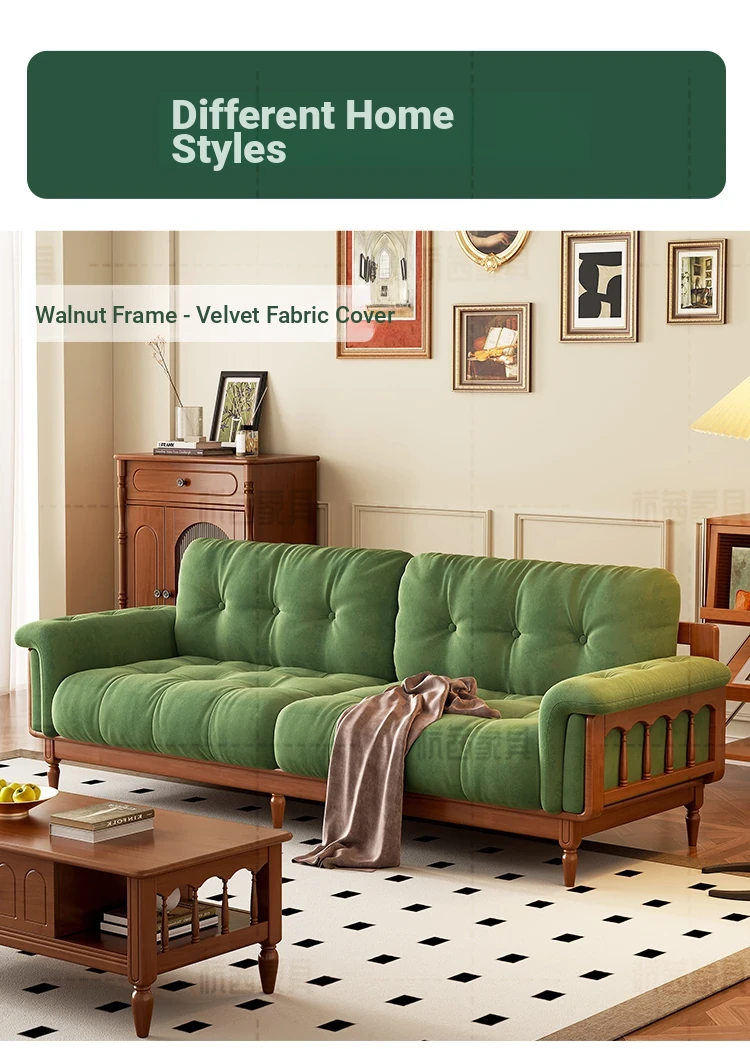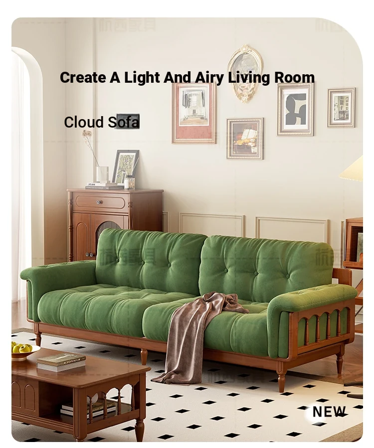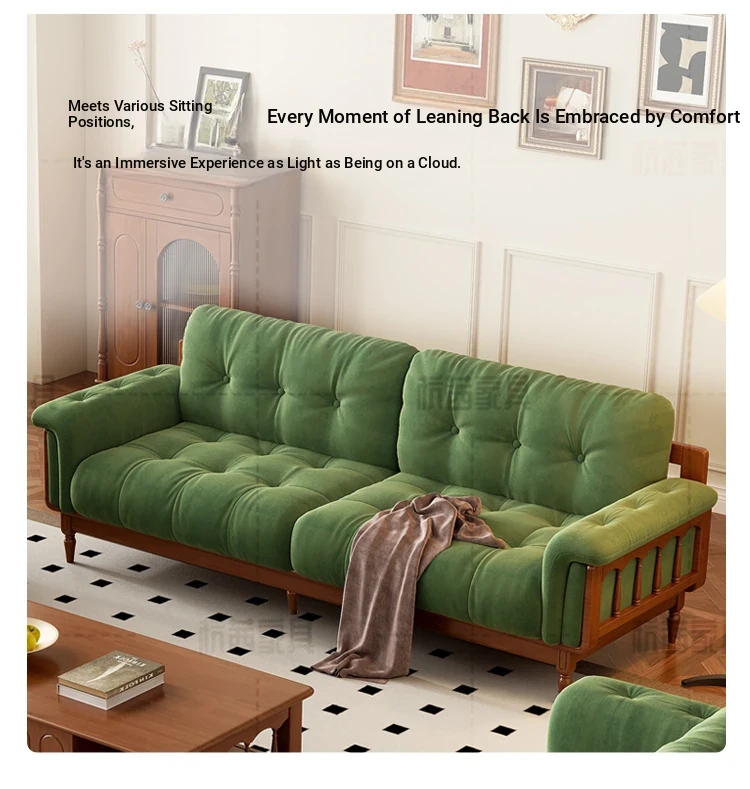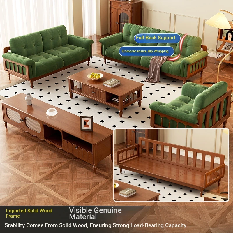 French Vintage Solid Wood Sofa Set for Small Spaces - Retro Walnut Velvet Cloud Sofa for Living Room 2025