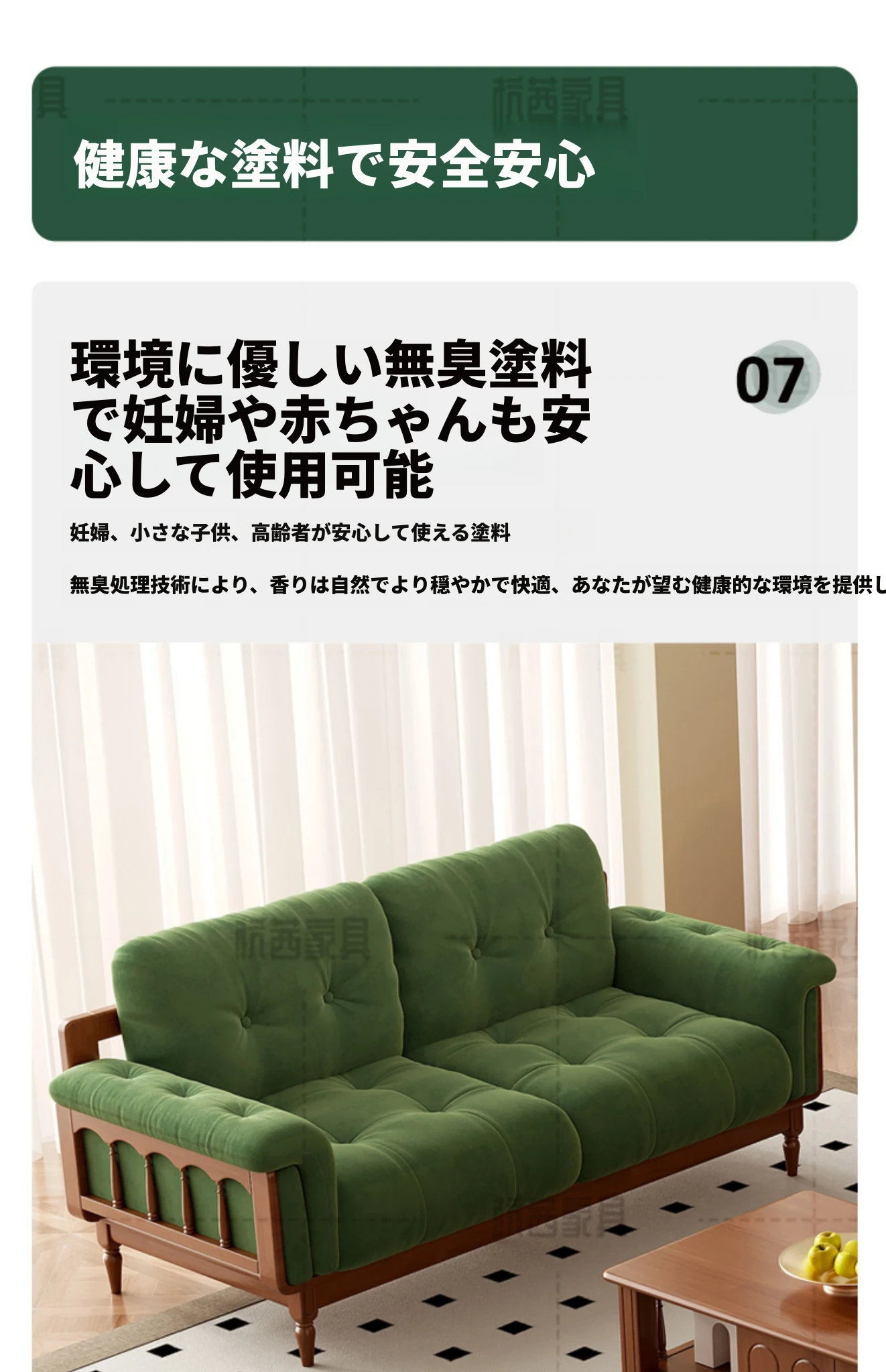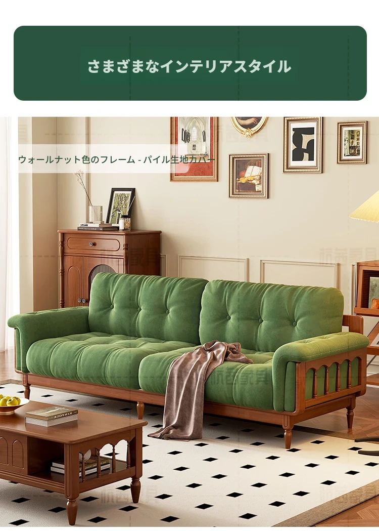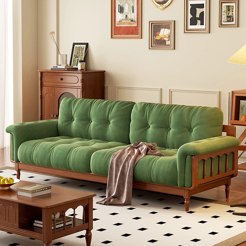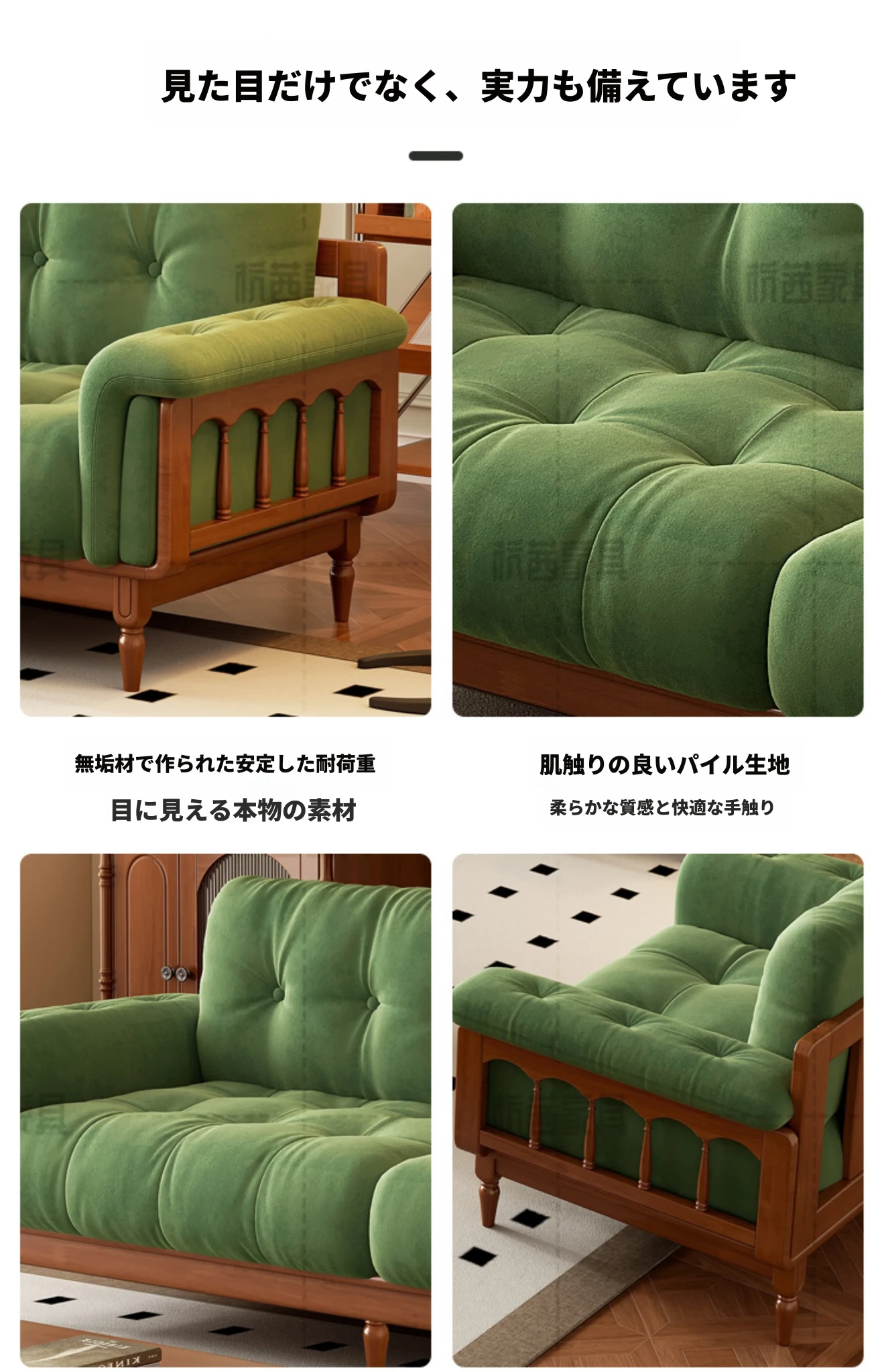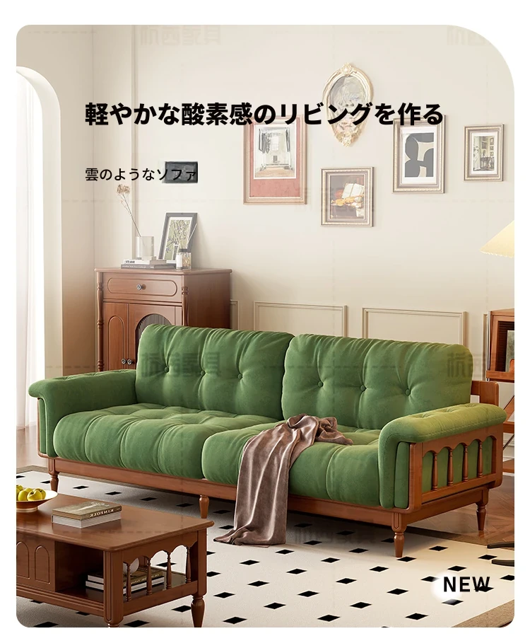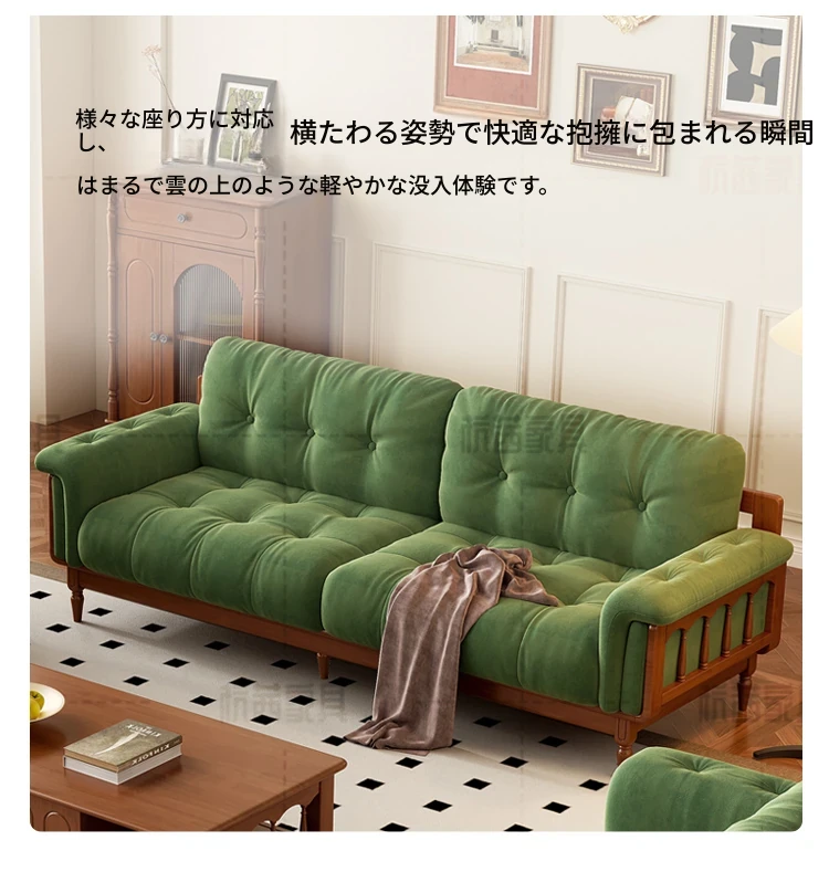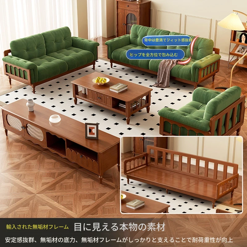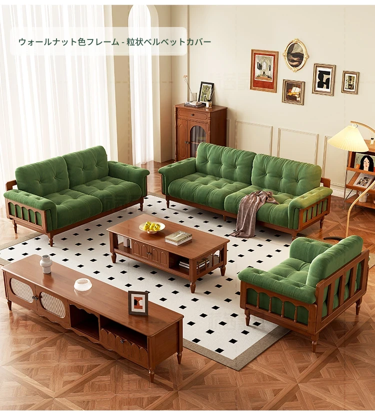 フレンチスタイルの無垢材ソファ 小型住宅向け ヴィンテージ2025リビング家具セット レトロなウォルナット色 ベルベット雲ソファで、心地よい空間を演出!