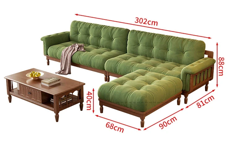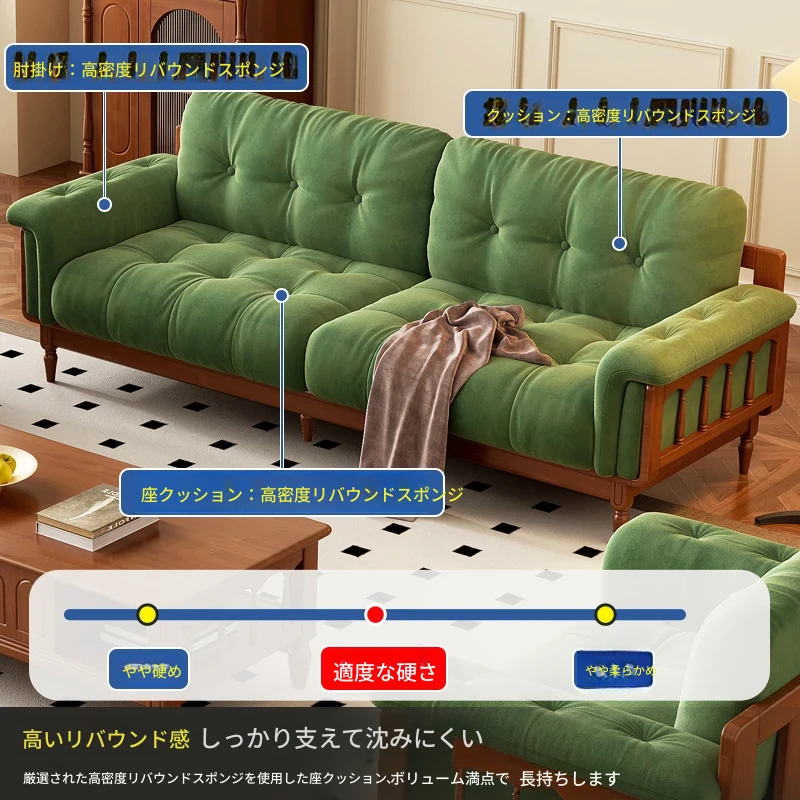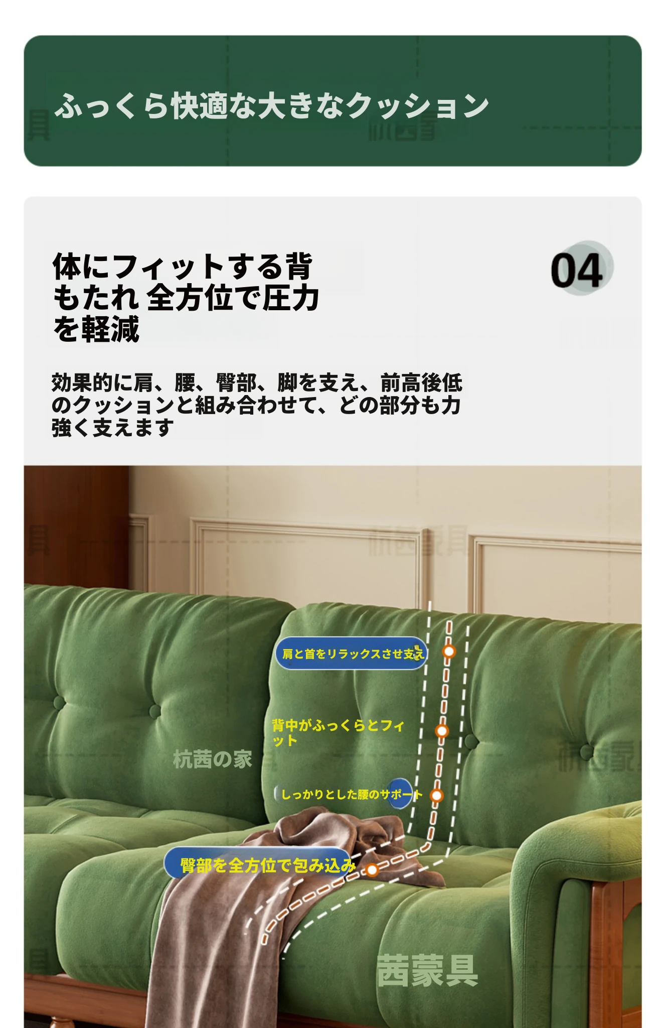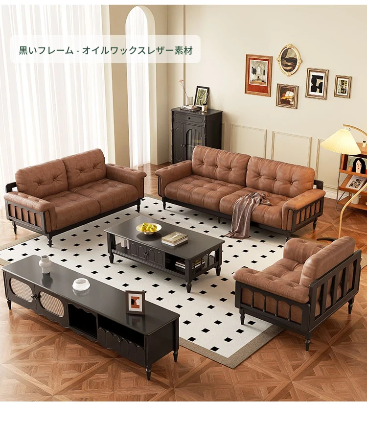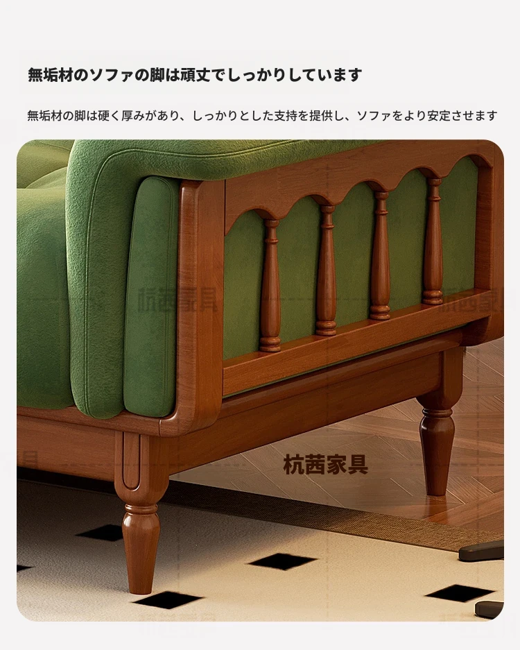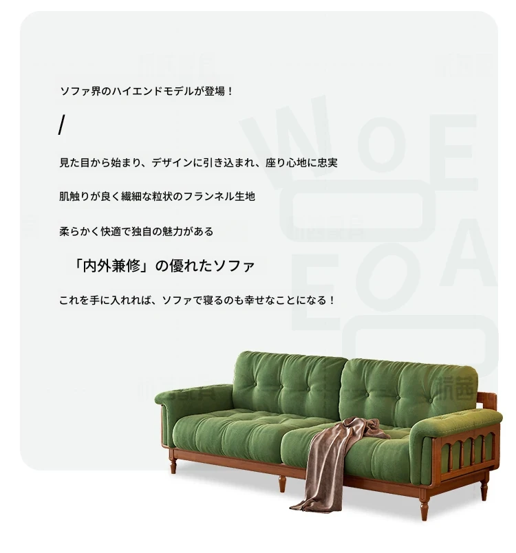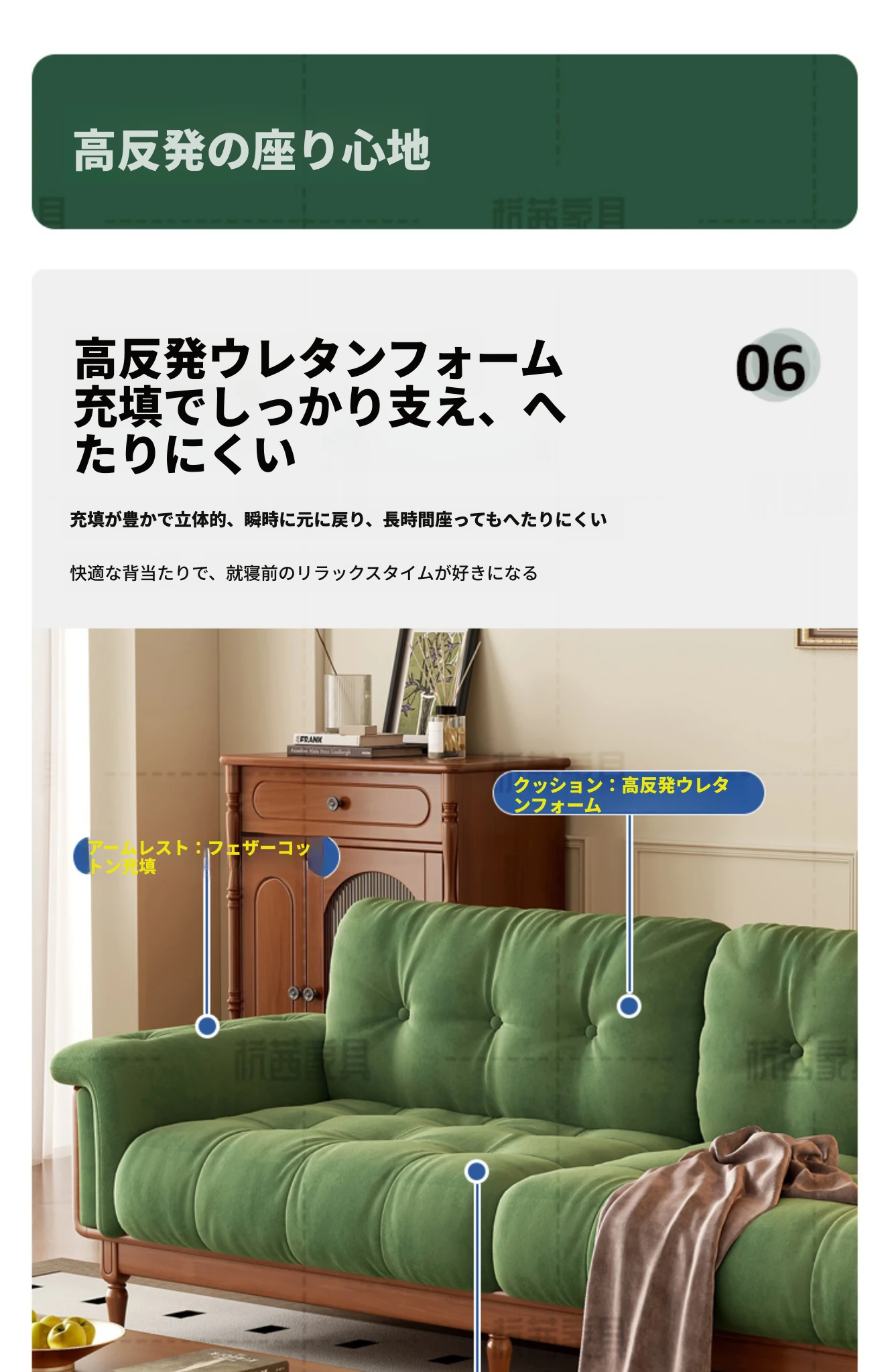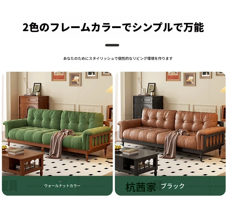 フレンチスタイルの無垢材ソファ 小型住宅向け ヴィンテージ2025リビング家具セット レトロなウォルナット色 ベルベット雲ソファで、心地よい空間を演出!