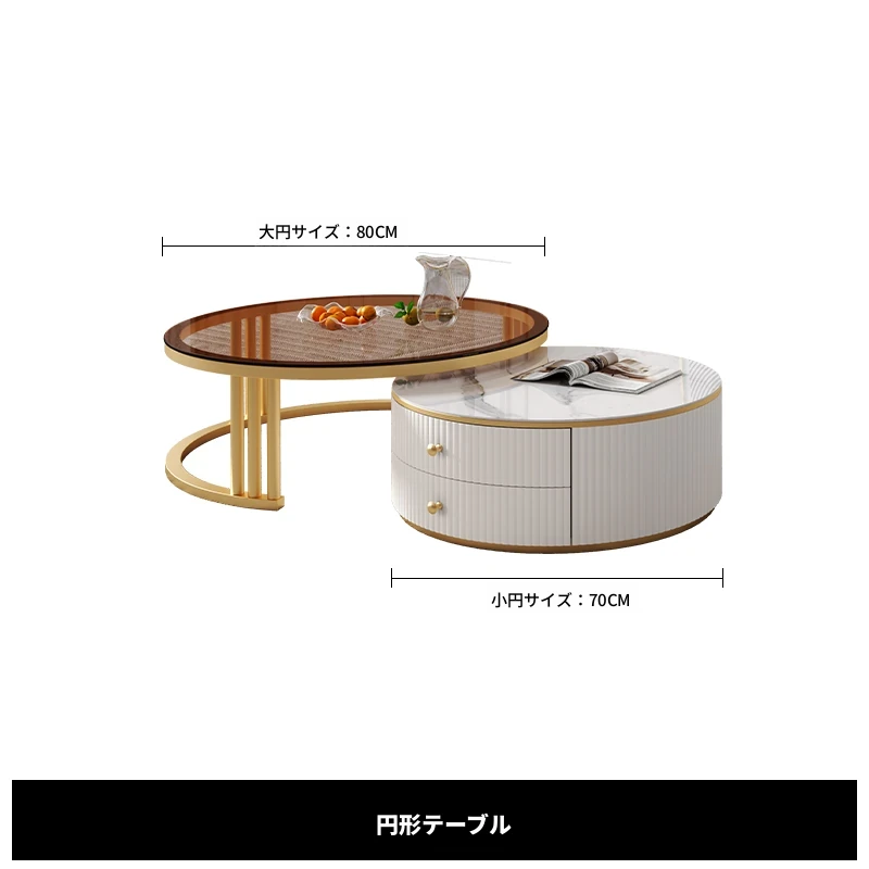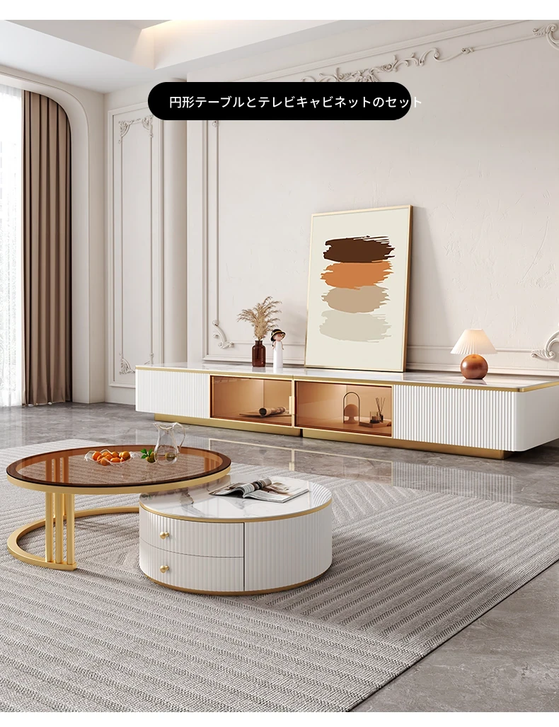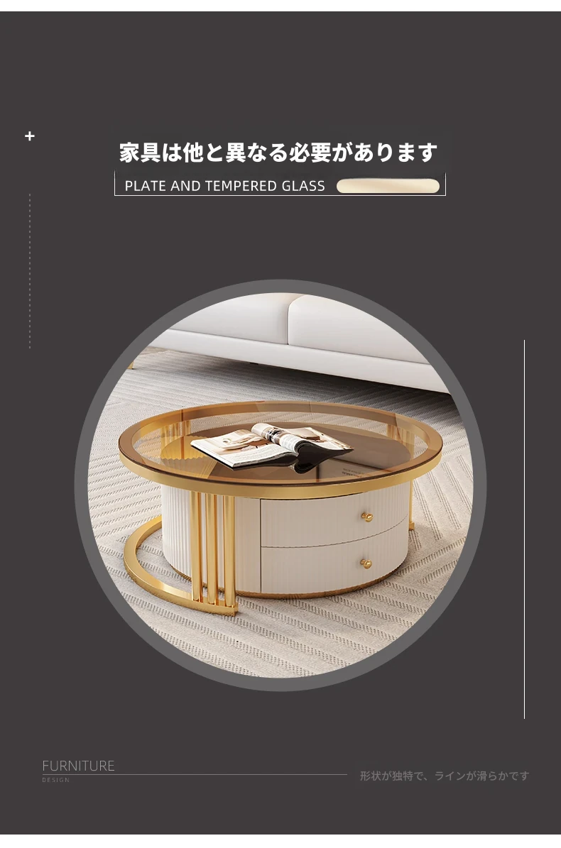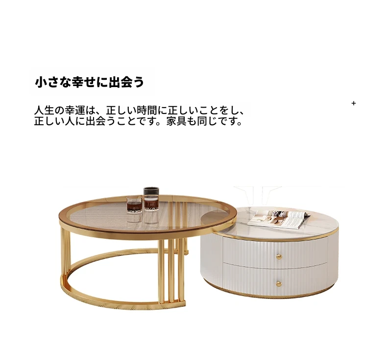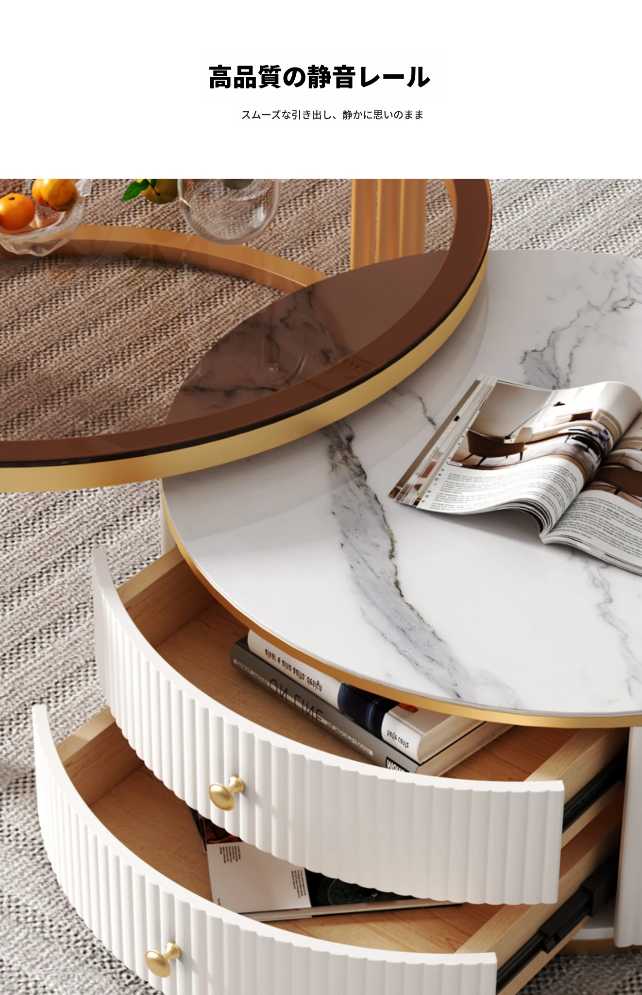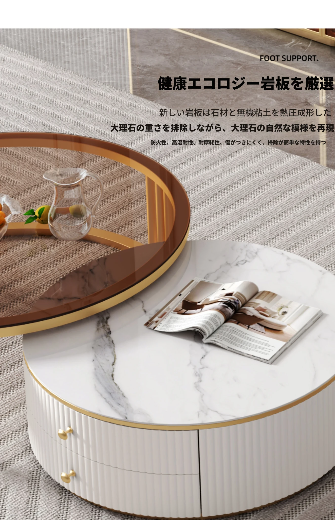 イタリアンラグジュアリーなクリーム風キャットクローラーカラーのラウンドコーヒーテーブル。岩板と強化ガラスを使用し、リビングルームにぴったりのスタイリッシュで移動可能なデザイン!