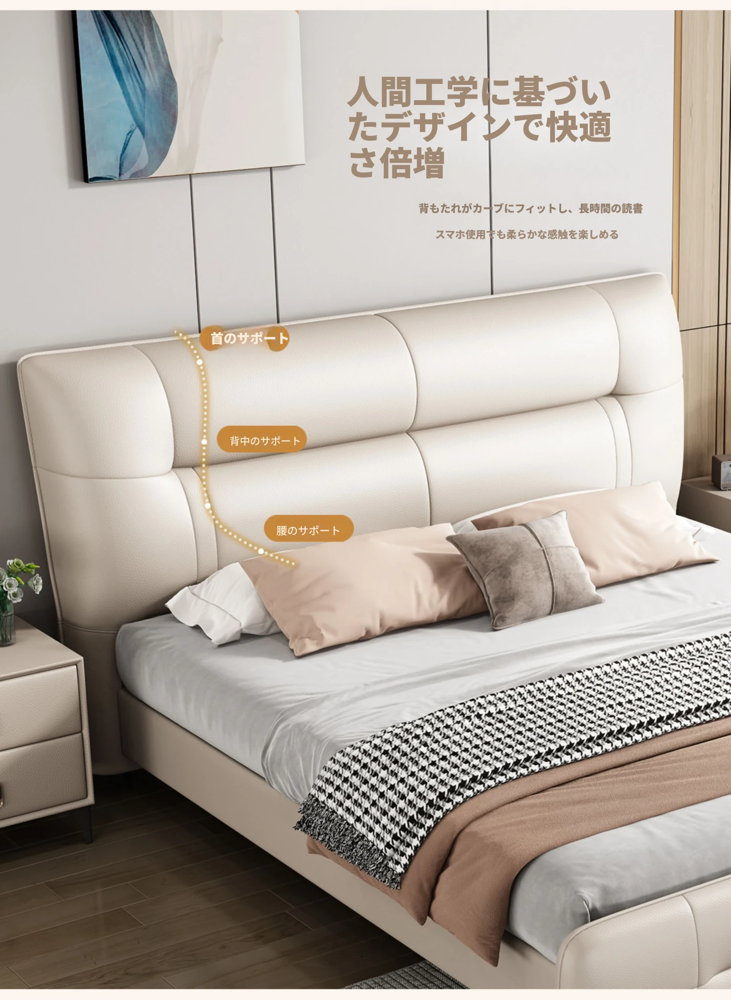 シングルベッド+ナイトテーブル2台{ナディファン本革+ラテックスヘッドボード}