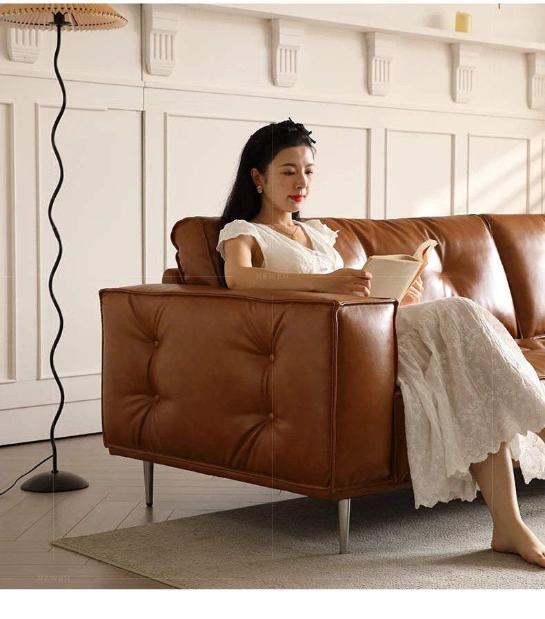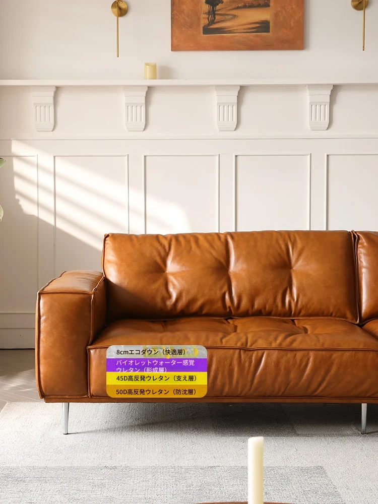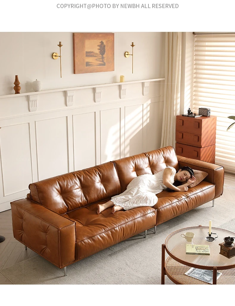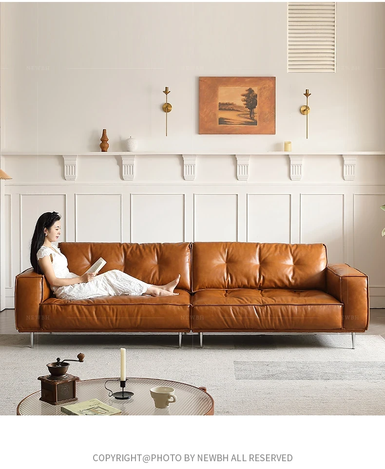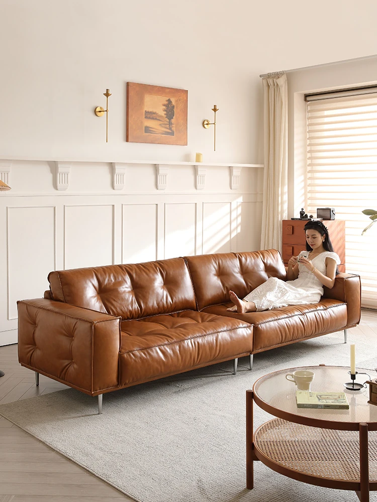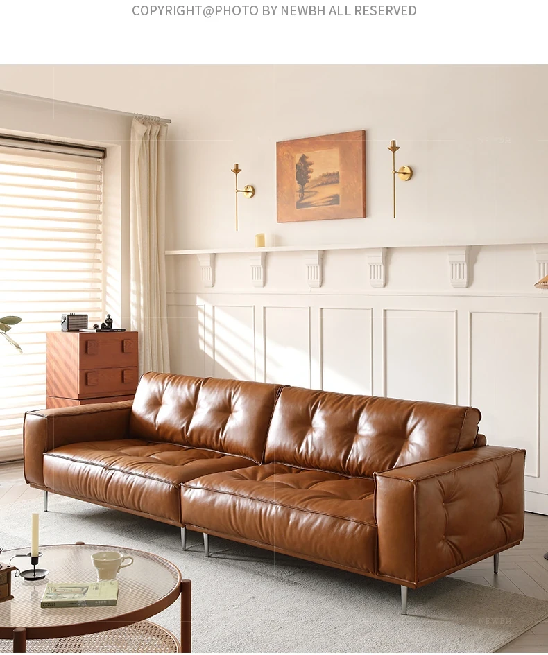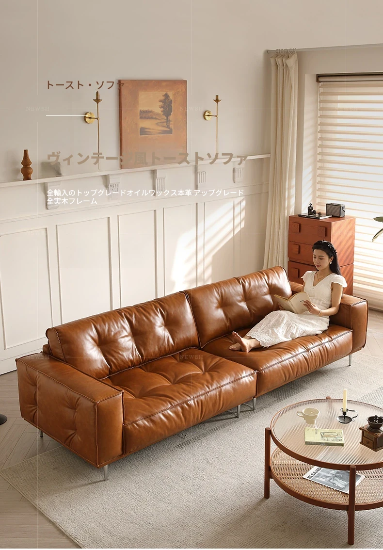 本格派デザインの真皮トーストソファ - 中古風のリビングにぴったり!大小どちらの部屋にも対応、全頭層オイルワックスレザー使用。高級感溢れるスタイルで、あなたの空間を格上げします!