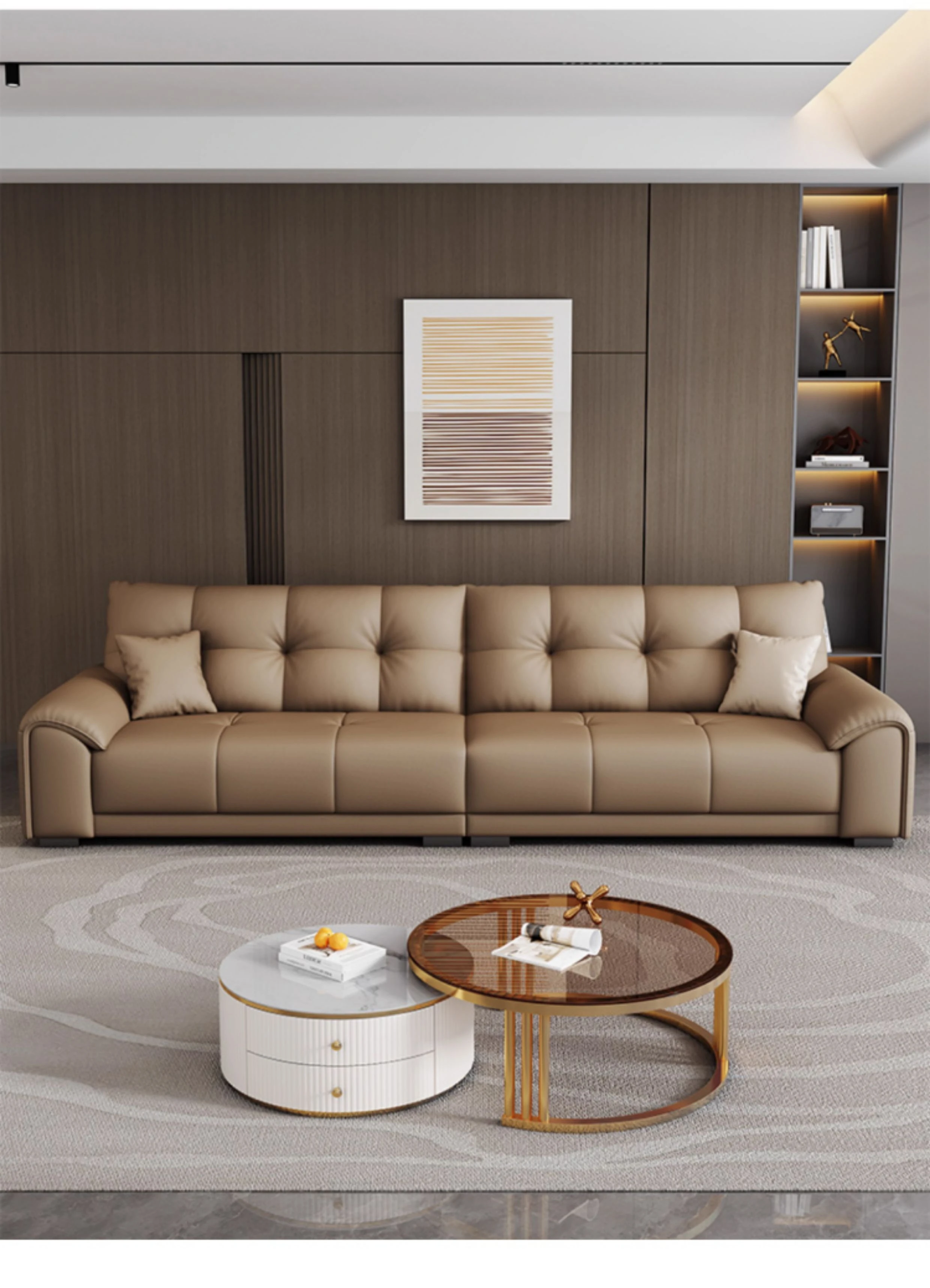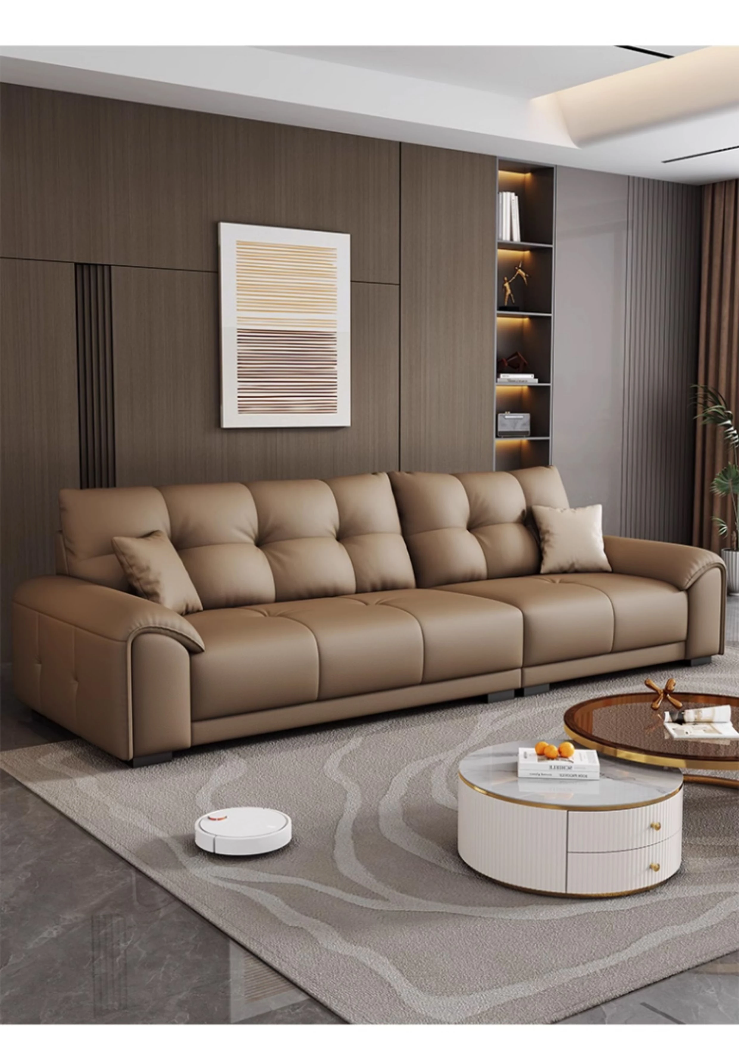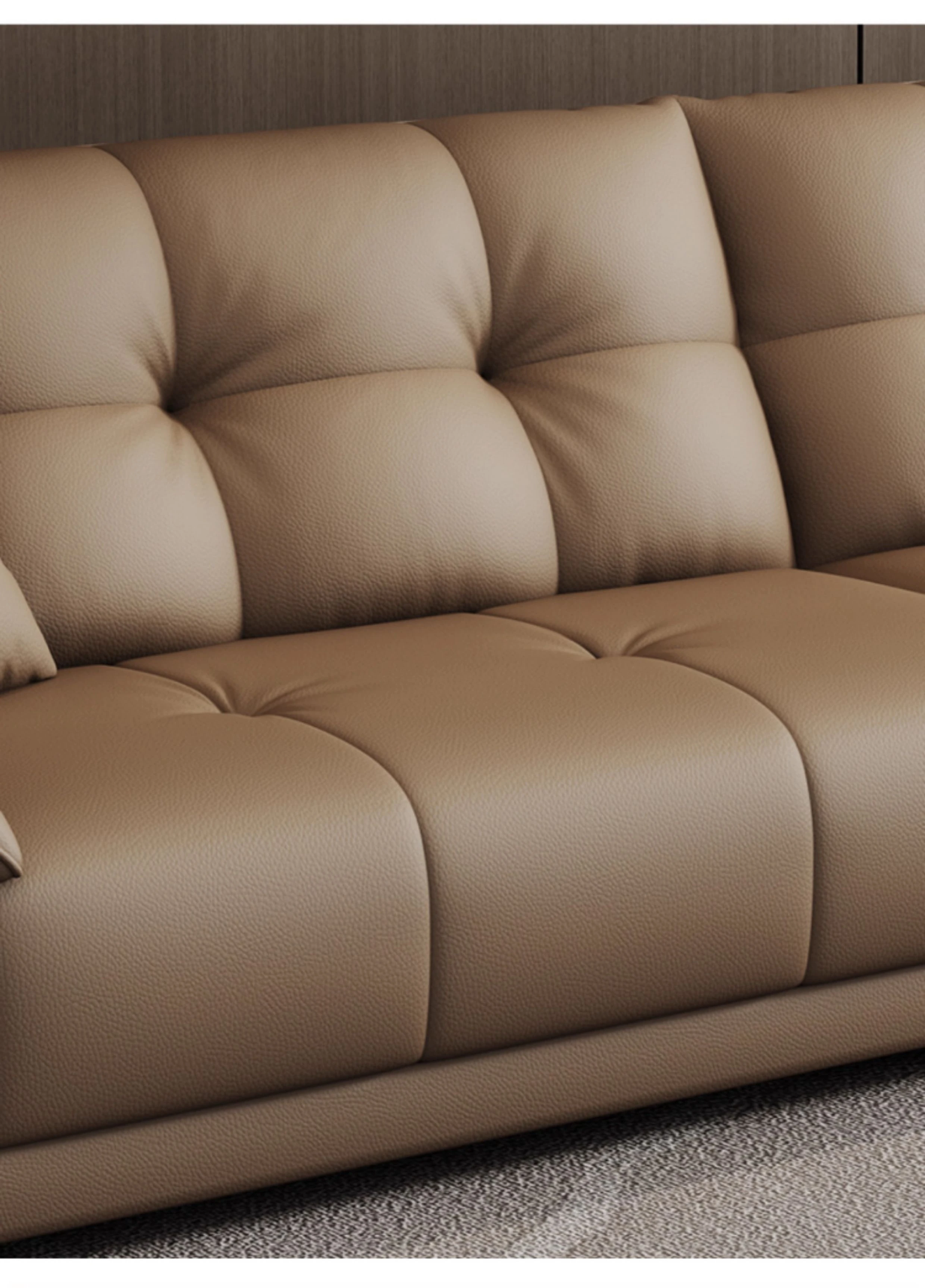 粤佳居2025年新作!イタリアンミニマルデザインの小型リビング向け、本革使用のモダンでシンプルなキャットクローソファ。おしゃれで快適な空間を演出し、ペットも安心して使える!