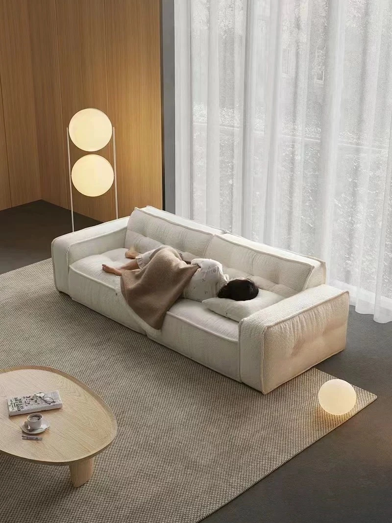 イタリアン・トーストスタイルのモダンミニマリストソファ、和の侘び寂びとクリーミーなレトロ感を融合した豆腐ブロックデザイン。リビングをおしゃれに彩る、直線的なフォルムが魅力の布製ソファ。