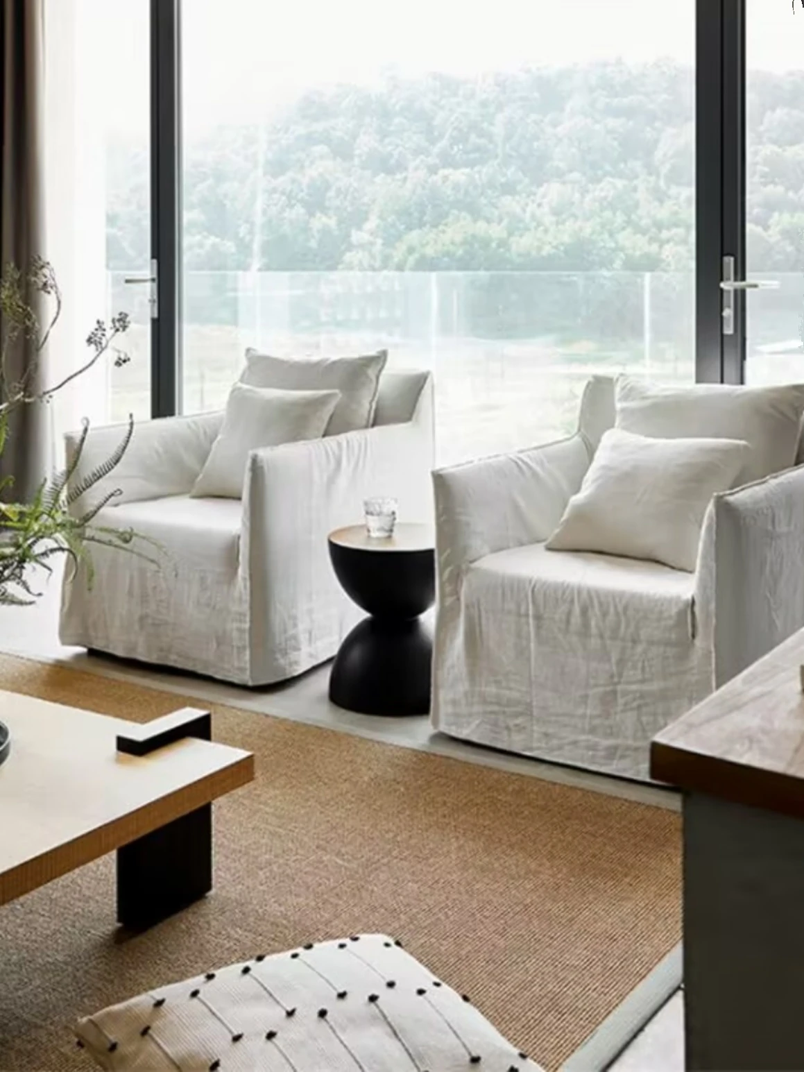 和風侘寂スタイルの民宿向けシングルソファー|北欧ミニマルデザイン|洗えるリネンカバー付き|快適さと美しさを兼ね備えた究極のリラックス空間をお届けします。