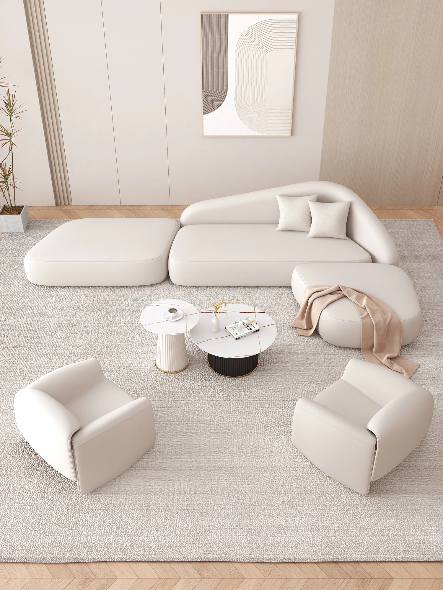 シンプルなクリーム風のユニークな形状のソファ|広々としたリビングやホテルに最適!デザイナーが手掛けた美容院の休憩エリアや受付にもぴったり。お客様を惹きつける洗練されたスタイル!