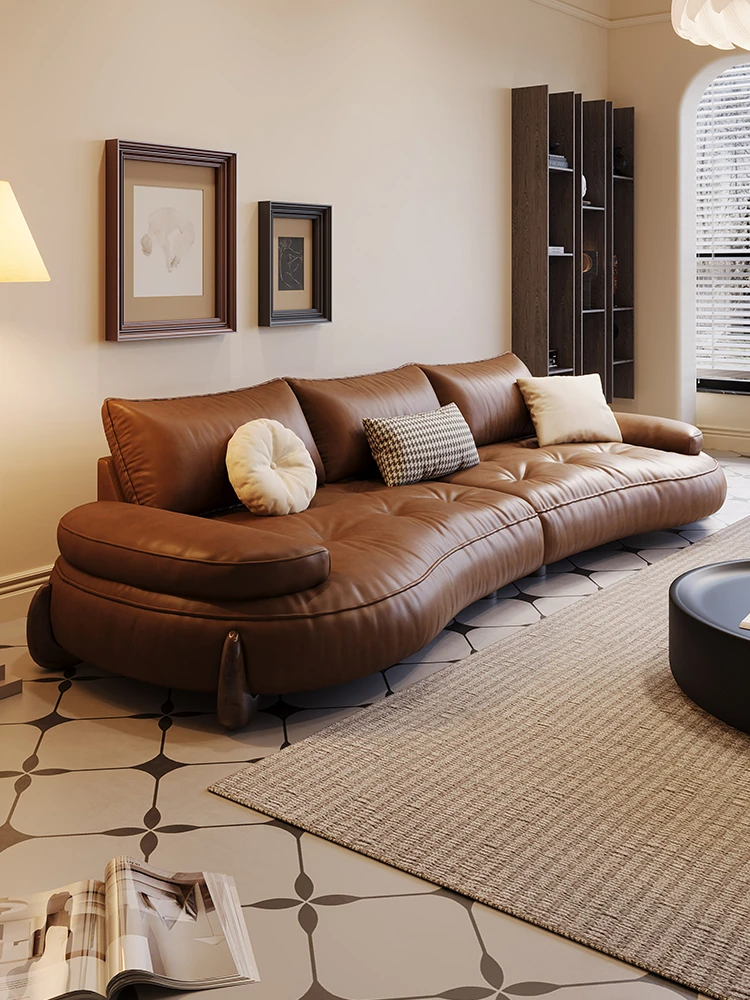 French Vintage Style Top-Grain Leather Sofa - 2025 New Collection in Brown, Perfect for Mid-Sized Living Rooms, Designer Edition