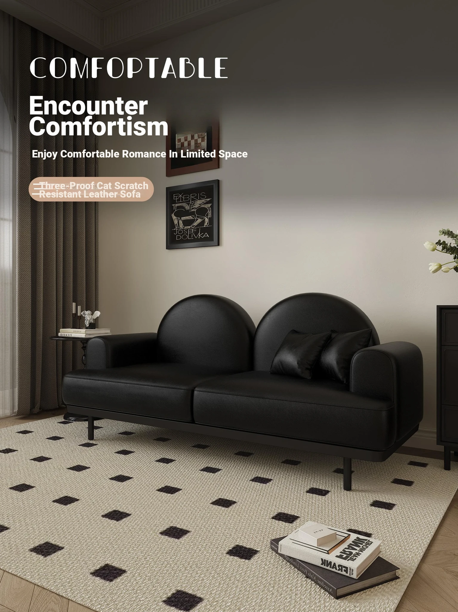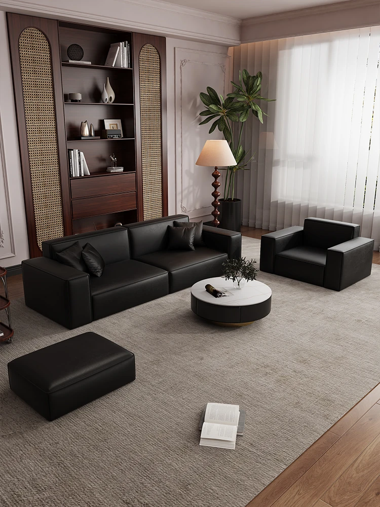 Italian Minimalist Leather Sofa - Retro Design for Living Room, Ideal for Small to Large Spaces, Black Luxury Style for Office Reception and Lounge Areas.