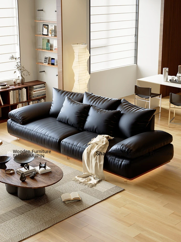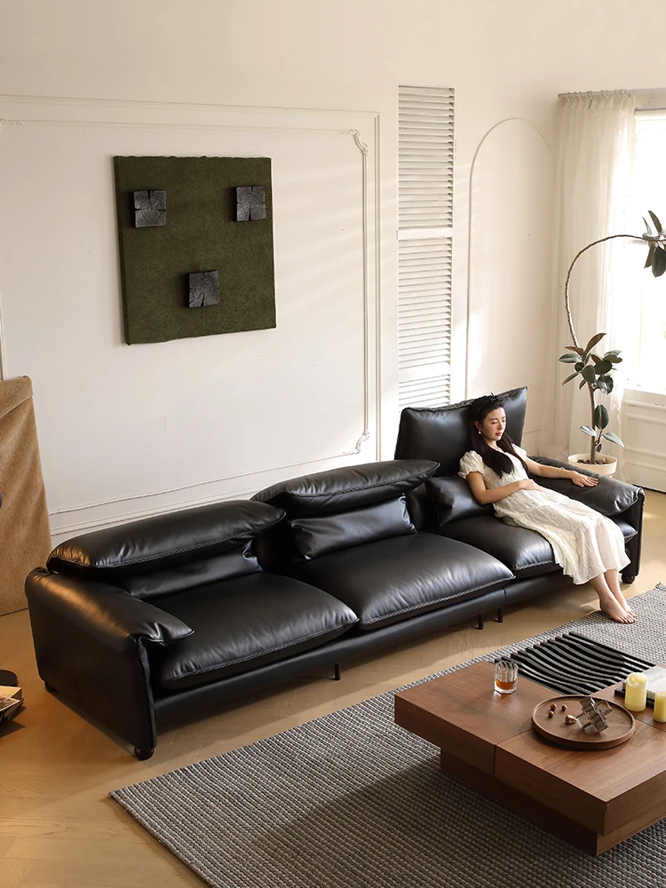 Italian Minimalist Top-Grain Leather Sofa with Elephant Ear Design - Vintage Black Real Leather Couch for Your Living Room, Perfect for Modern Homes