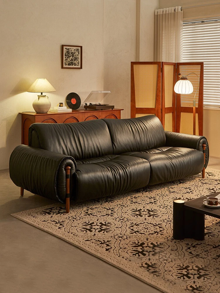 Vintage Leather Straight Sofa - Designer 2025 New Arrival, Featuring Retro Style with Feather Down Top-Grade Cowhide for a Chic Living Room Upgrade.
