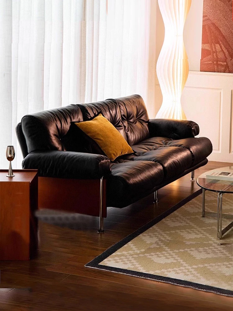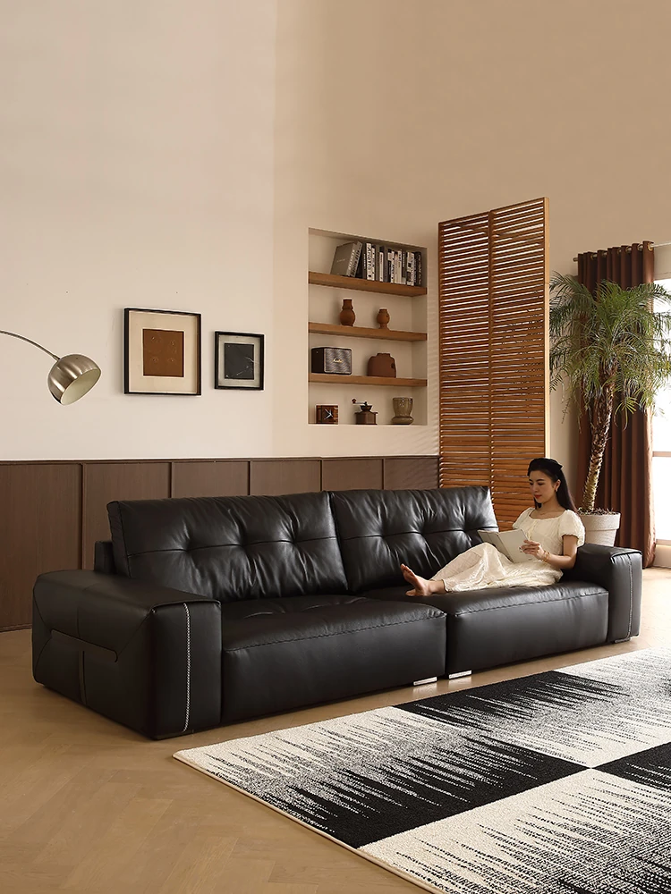 Genuine Full-Grain Leather Sofa - French Vintage Style, Modern Minimalist Design, Elegant Black Tofu Block Sofa for Your Living Room