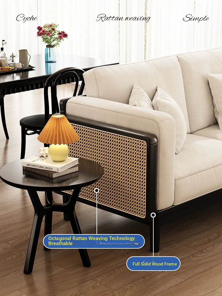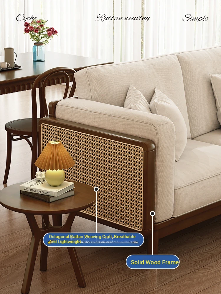 Solid Wood Sofa in Walnut Color - Rattan Weave Upholstery, Vintage Nordic Style for Modern Chinese Living Room, Perfect for Guesthouses and Cozy Spaces.